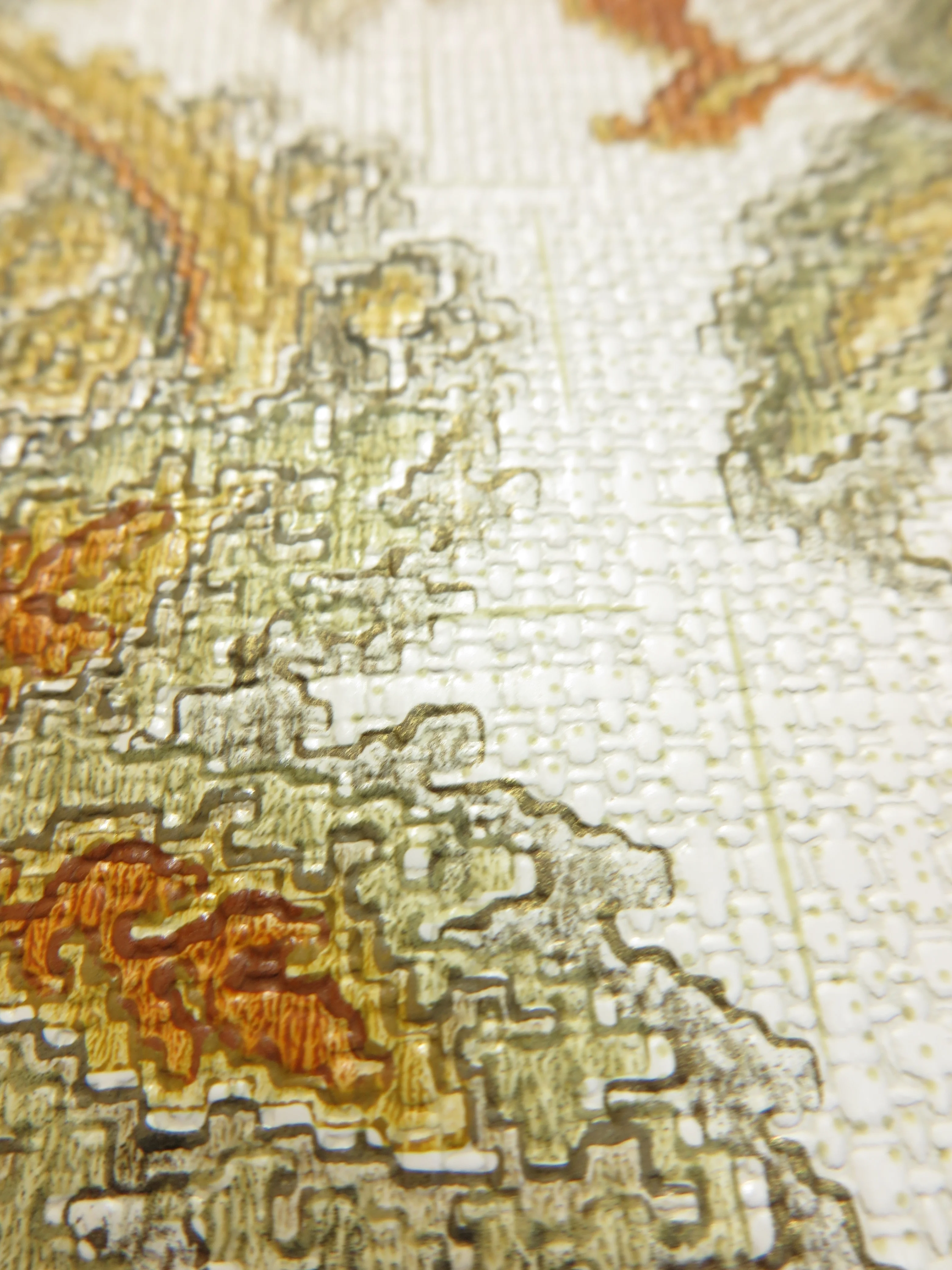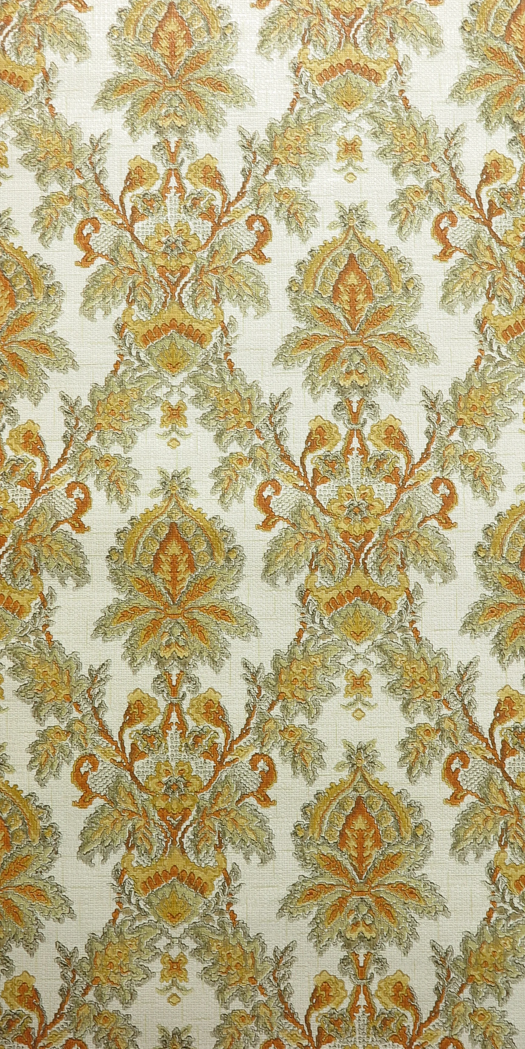 Baroque original vintage wallpaper in brown, ochre and olive green on cream white
