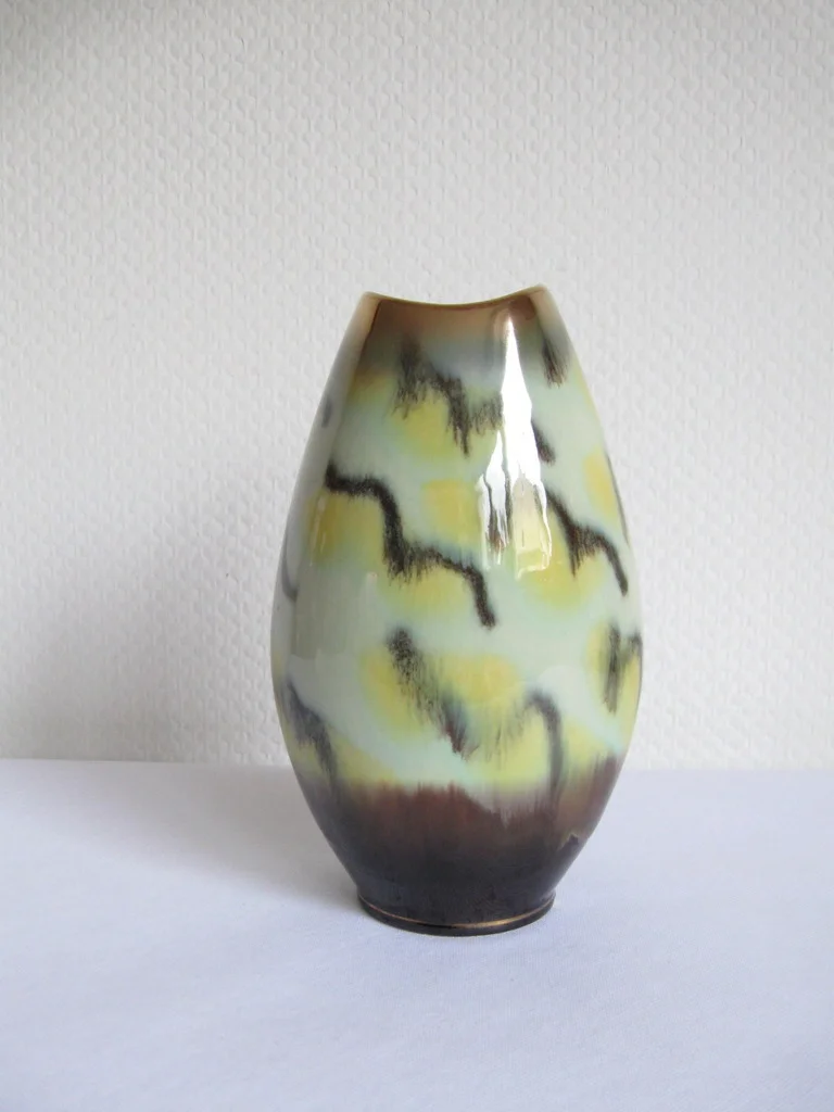 The vase is made of glazed ceramic and captivates by its gold application and the beautiful color gradients.