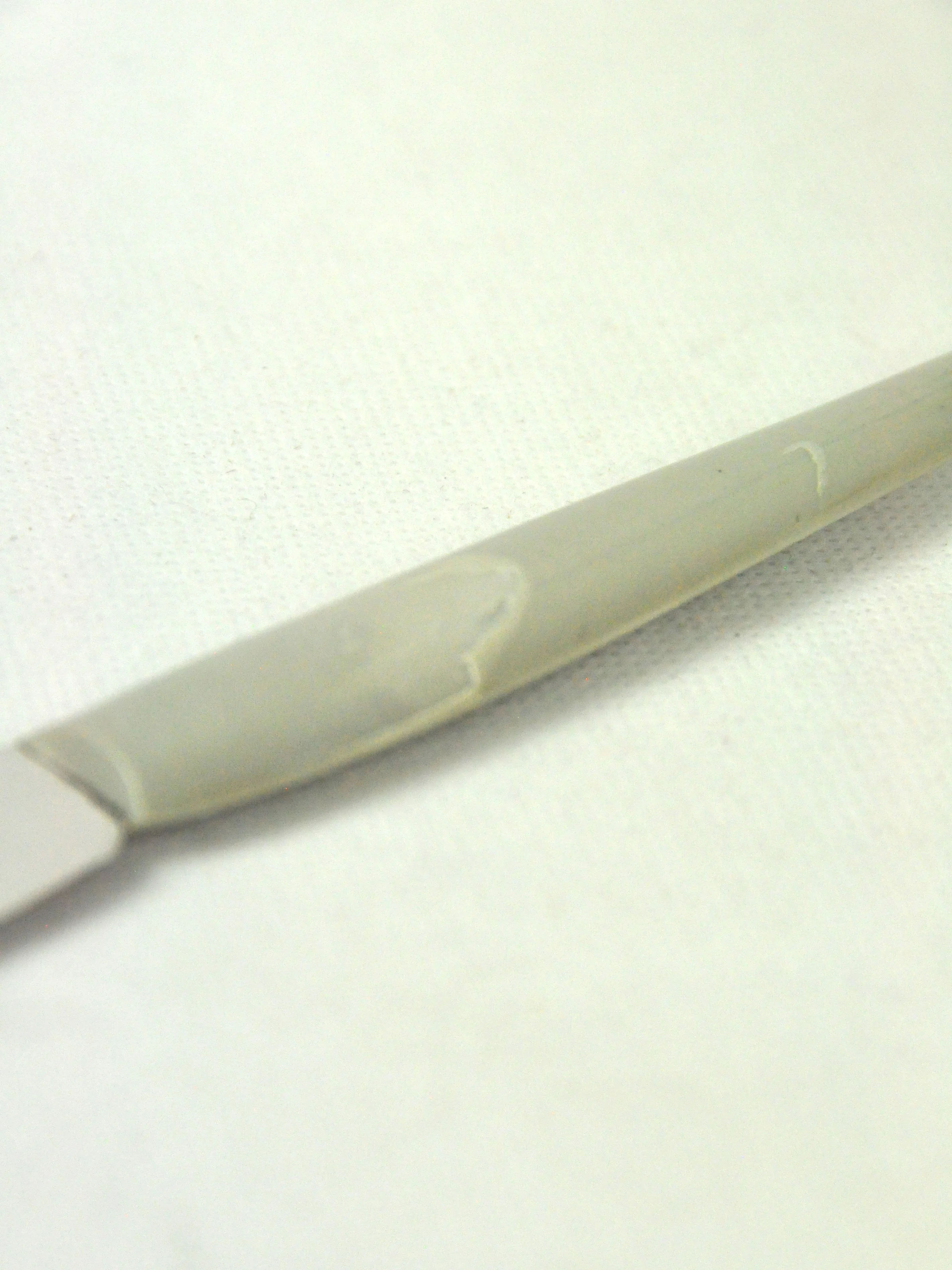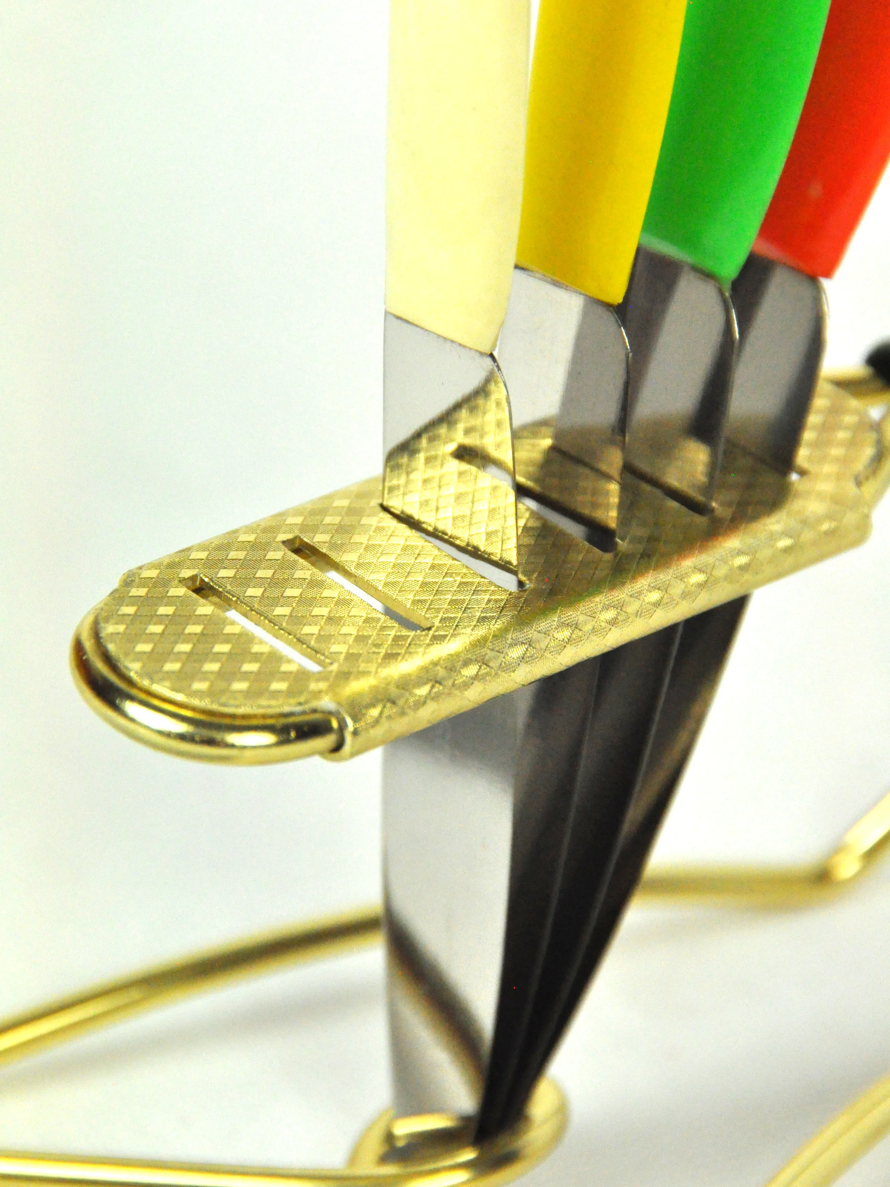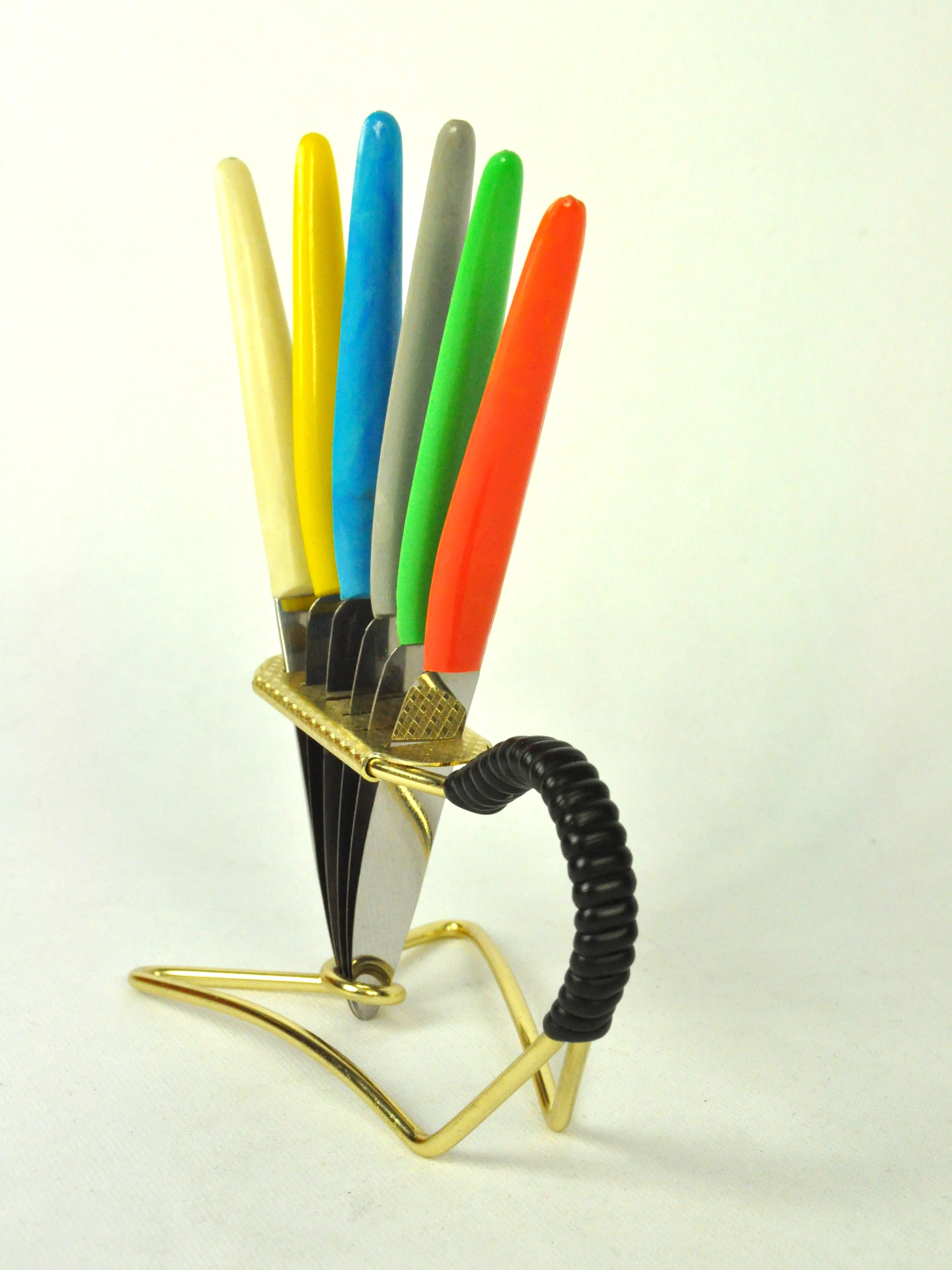 Le set se compose de 6 couteaux en acier inoxydable avec manche en plastique dans de belles couleurs vives et d'un support en laiton avec manche en laiton gainé de noir. La disposition des couteaux est très décorative.