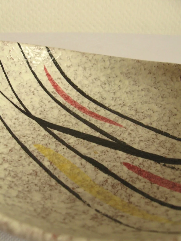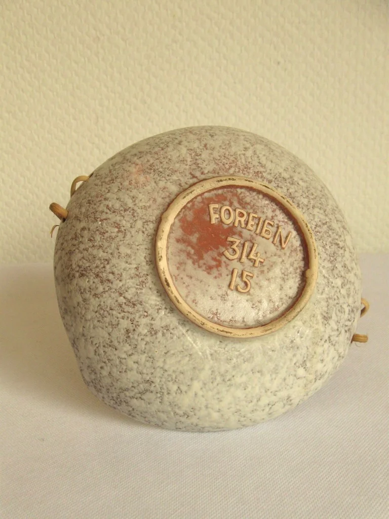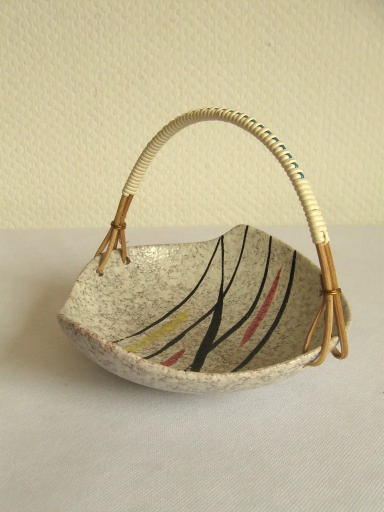 Die Schale ist aus Keramik und hat eine Schrumpfglasur. Der Henkel ist aus Flechtmaterial und mit Kunststoffband umwickelt.