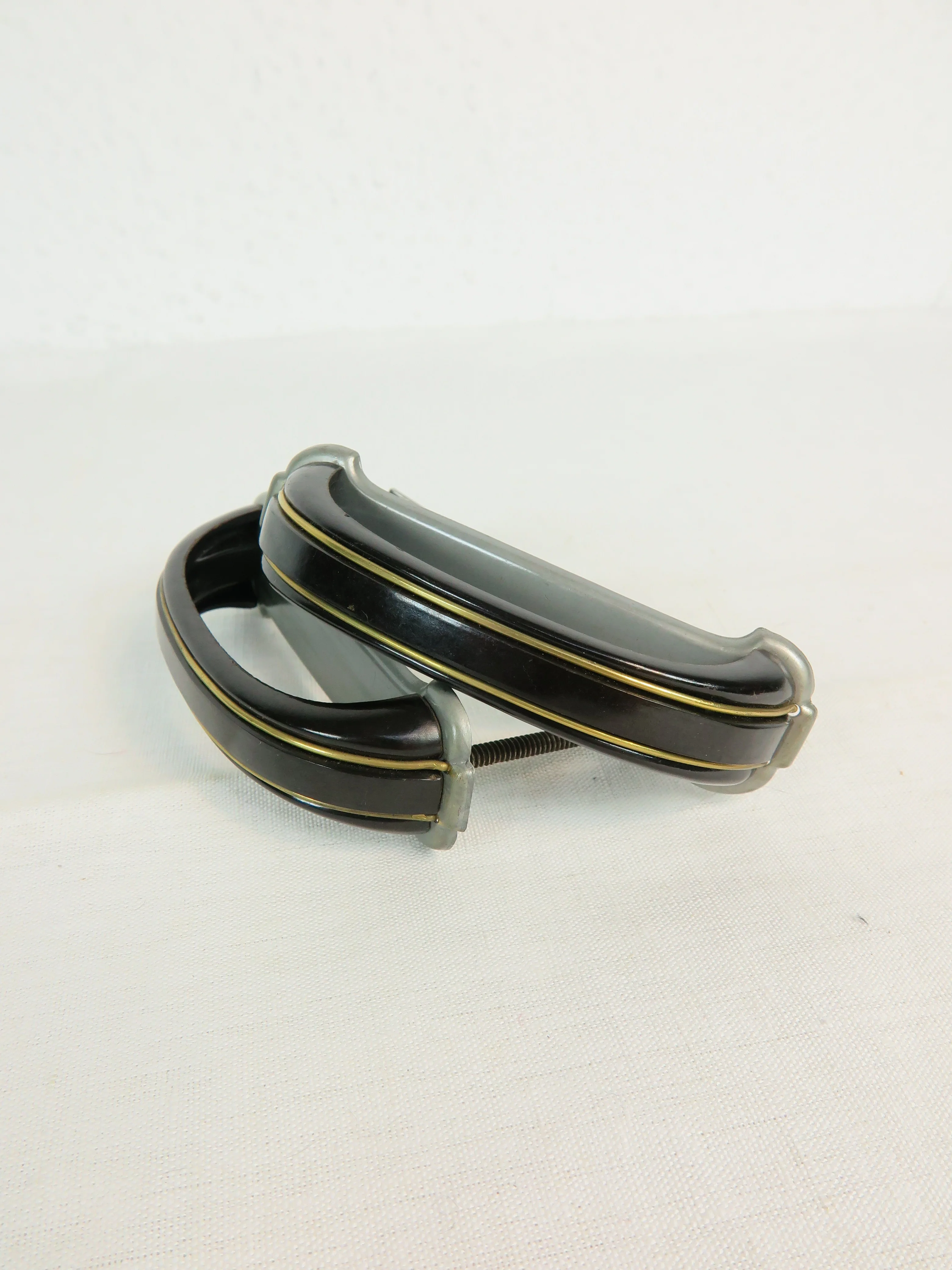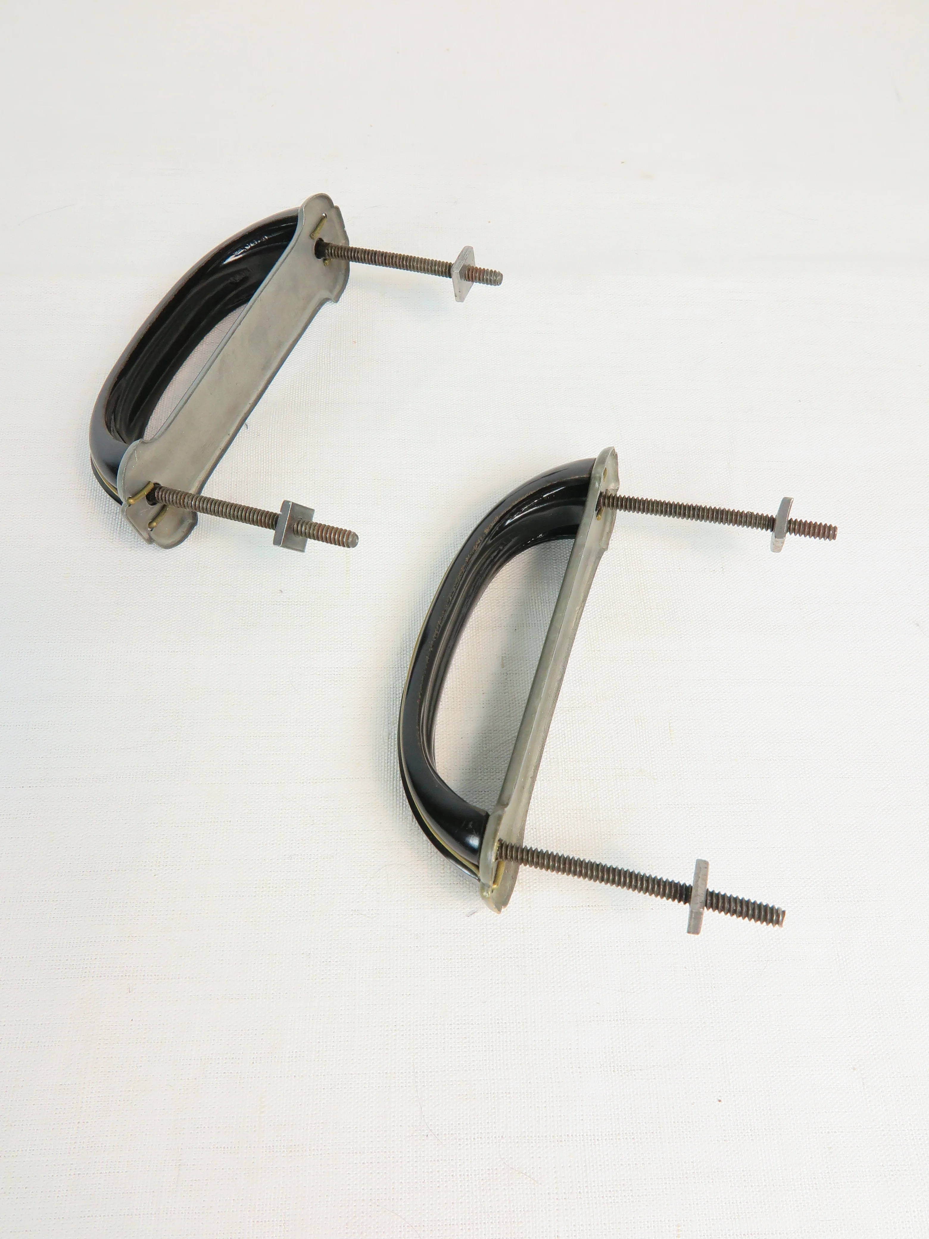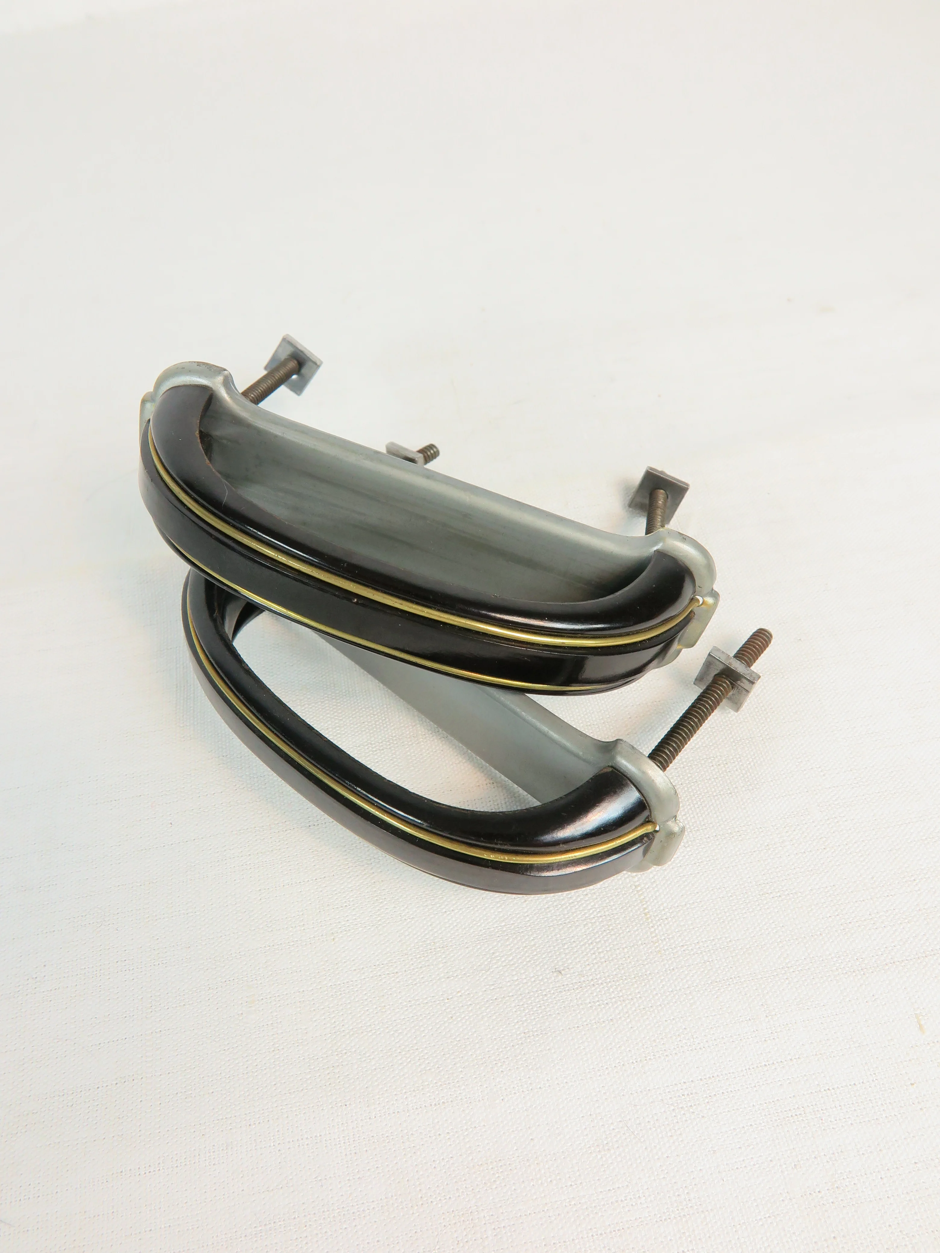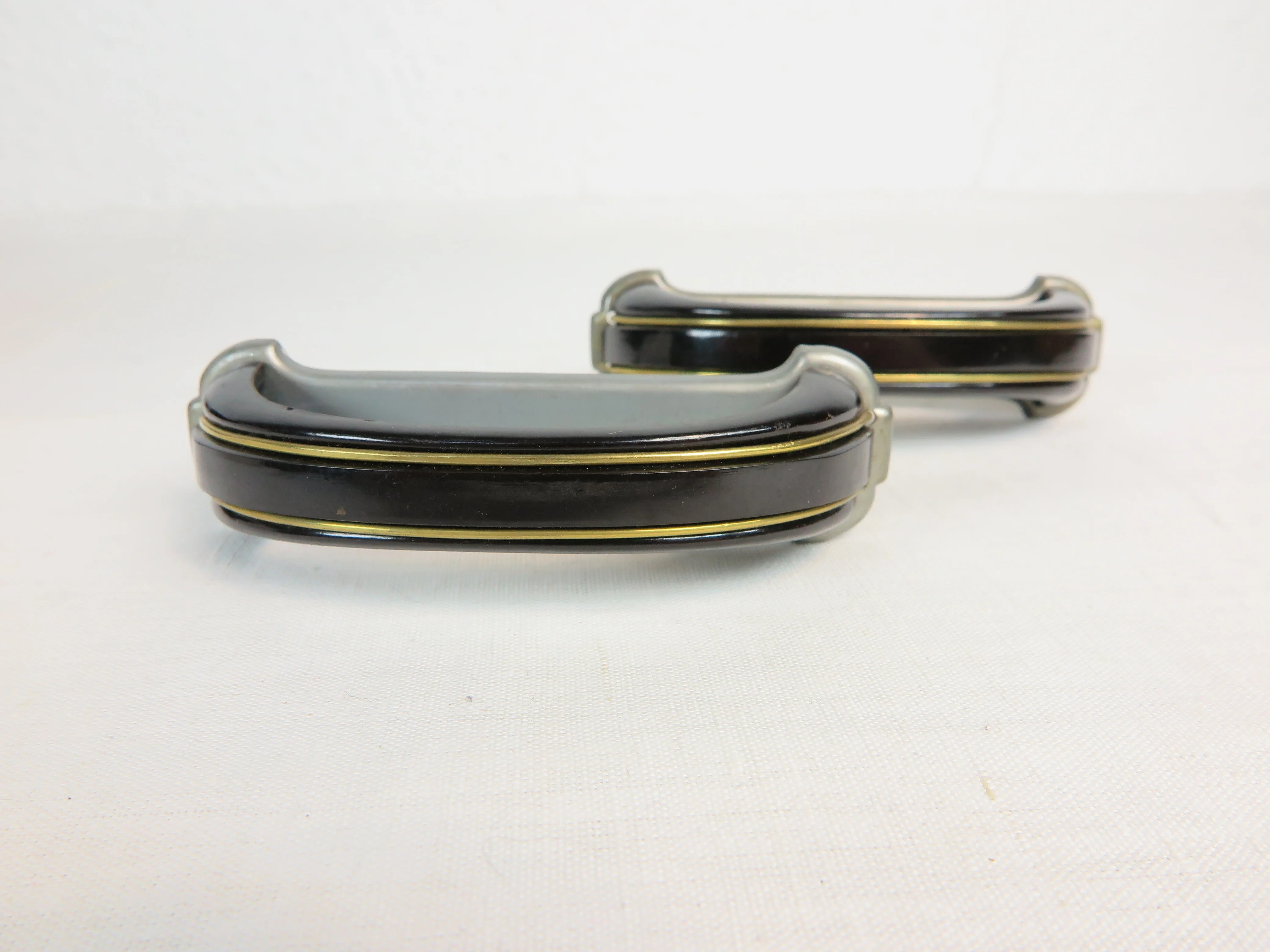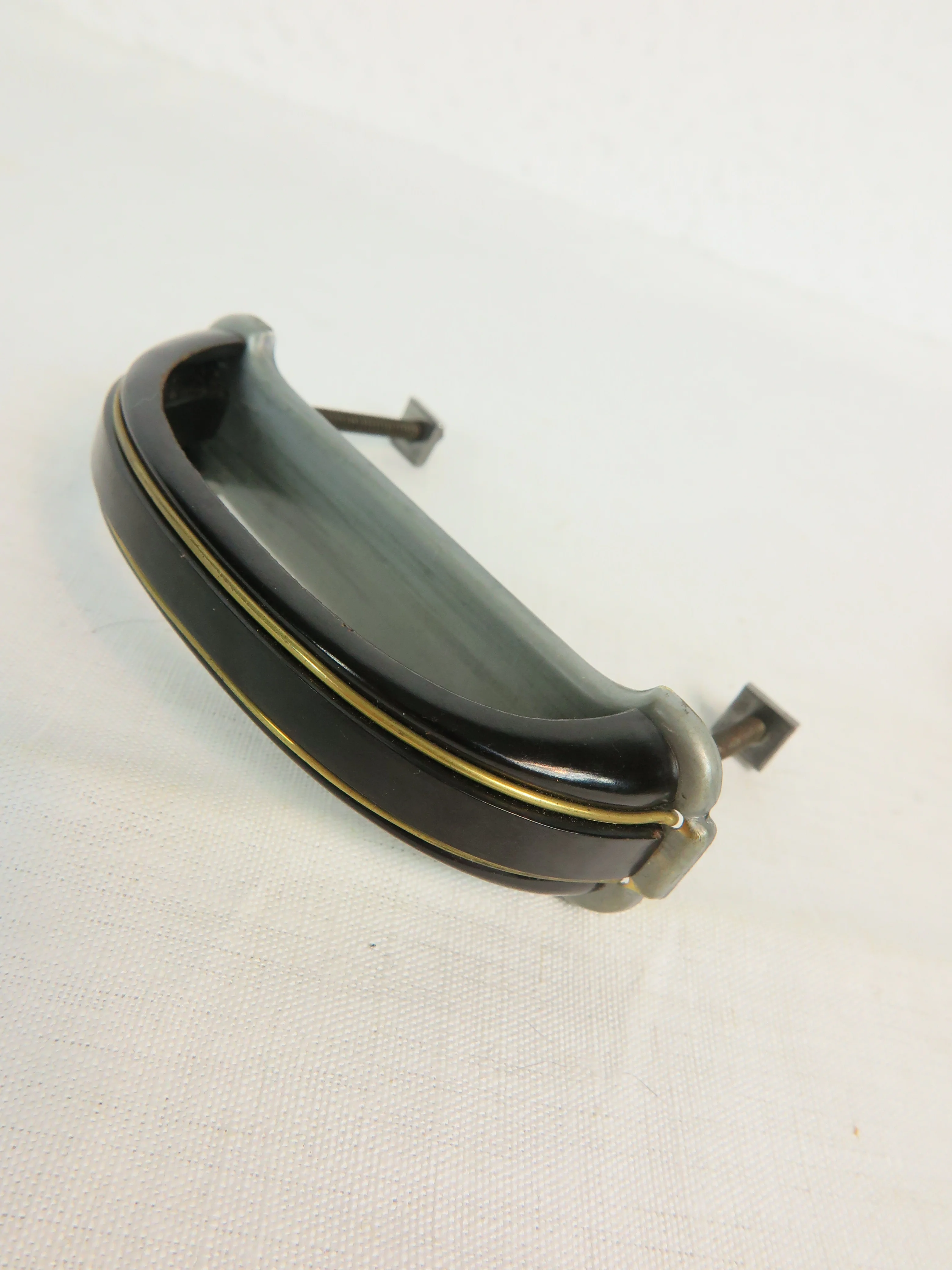 Diese zwei Griffe aus schwarz lackiertem Kunststoff mit Metall sind mit einem feinen eingelegten Messingfaden verziert. Sie haben hinten lange Schrauben mit Muttern. Die Schrauben sind lang genug, um durch breitere Holztüren oder Schubladen zu passen. Sie können entsprechend gekürzt werden.