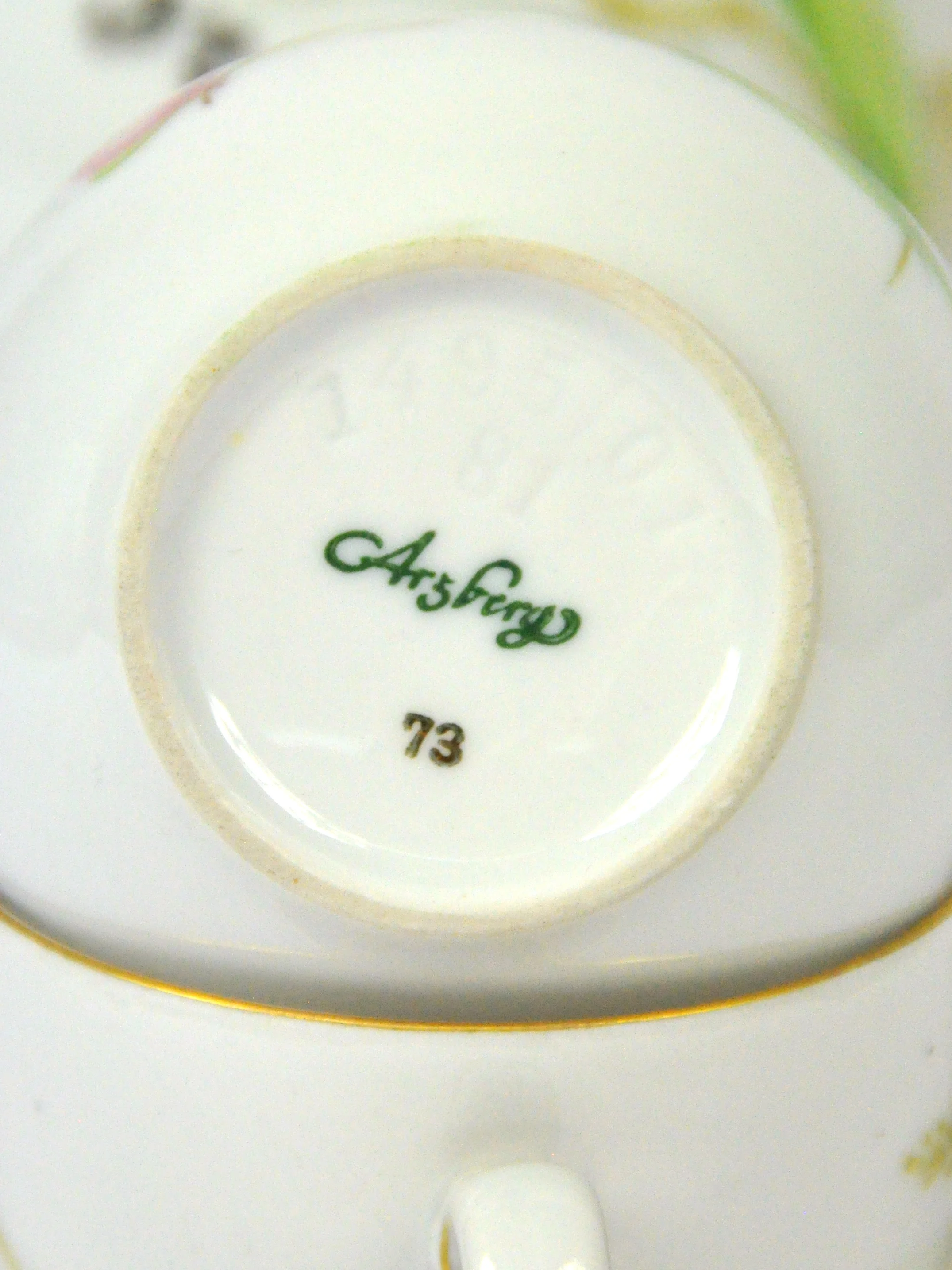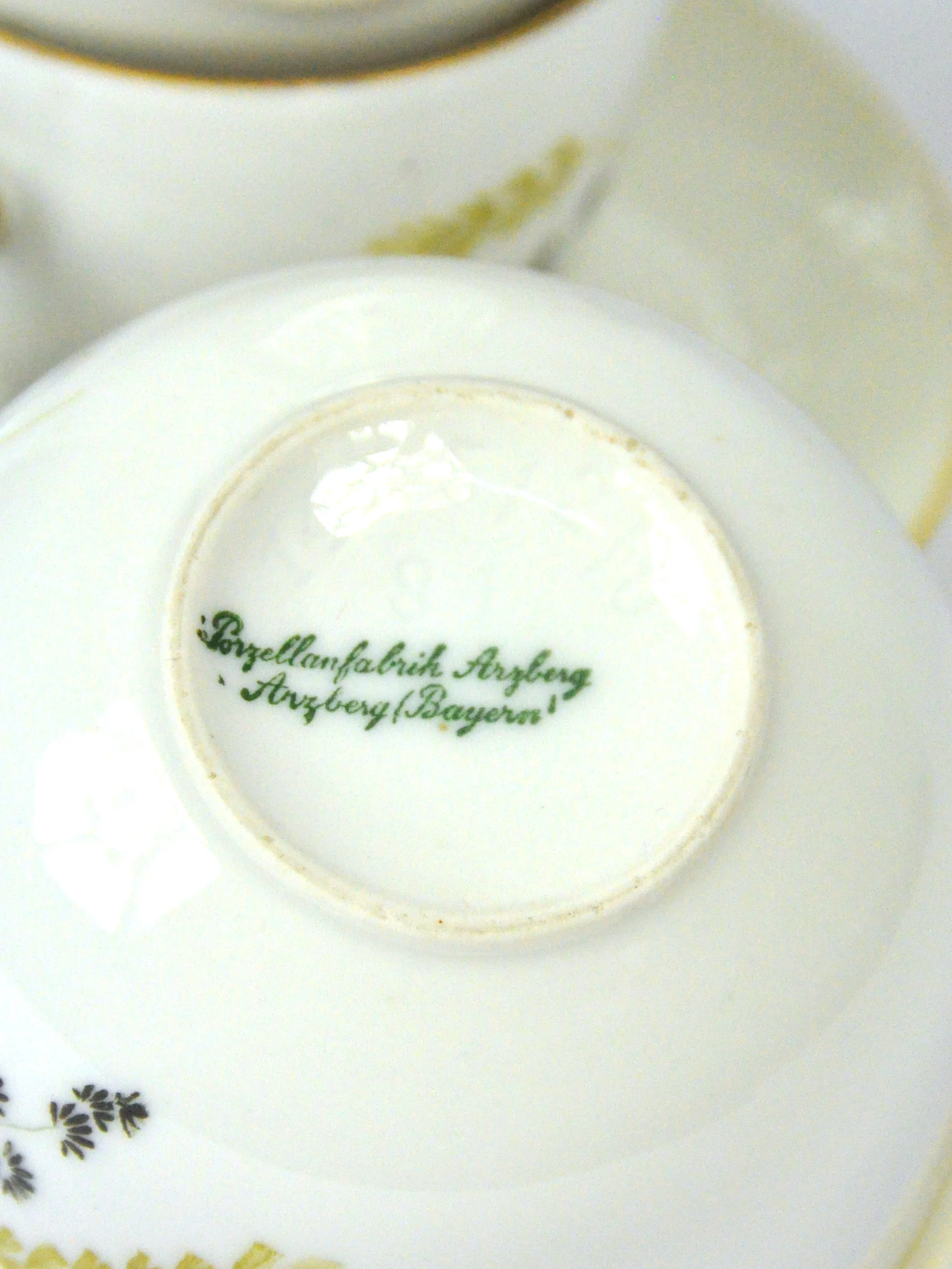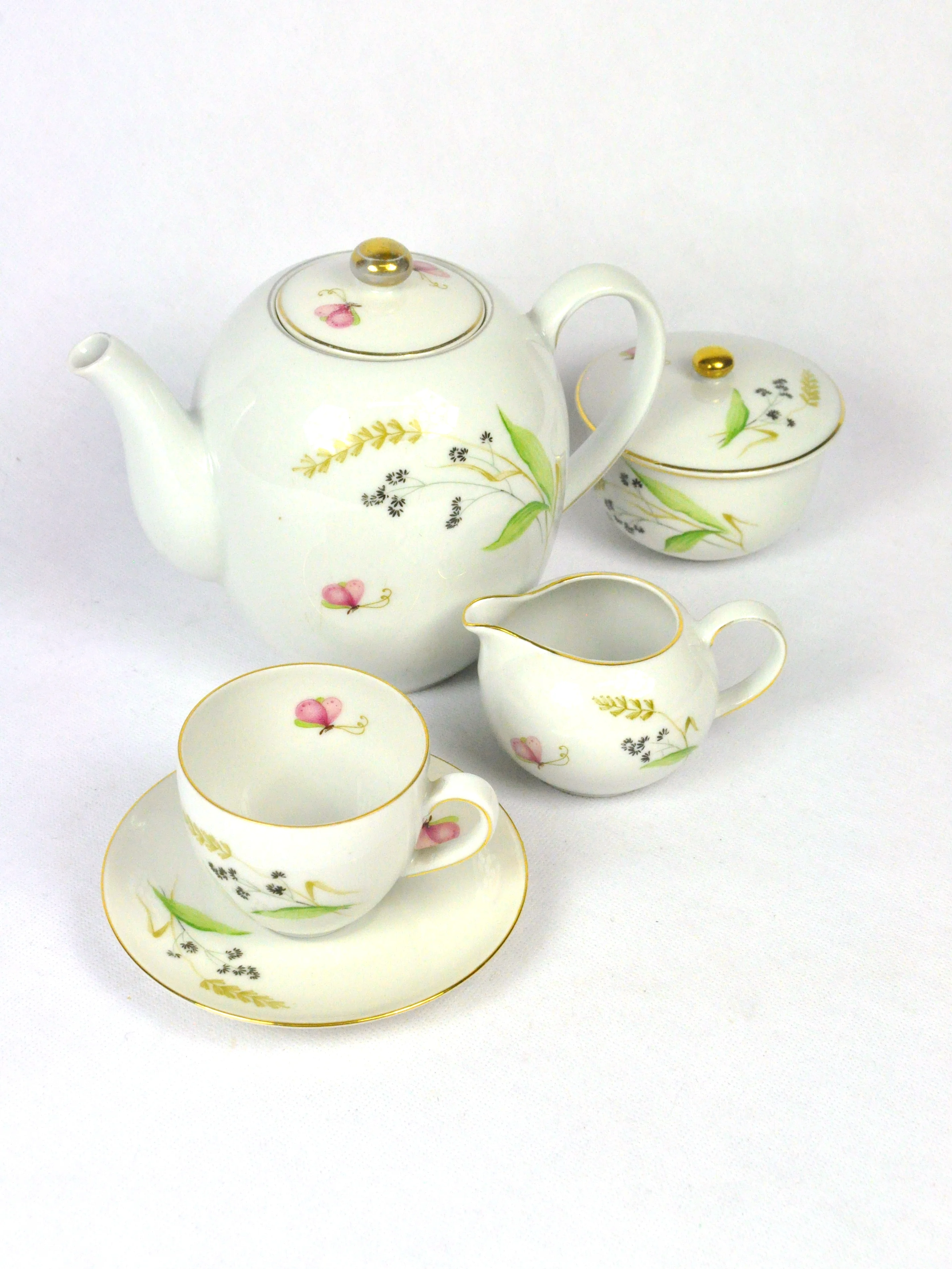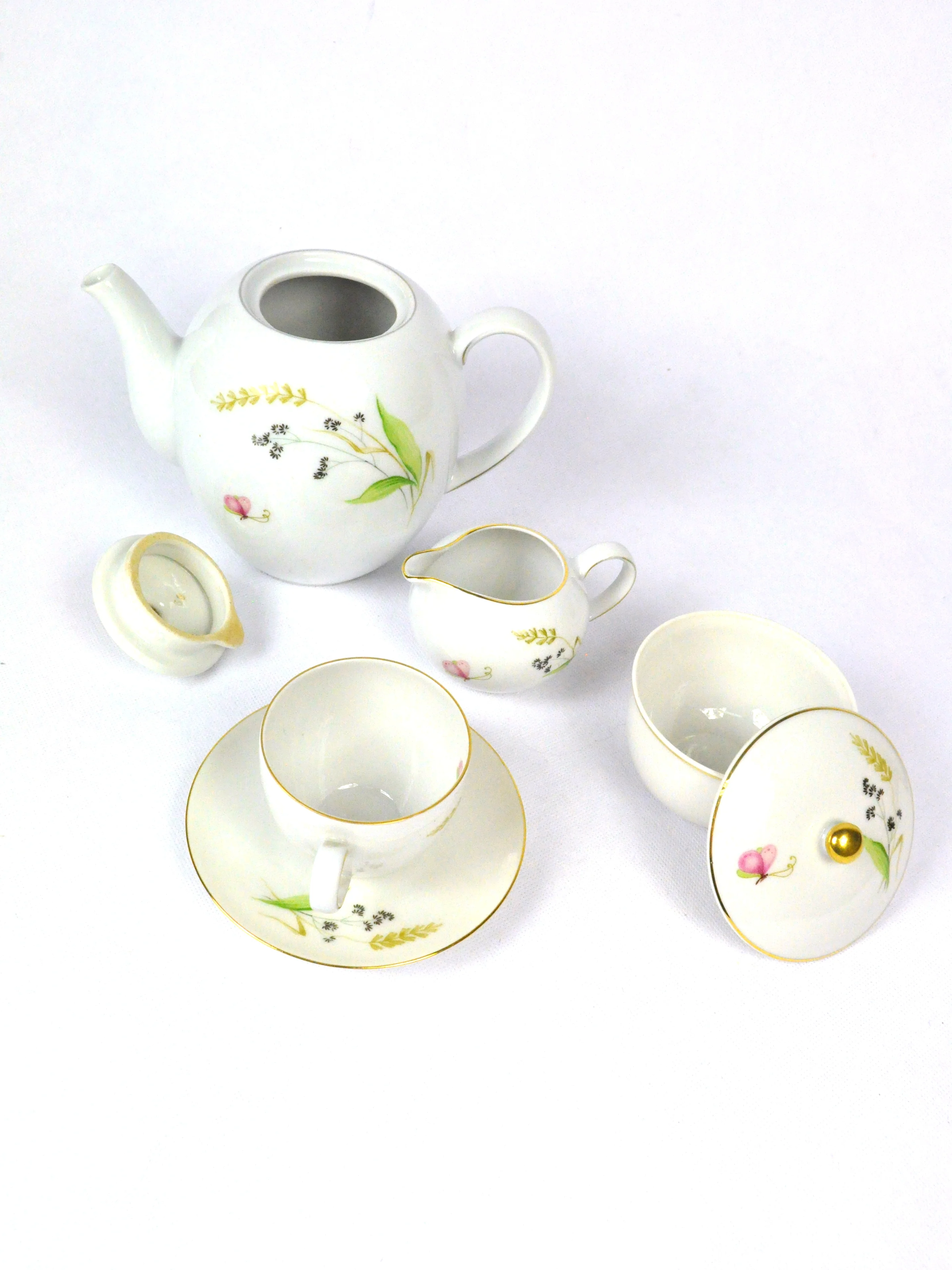 Das Service besteht aus einer Teekanne mit Deckel, einer Tassen, einer Untertassen, einem Milchkännchen und einem Zuckertopf. Alle Teile sind aus Porzellan und hübsch mit einem floralen Motiv verziert.