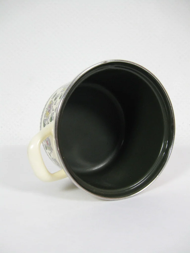 Der Topf ist aus emailliertem Metell und hat einen Kunststoffknauf.