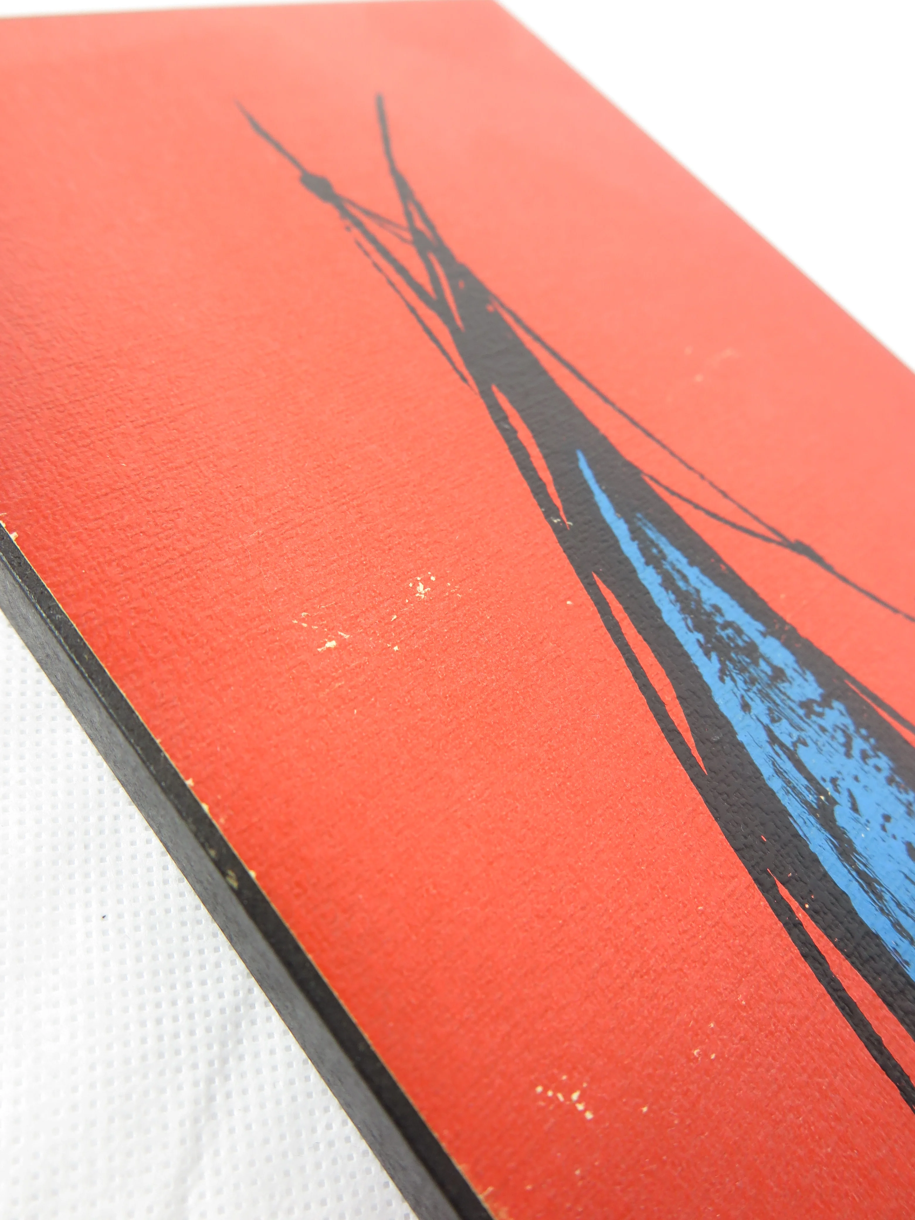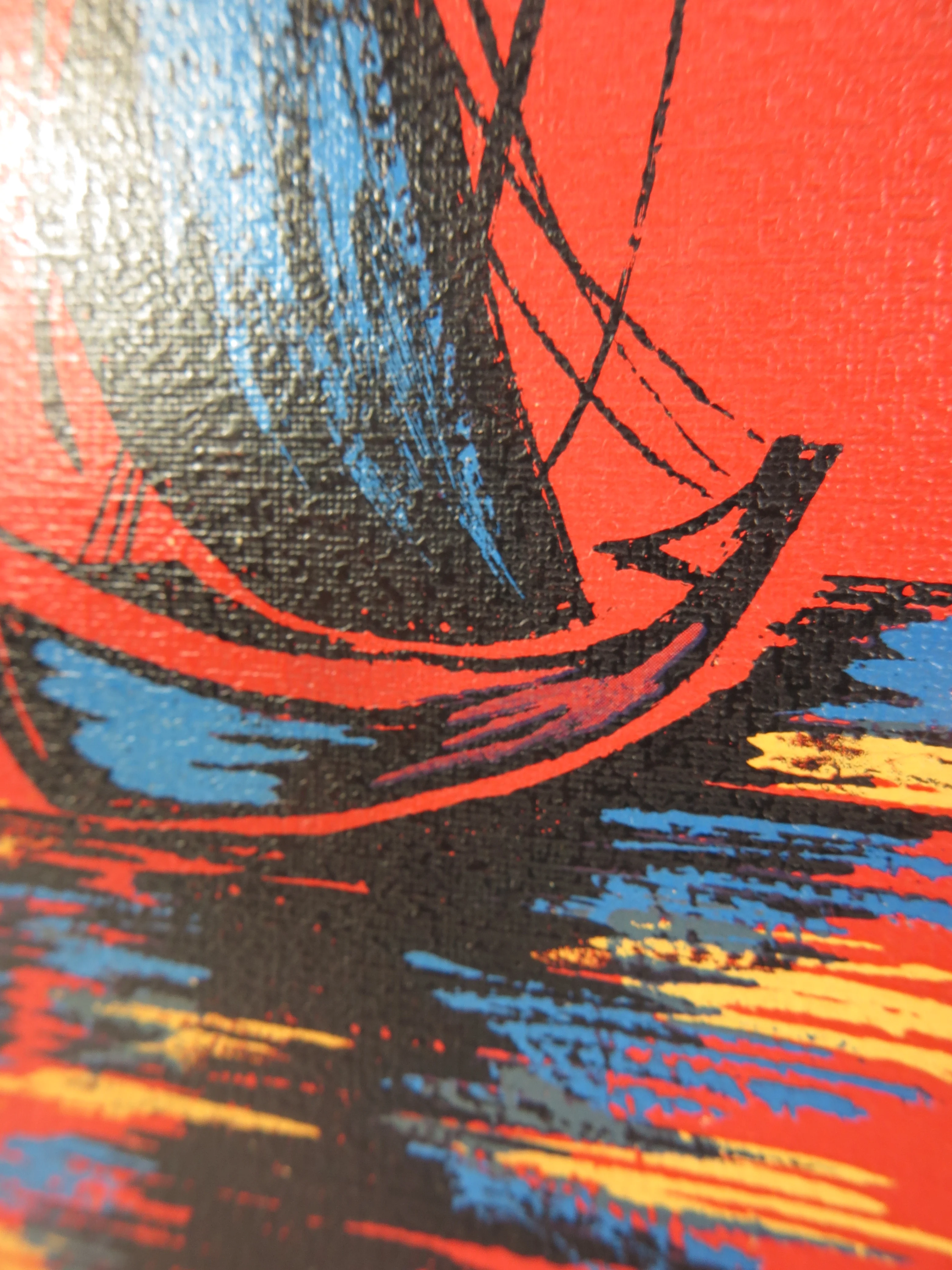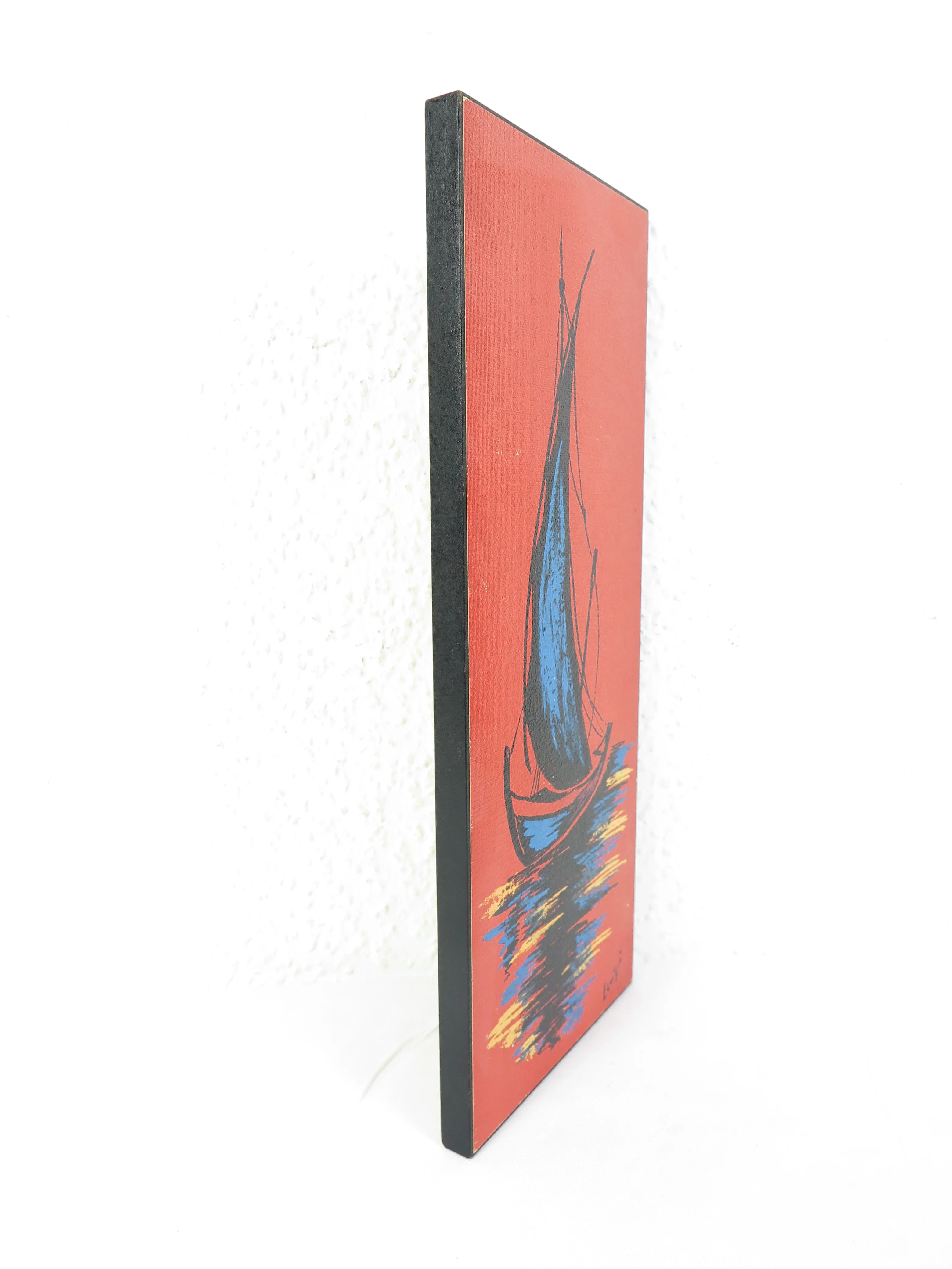 Das Bild zeigt ein elegantes Segelschiff auf einer leuchtenden, rot lackierten Oberfläche. Das handgemalte Motiv besticht durch kräftige Farben, mit einem blauen Segel und Schatten in Schwarz.