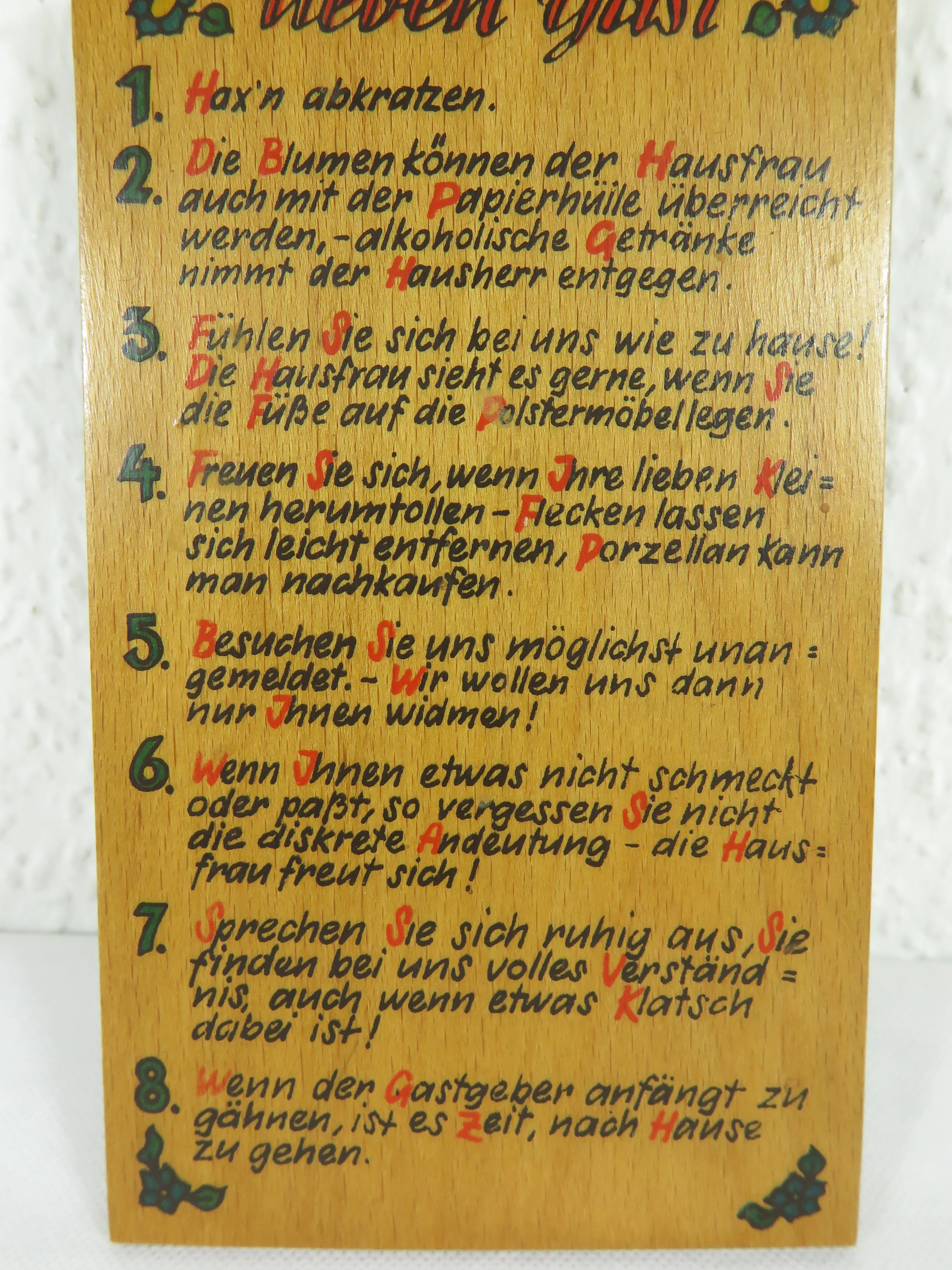 70er Holzschild mit Spruch: 8 Gebote an den lieben Gast