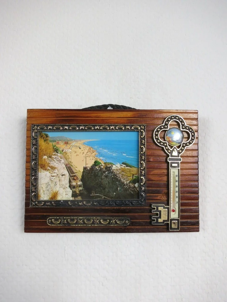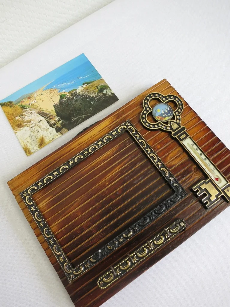 Das Brett besteht aus einer Holzplatte mit aufgesetzten Kunststoffelementen. Dazu gehören Postkartenrahmen, Thermometer und Schlüsselleiste.