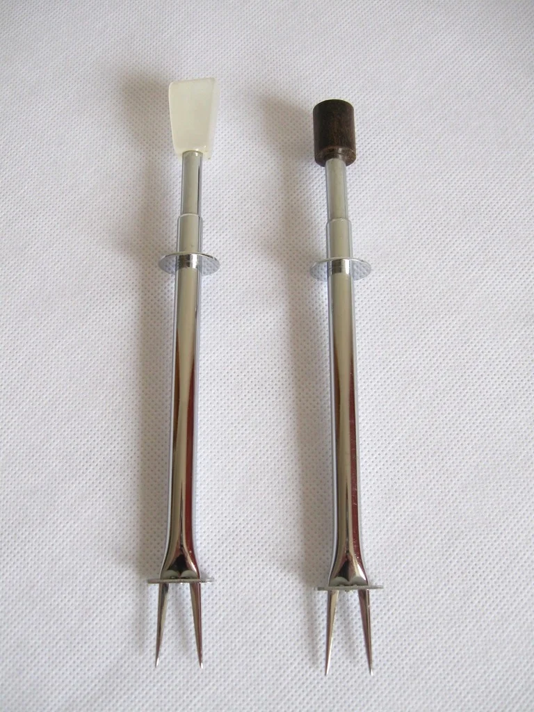 Die Gabeln haben eine Schiebevorrichtung um sich Aufgespießtem zu entledigen.