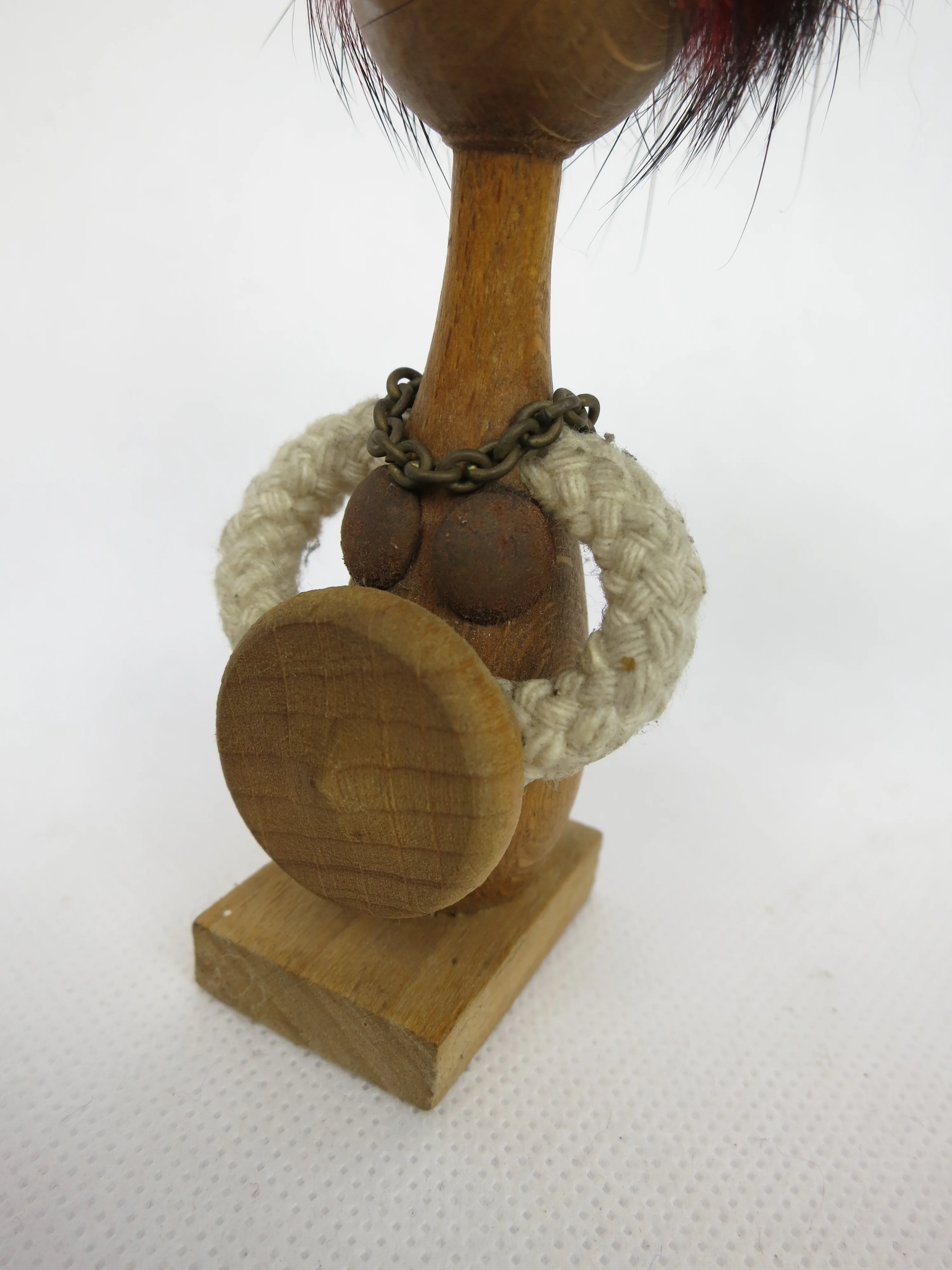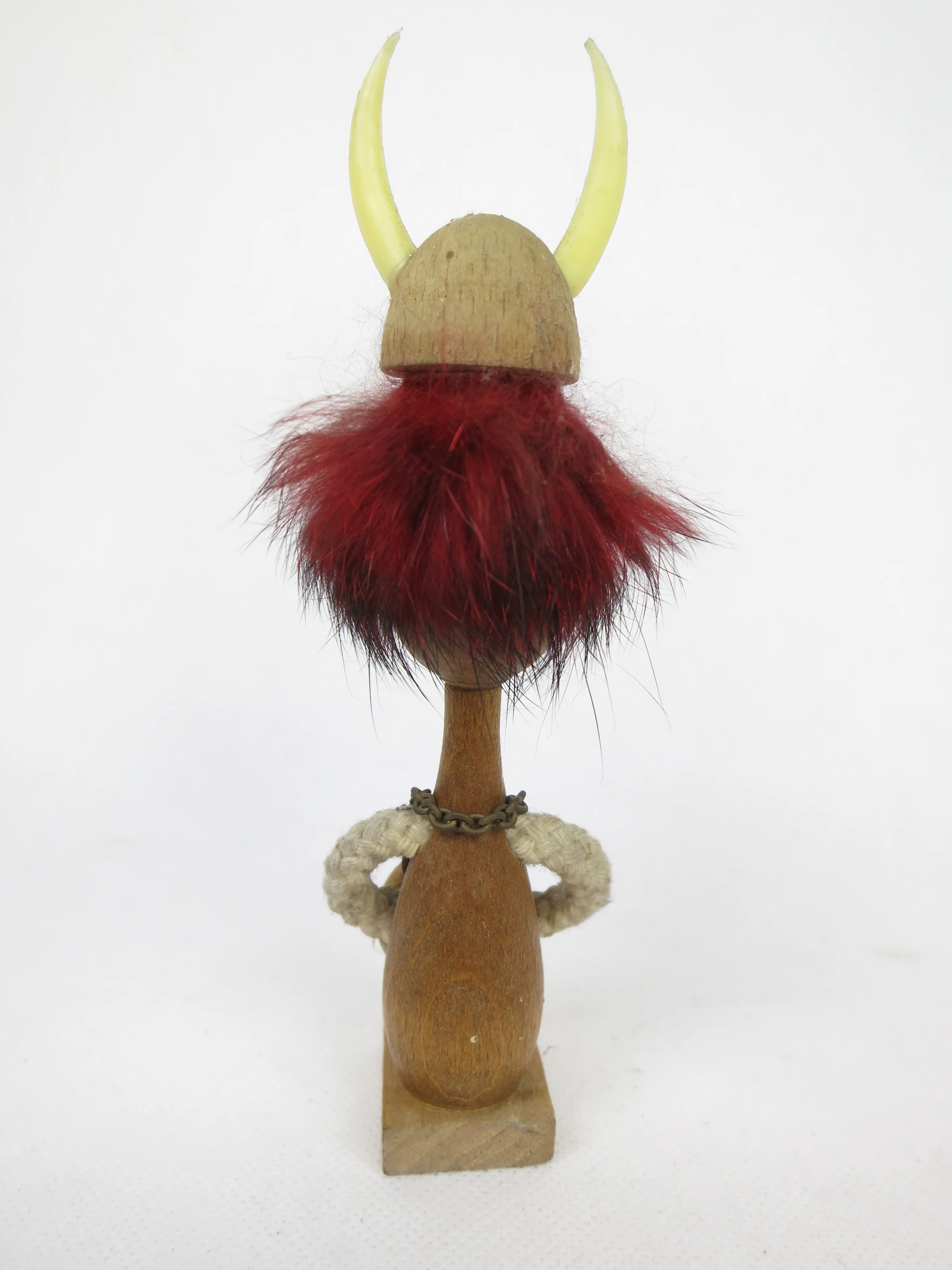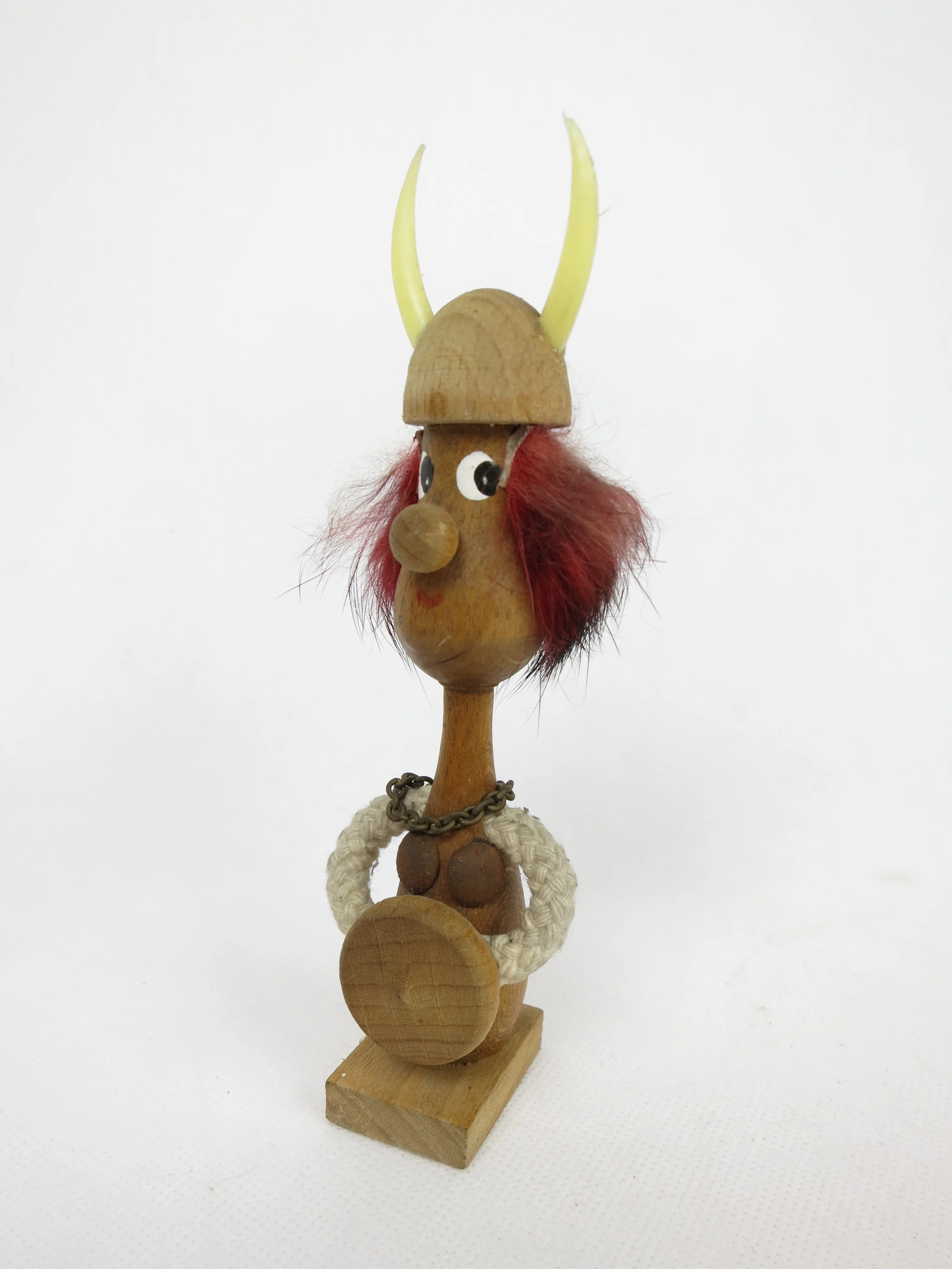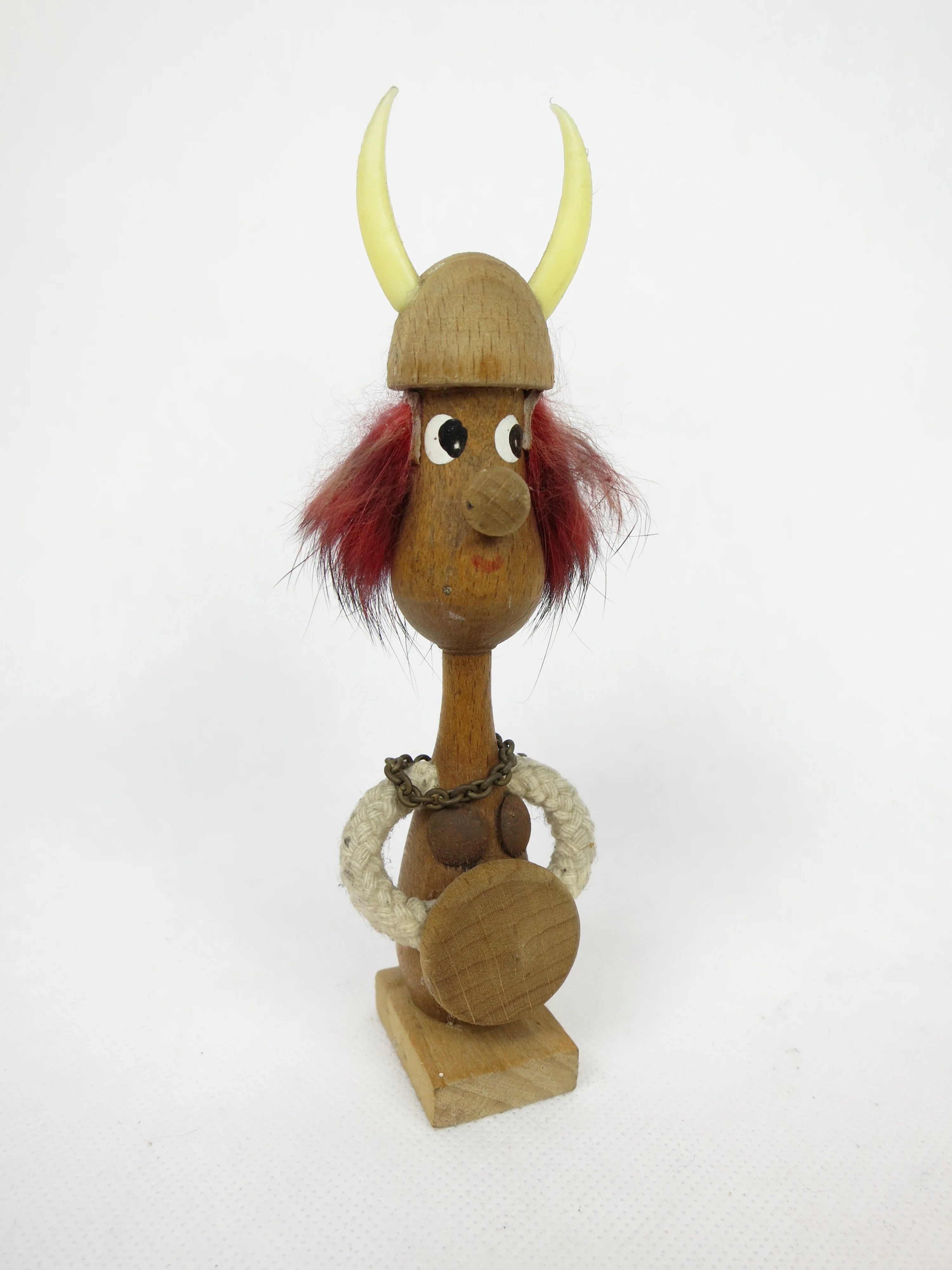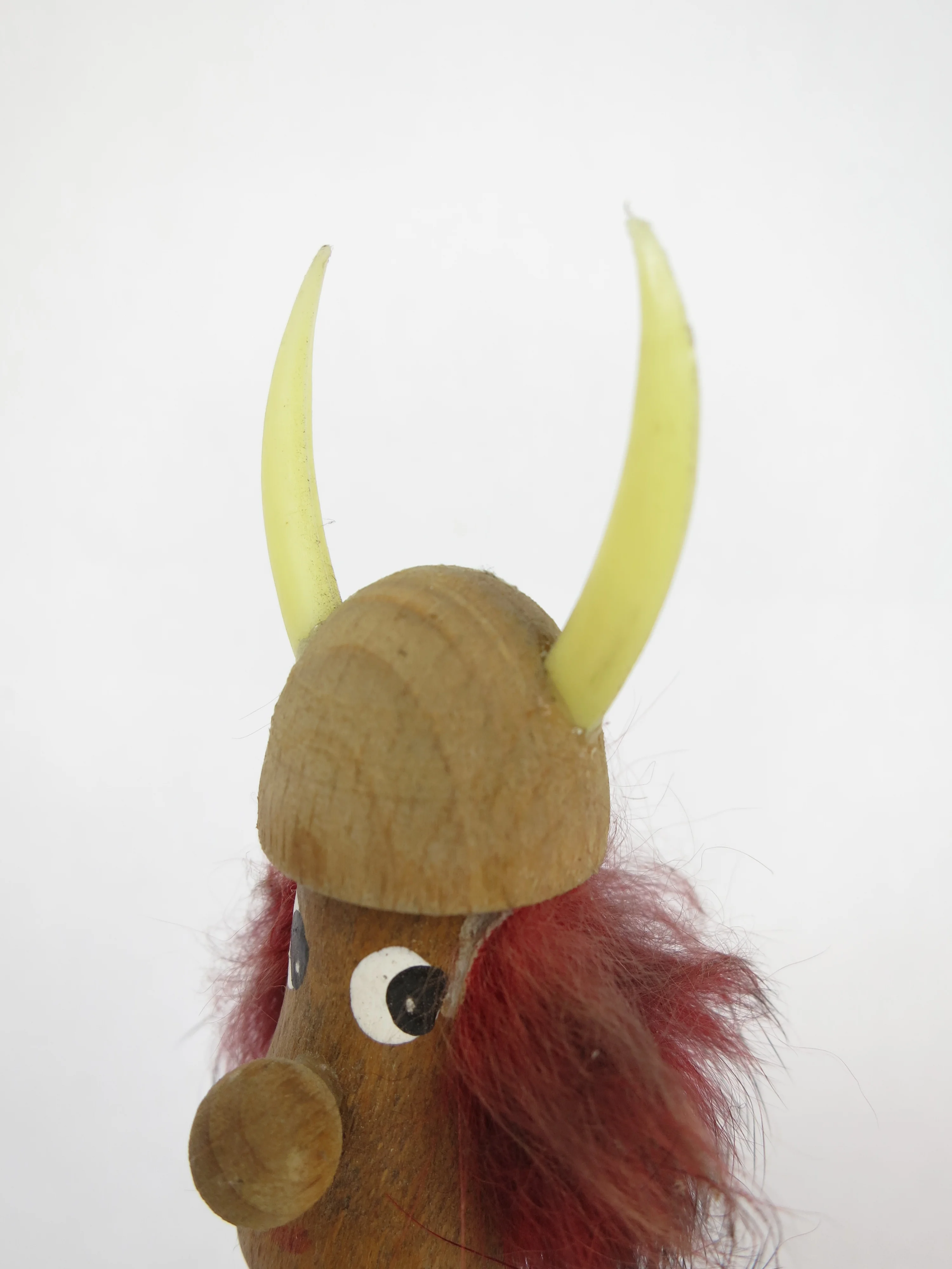Das Männchen und der Helm sind aus Holz und die Hörner sind aus Plastik.