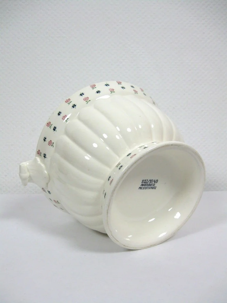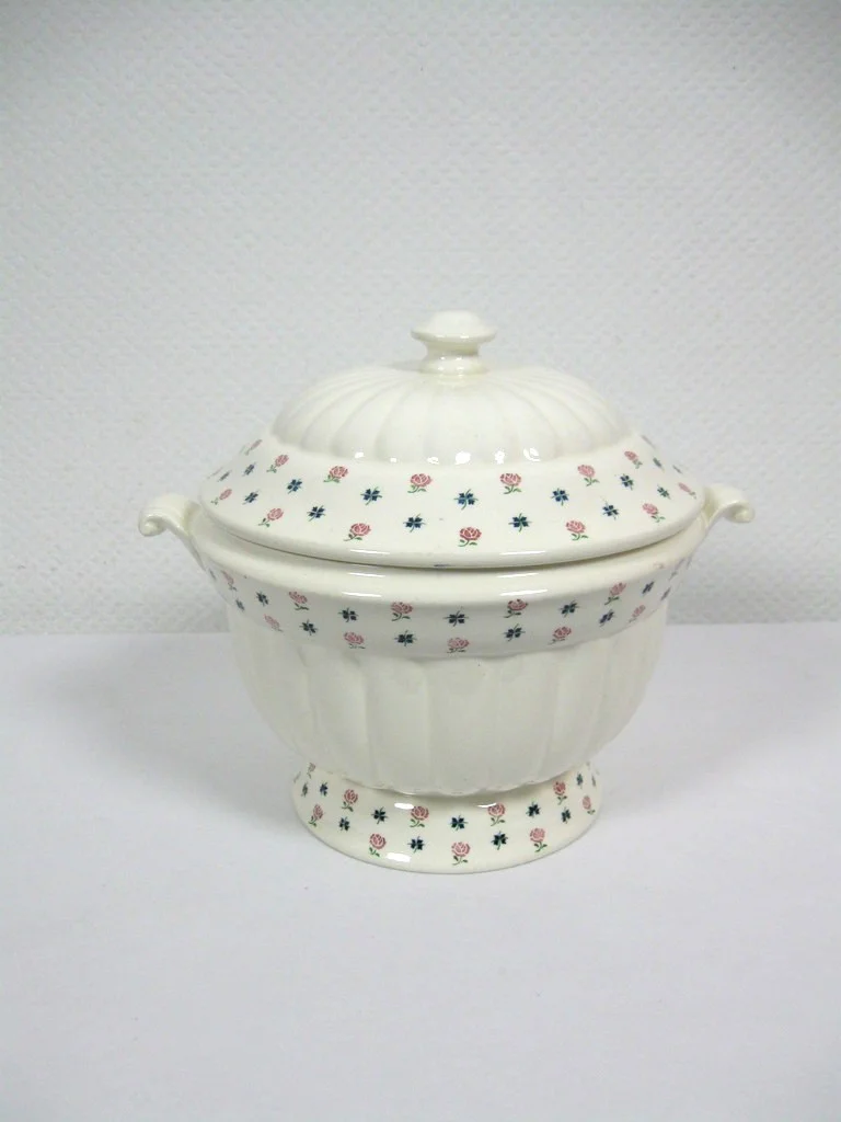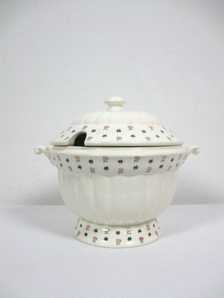 Terrine und Deckel sind aus glasierter Keramik und mit einem hübschen Blümchenmuster verziert.