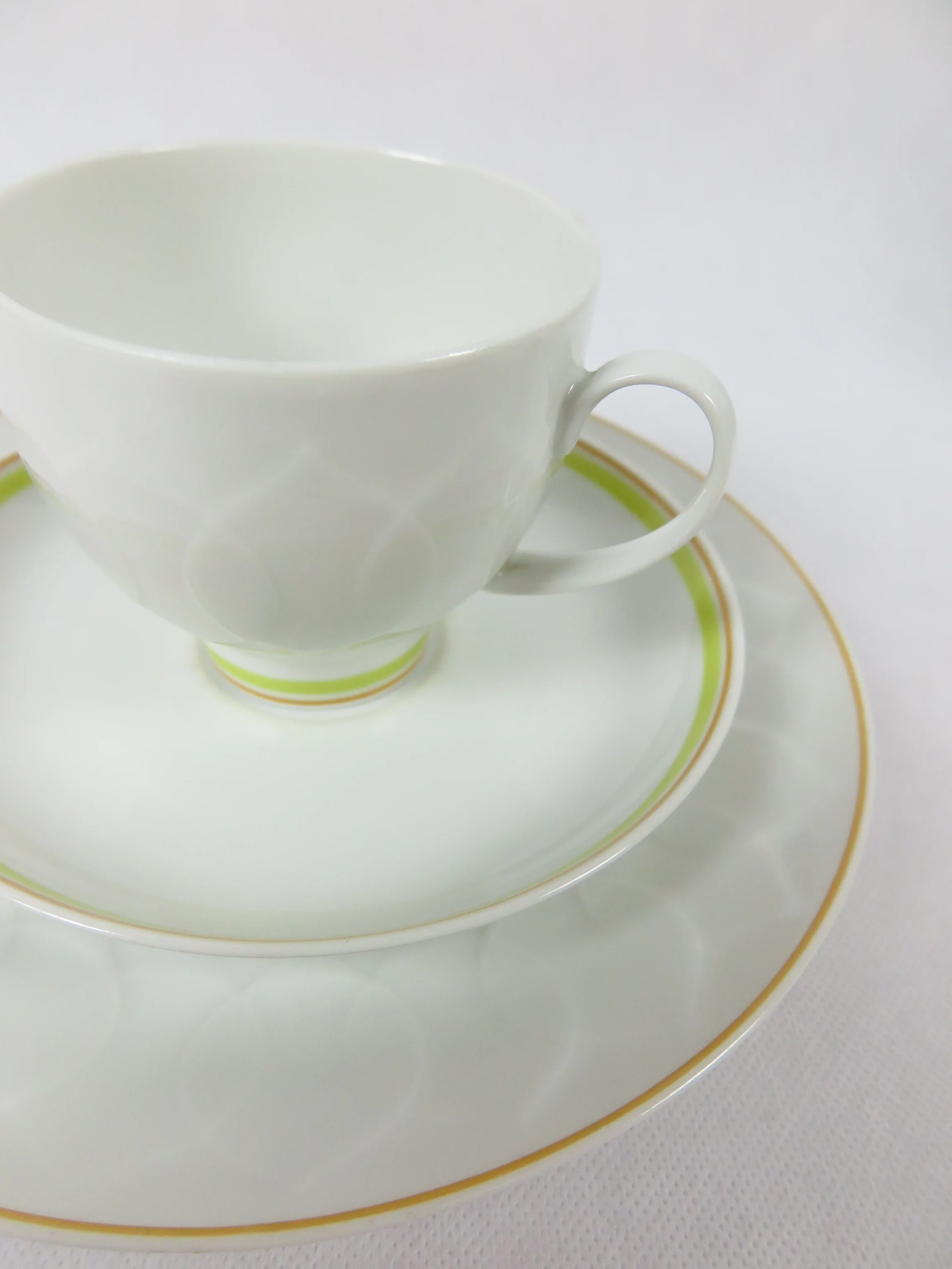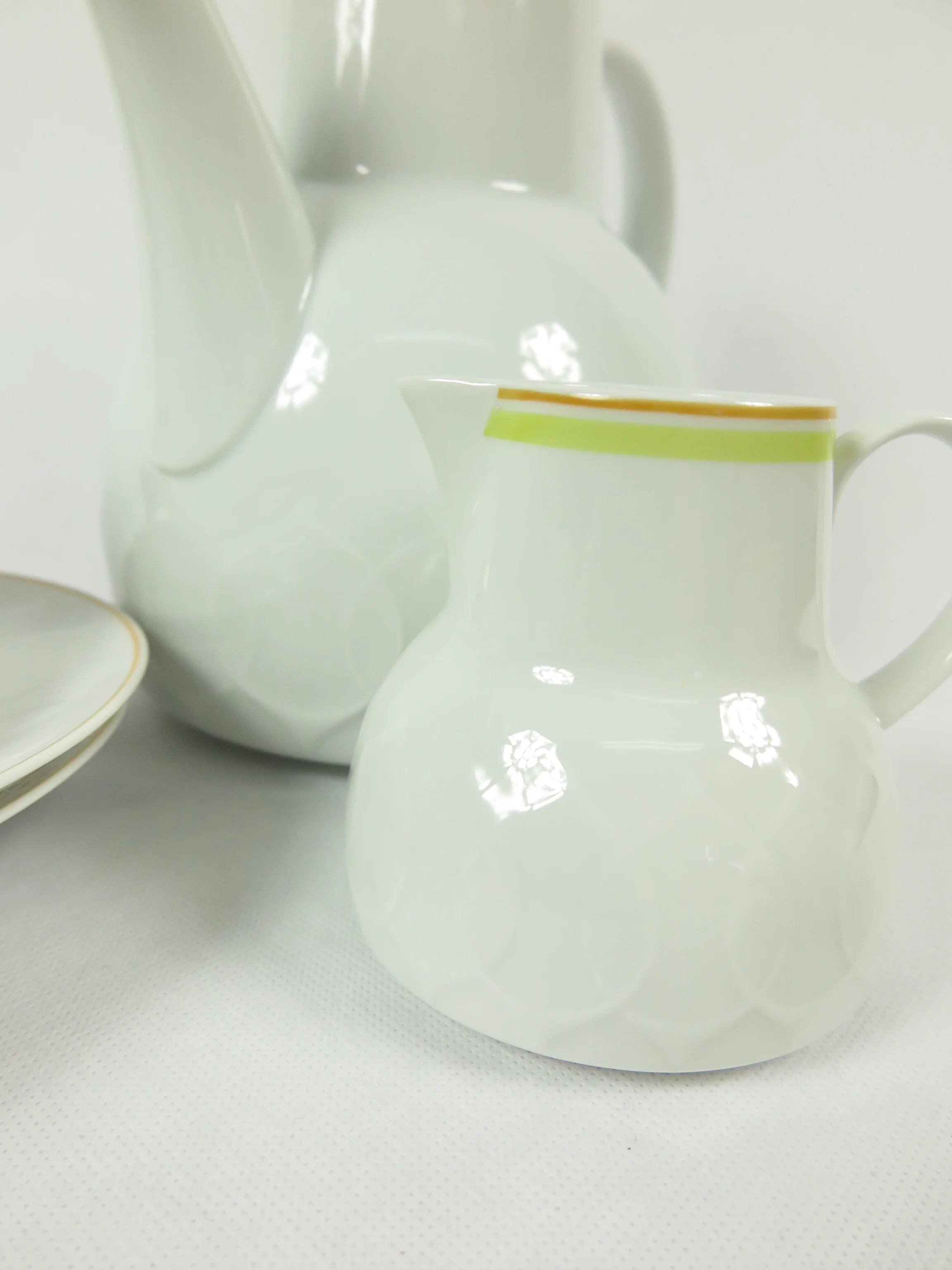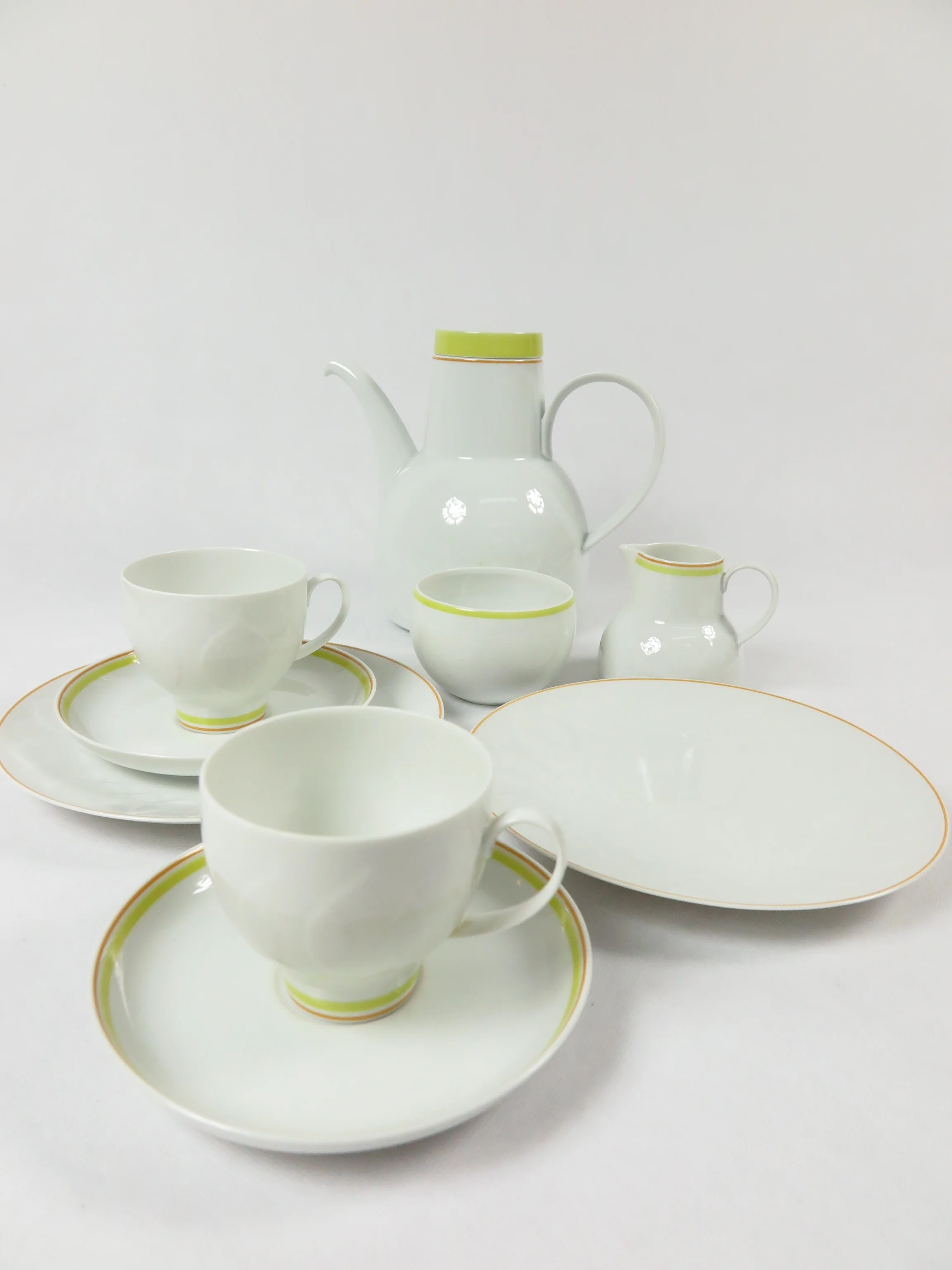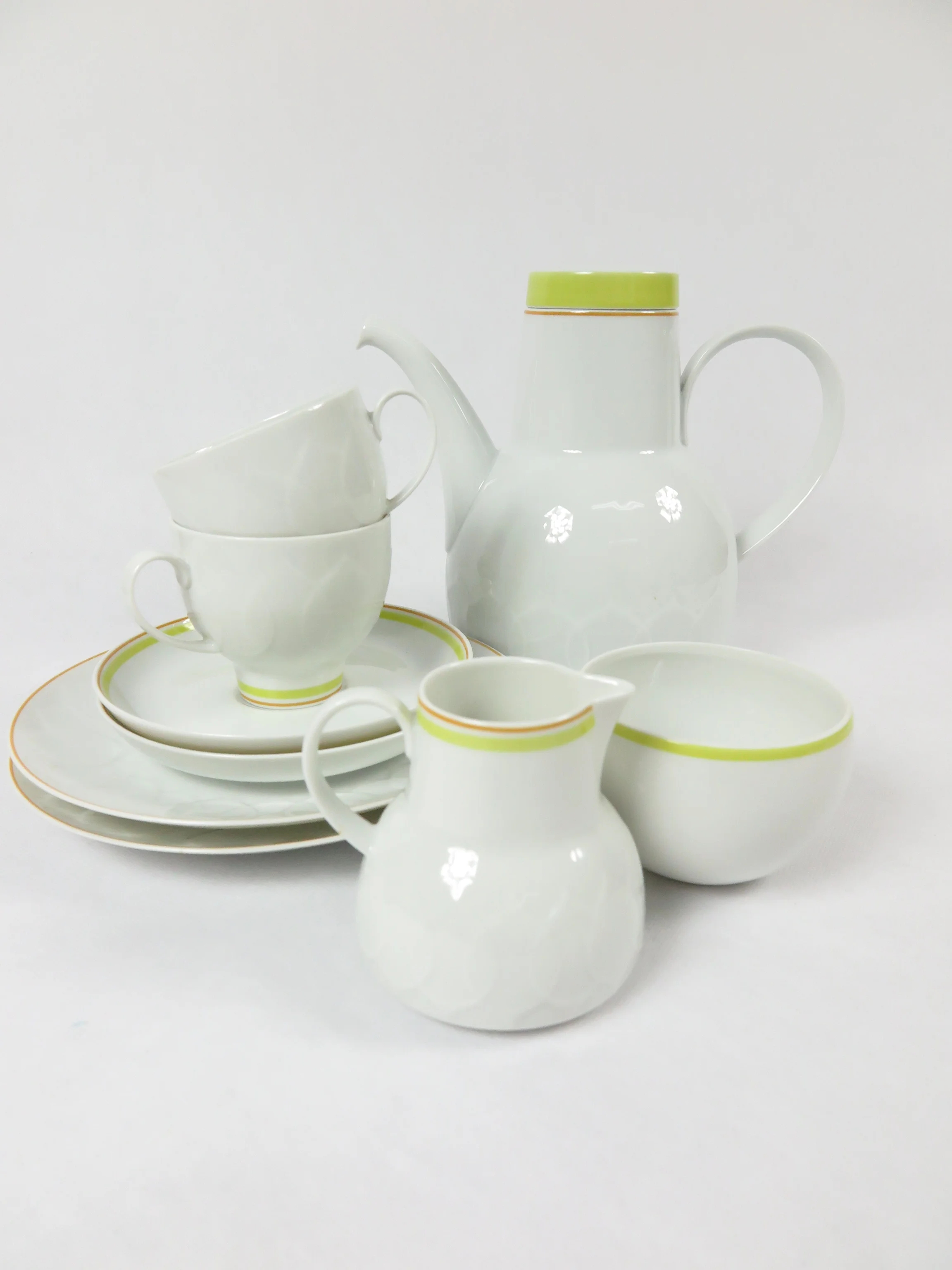 Alle Teile sind aus weißem Porzellan, und mit einem breiten gelben Streifen und einem feinen orangen Streifen verziert. Das typische Unterglasur Blattmuster ziert die Kuchenteller, die Kanne und das Milchkännchen. Das Service wirkt sonnig und angenehm.