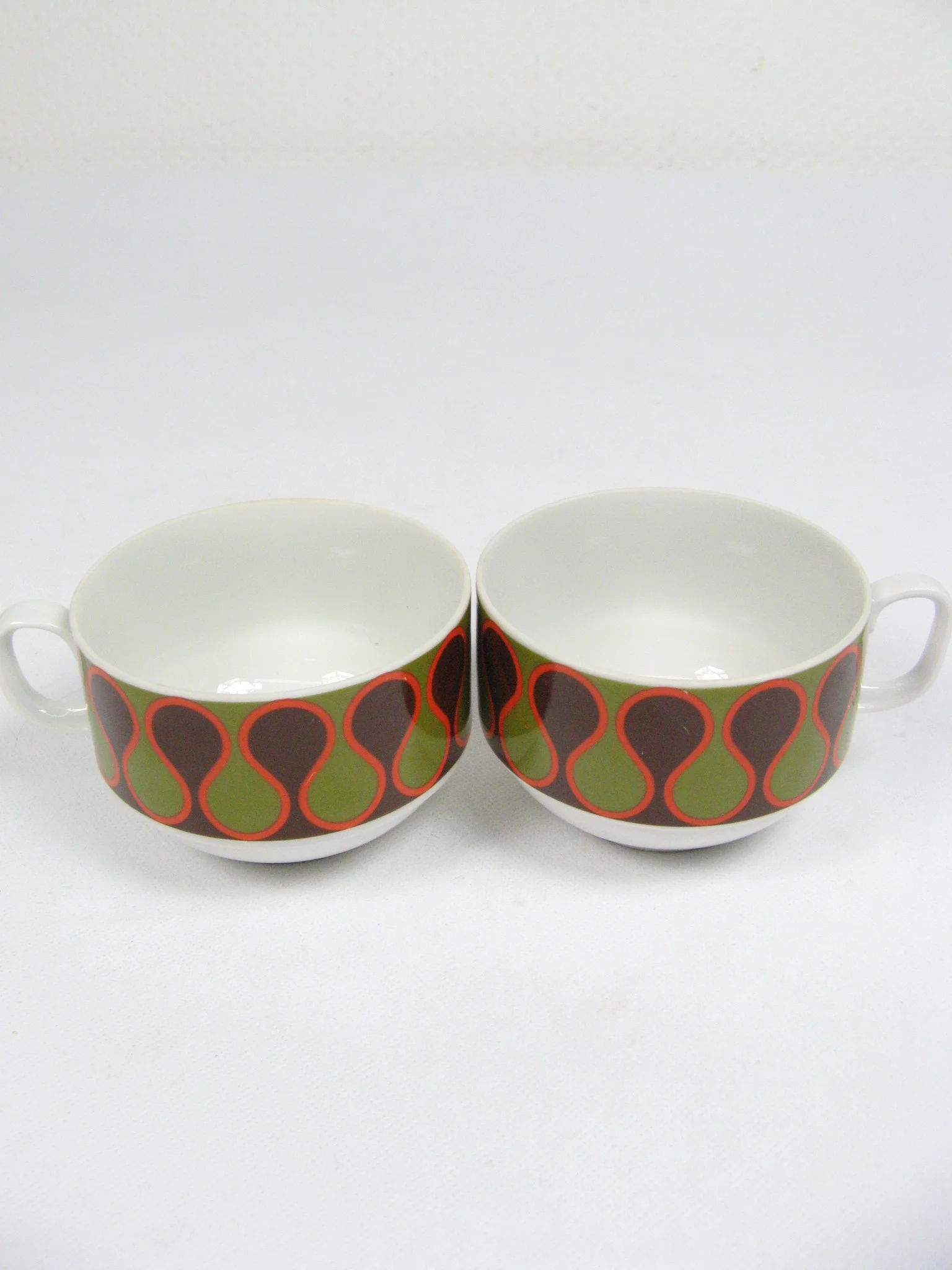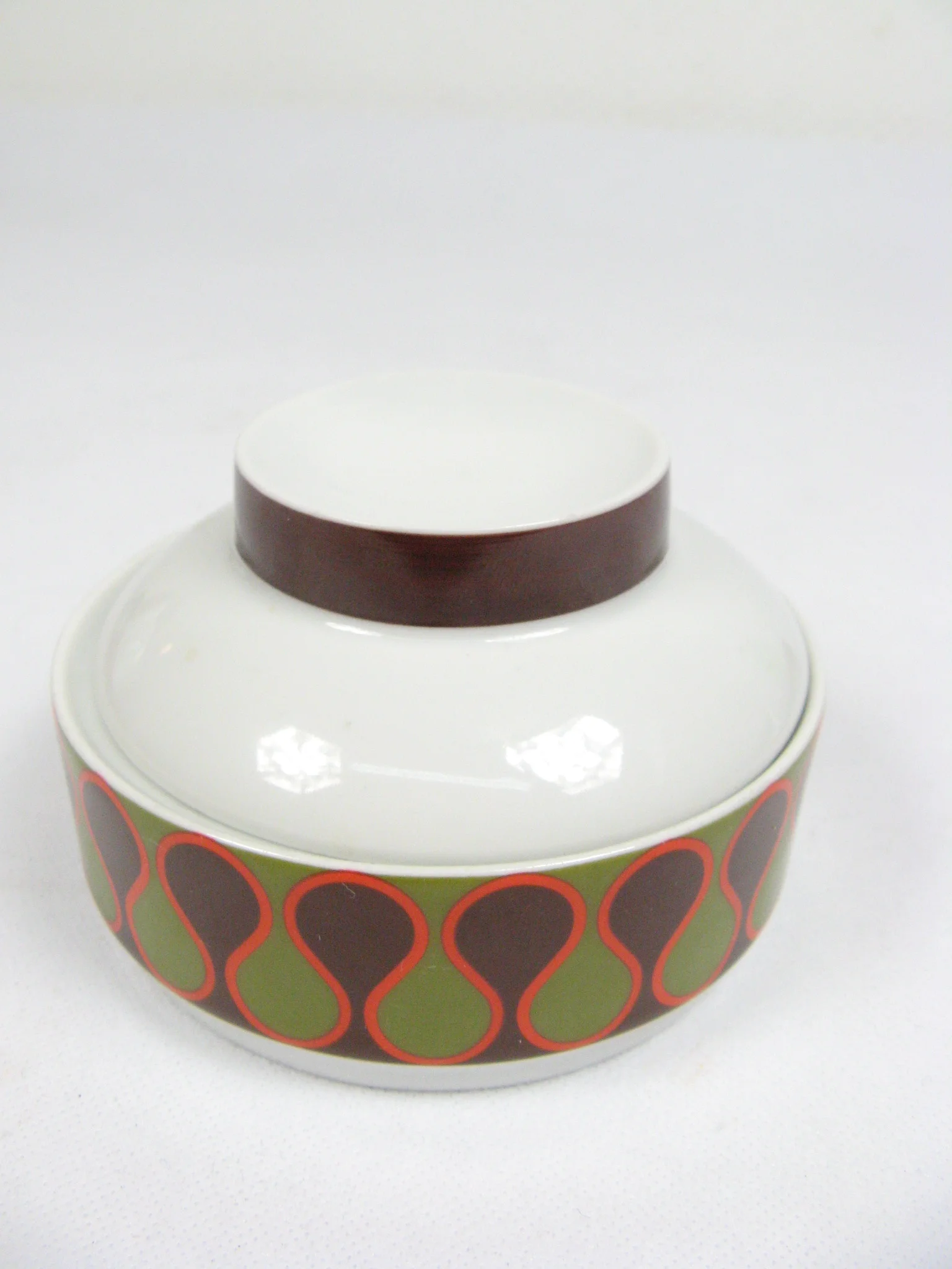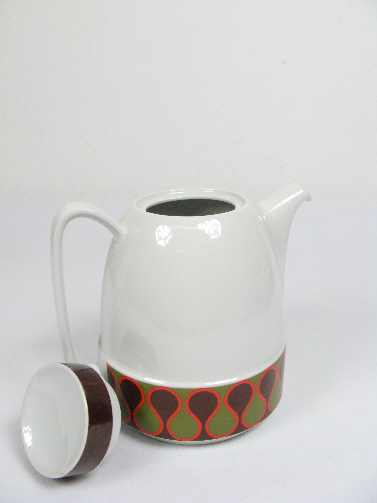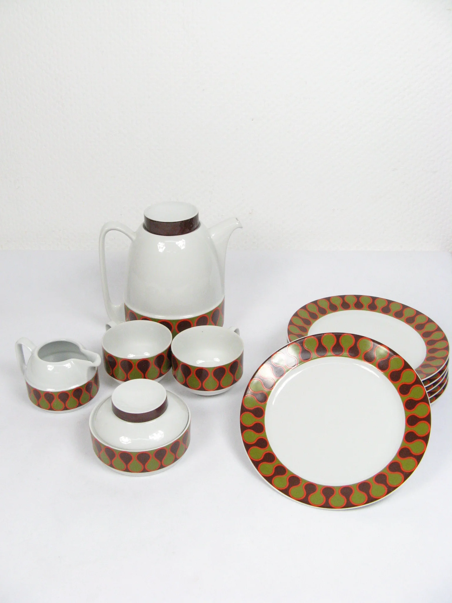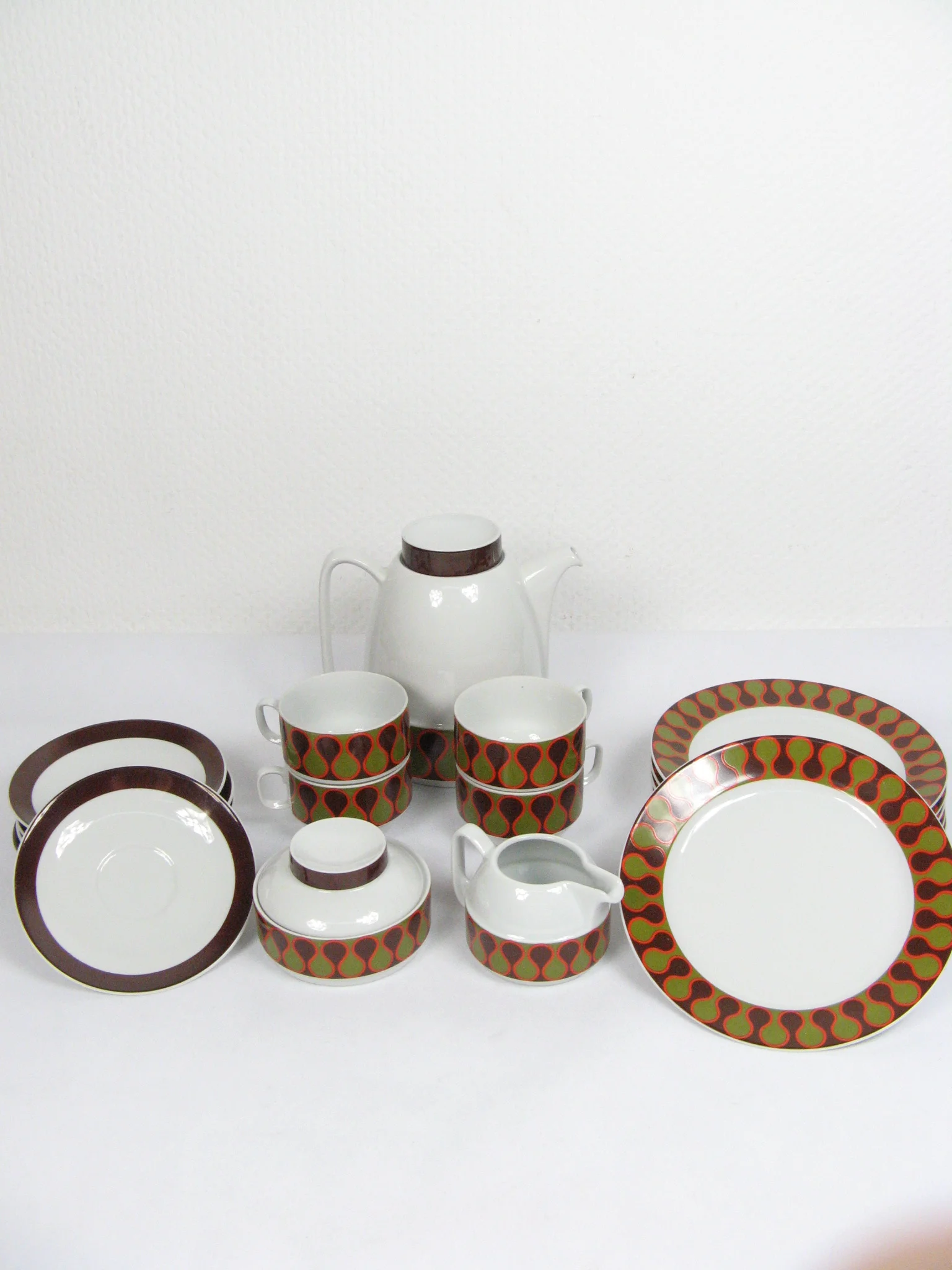 Das Service besteht aus einer Kaffeekanne mit Deckel, vier Tassen, einer Zuckerdose mit Deckel, einem Milchkännchen, vier Untertassen und vier Kuchentellern. Alle Teile sind aus Porzellan und sind mit einem coolen Seventies-Dekor verziert.