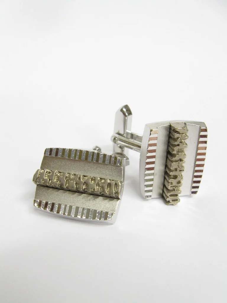 Die Knöpfe bestehen aus verchromtem Metall und haben ein zeittypisches Design. Die Oberfläche ist teils matt gebürstet, teils glänzend. Als Schließmechanik dient ein Schwenkbügel.