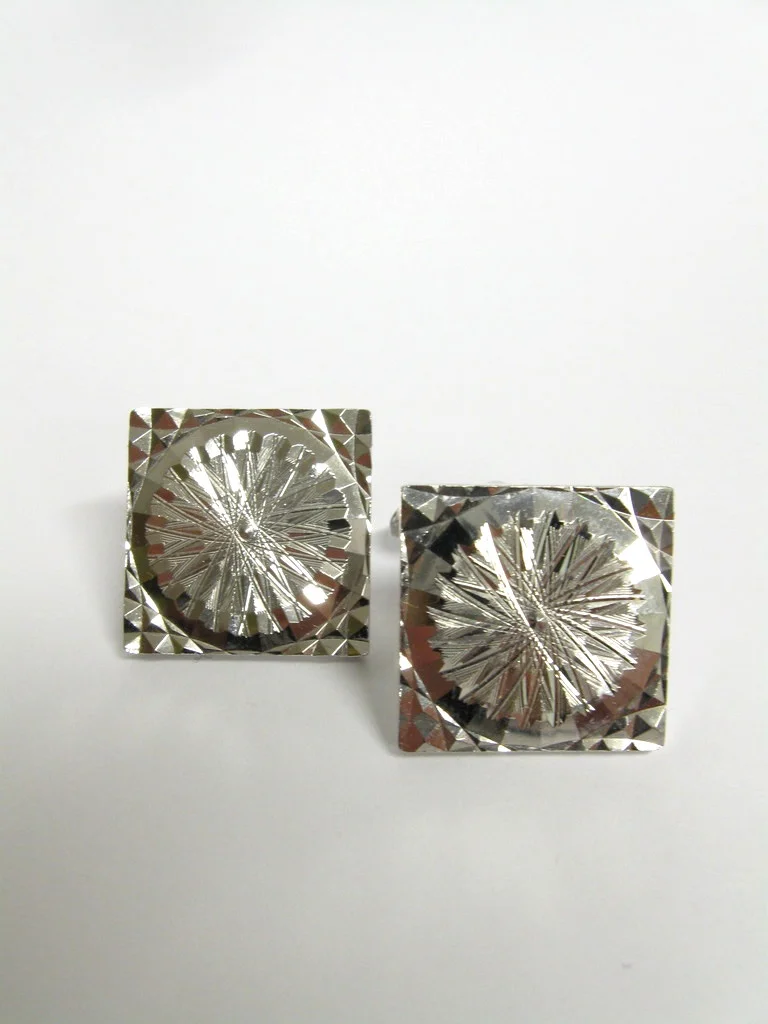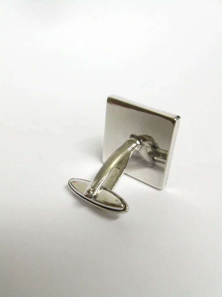 Die Knöpfe bestehen aus verchromtem Metall und haben ein zeittypisches Design, welches an die Opt-Art erinnert. Als Schließmechanik dient ein Schwenkbügel.