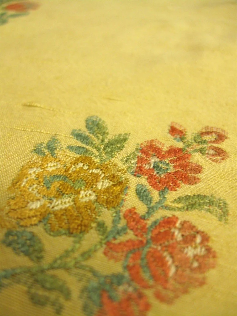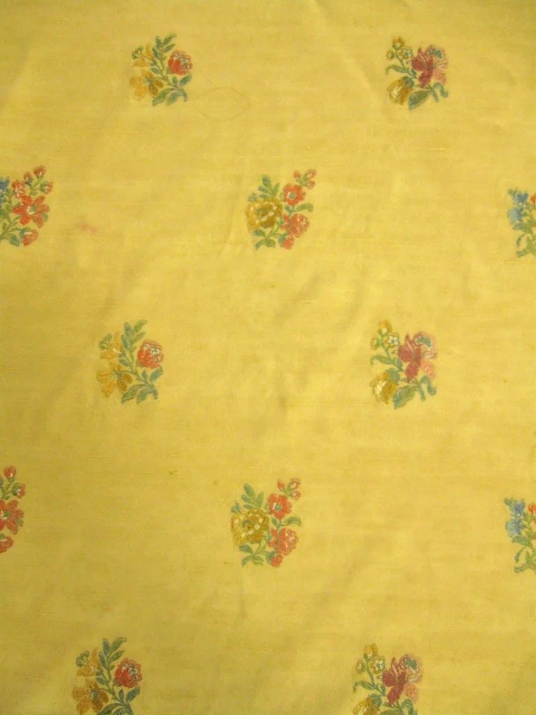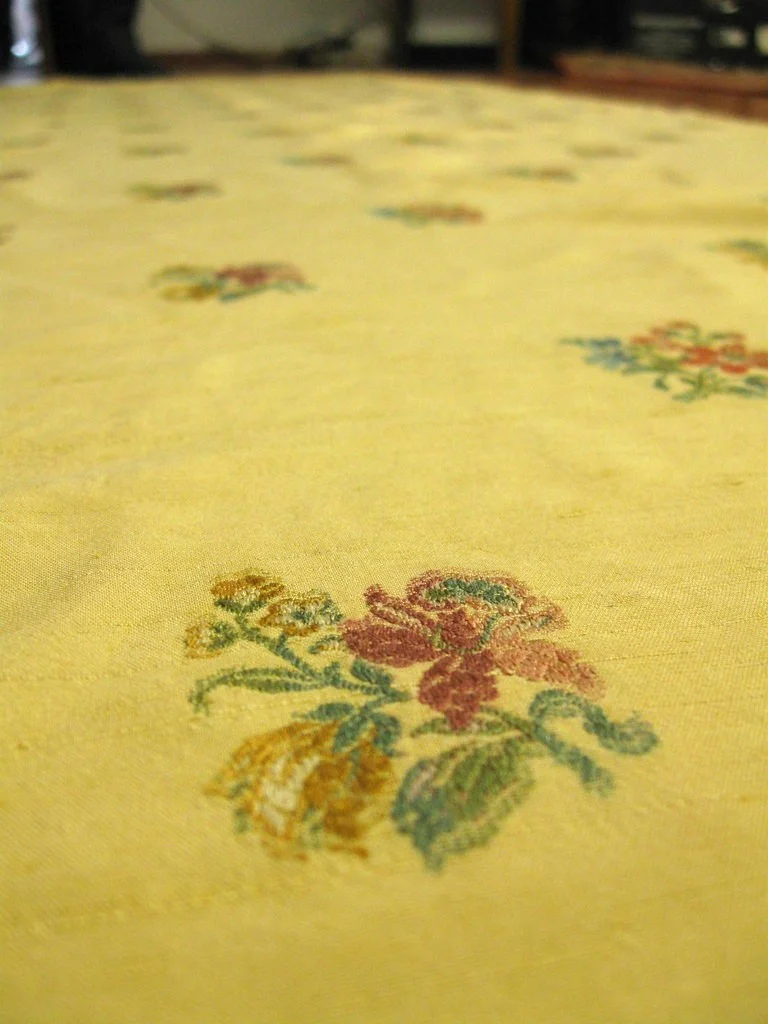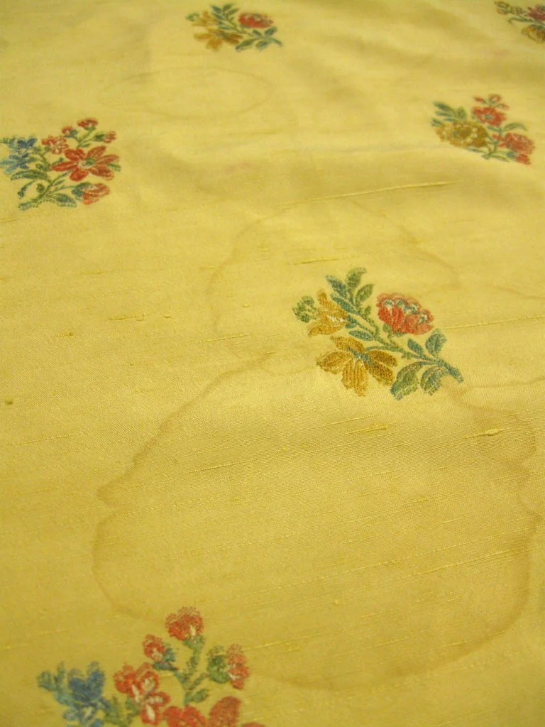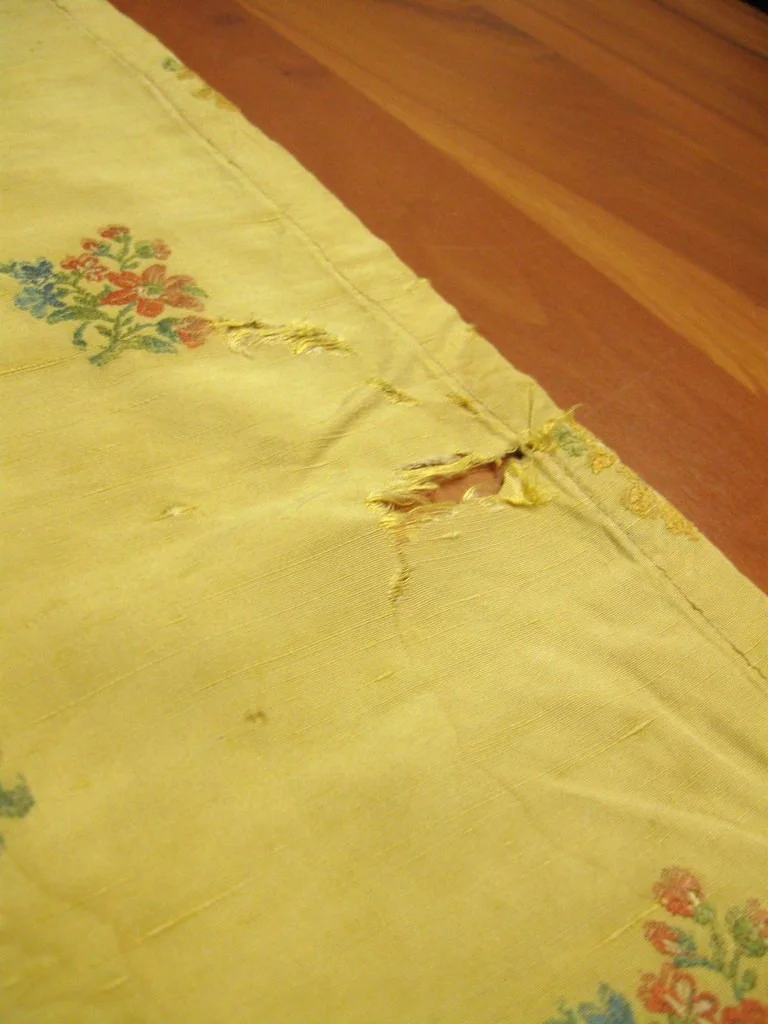 Natürlich hat die Zeit ein paar Spuren hinterlassen, so ist eine Stelle an der unteren Saumkante verschlissen, hier und da gibt es ein paar Wasserflecken und ab und zu leichte Ausfärbungen des Blumenmusters.