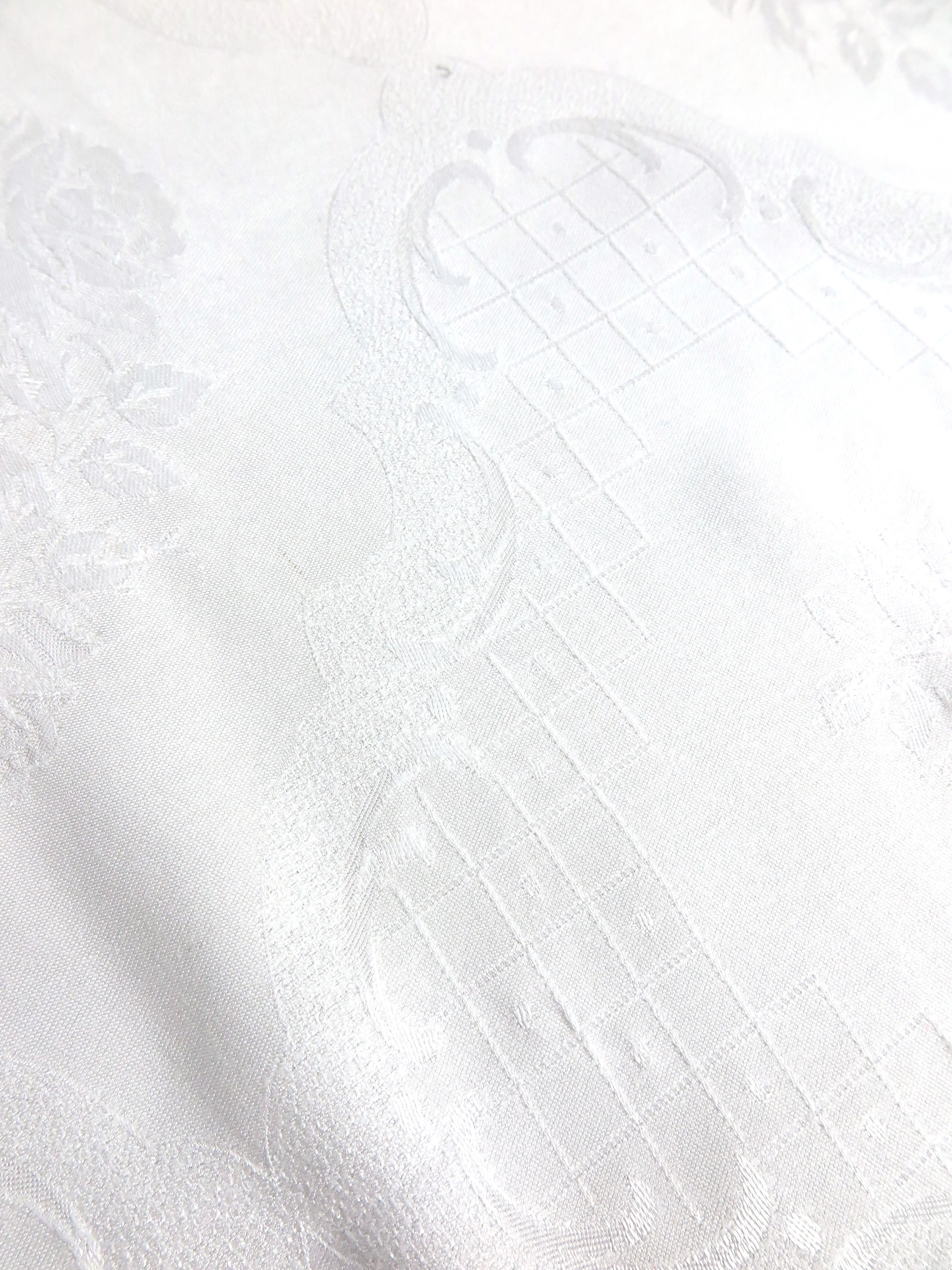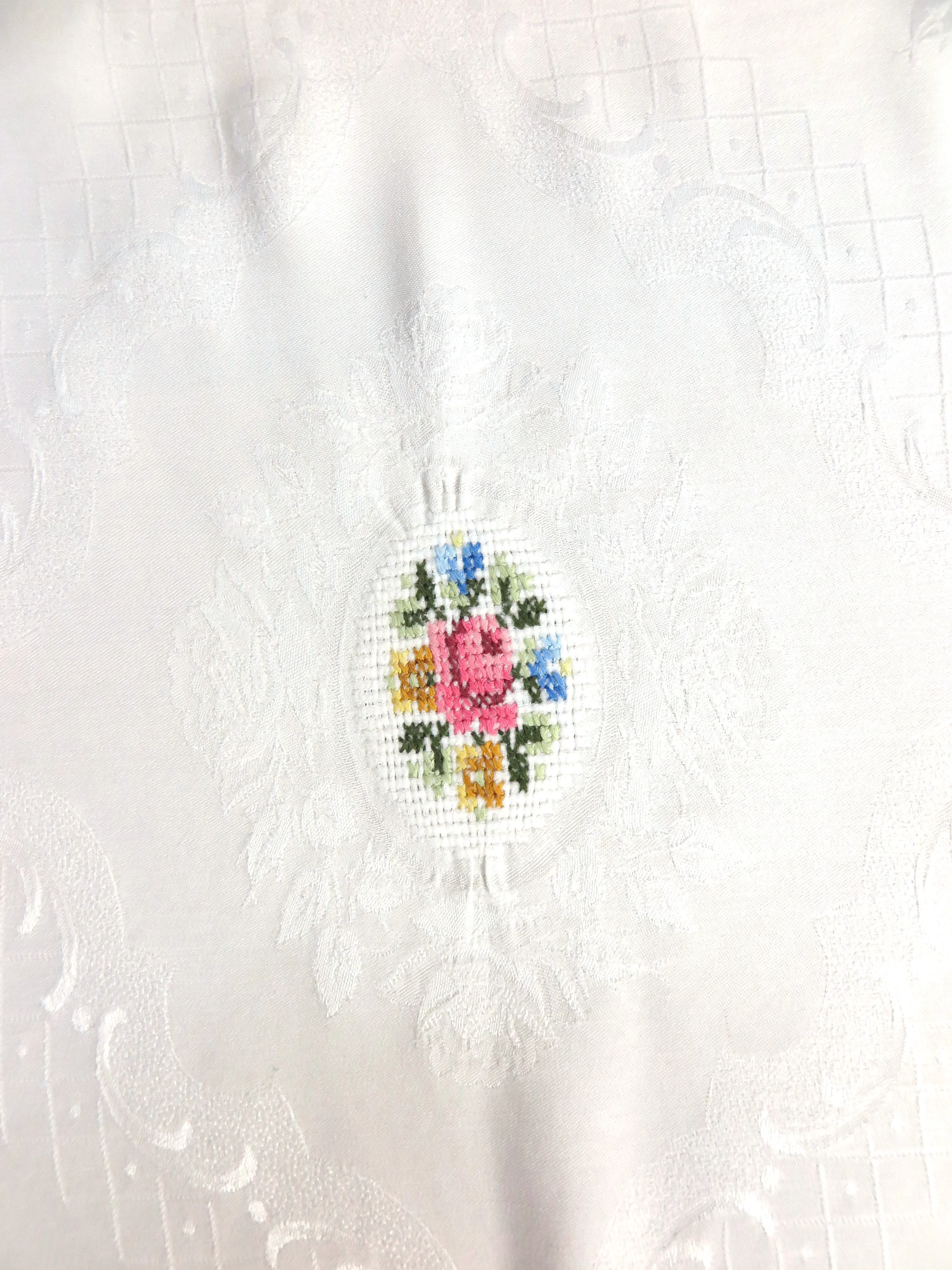 Die Tischdecke aus Baumwollbatist ist mit Kreuzstich per Hand bestickt worden.