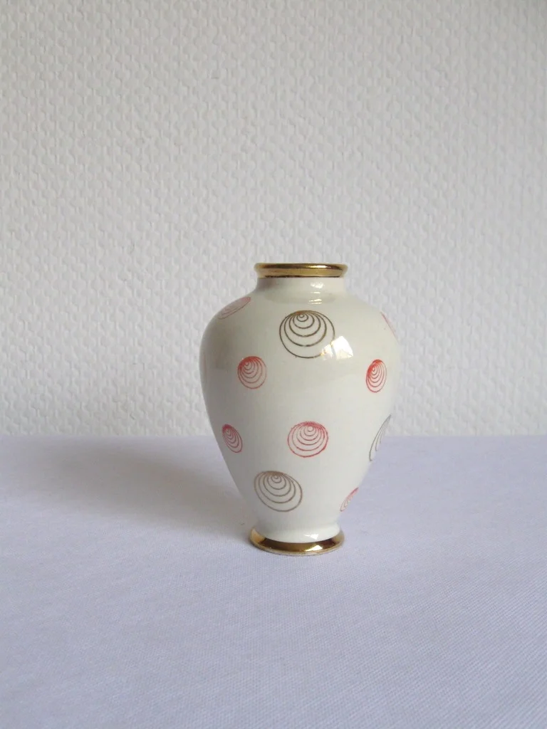 Die Vase ist aus Porzellan, hat einen Goldrand und ein schönes Muster.