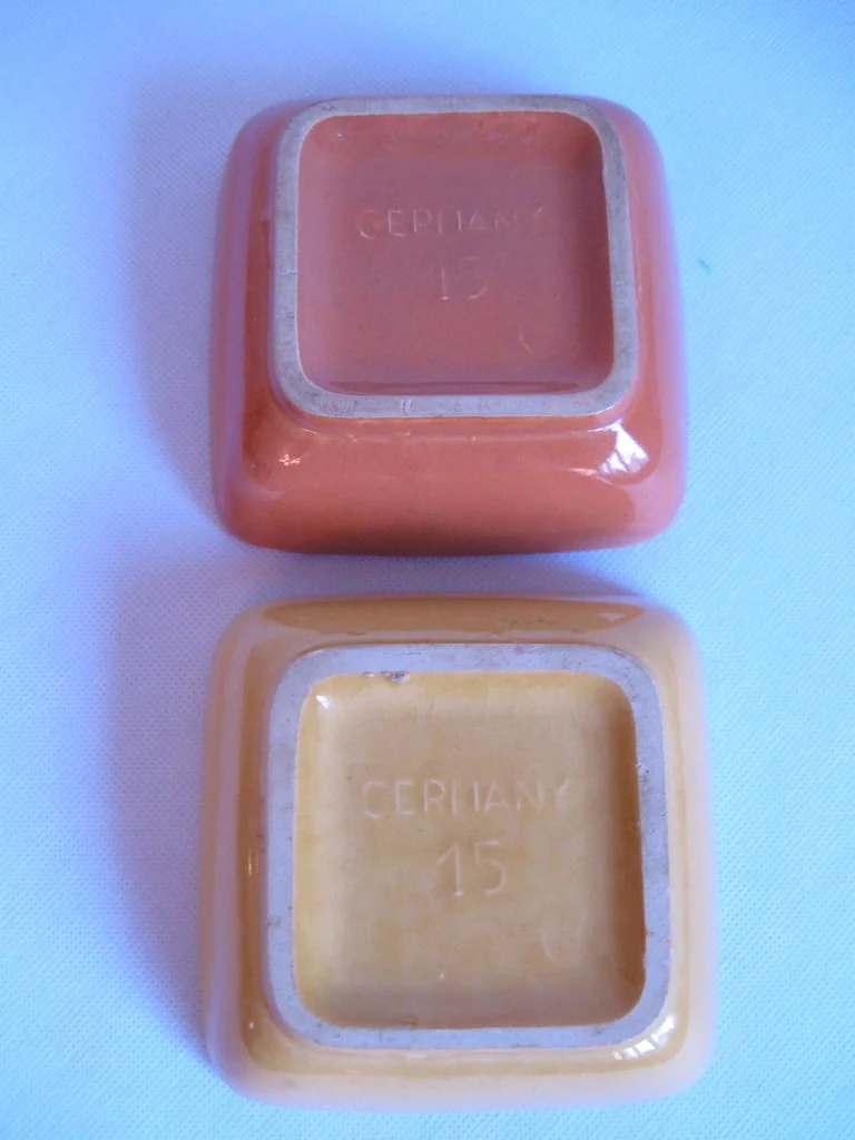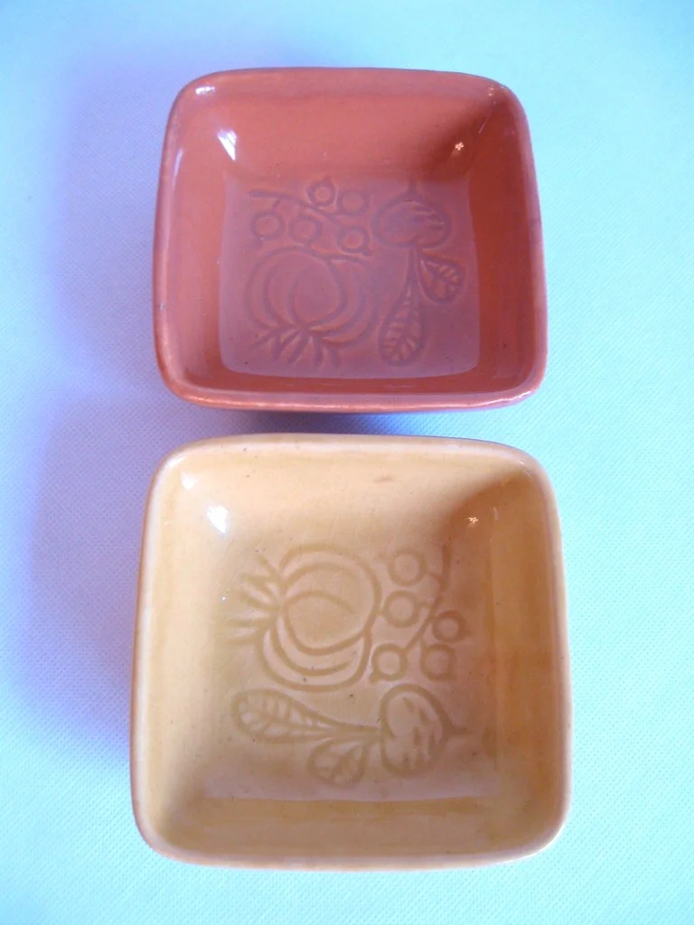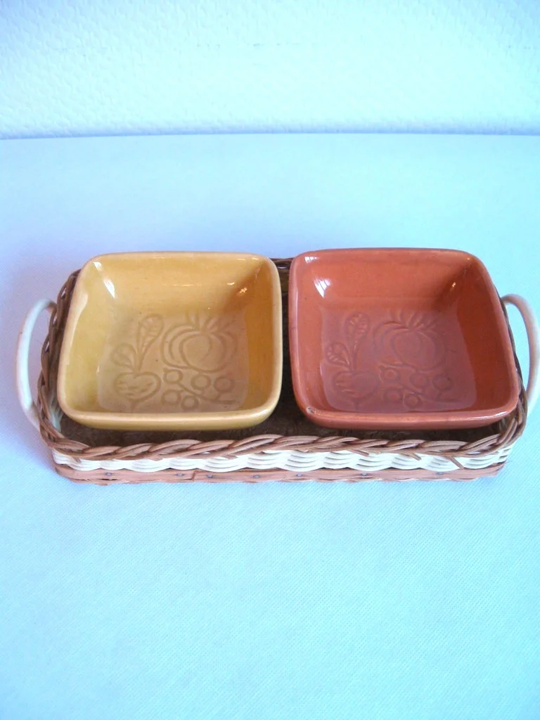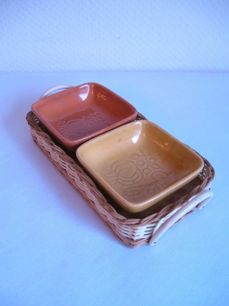The cabaret consists of two glazed ceramic bowls and a basket of wood and plastic mesh.