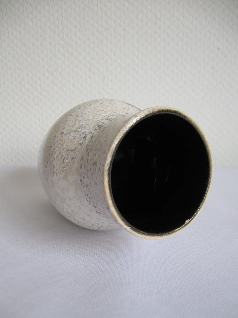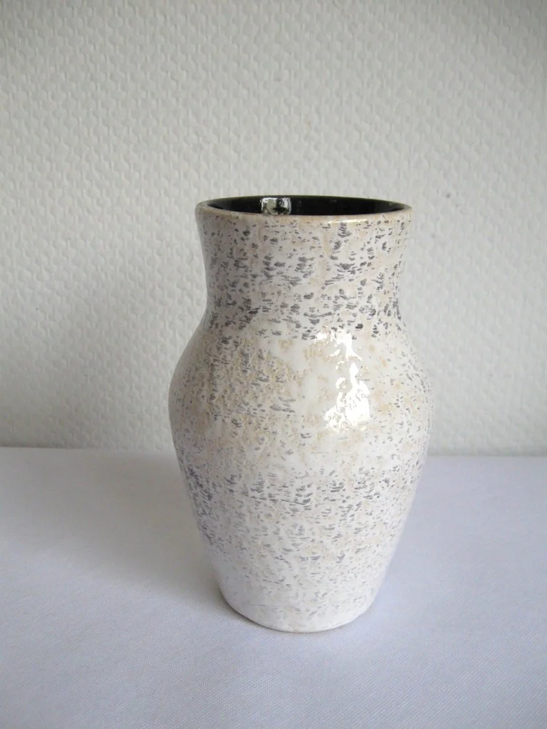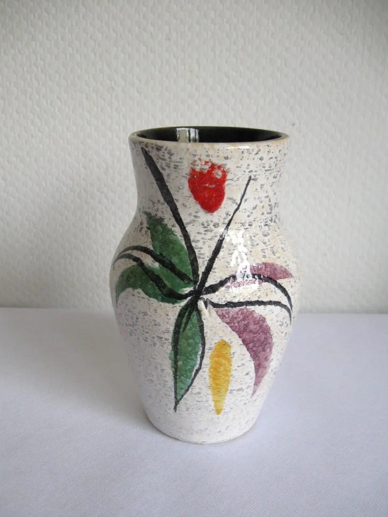 The vase is made of glazed ceramic and decorated with a colorful motif