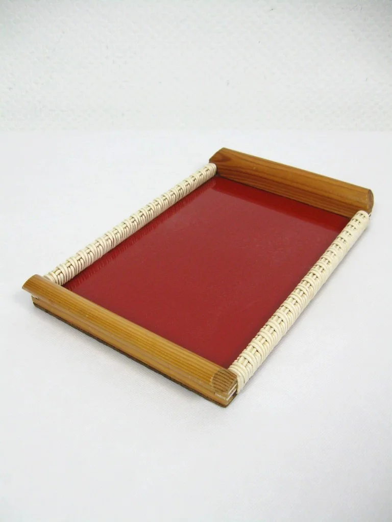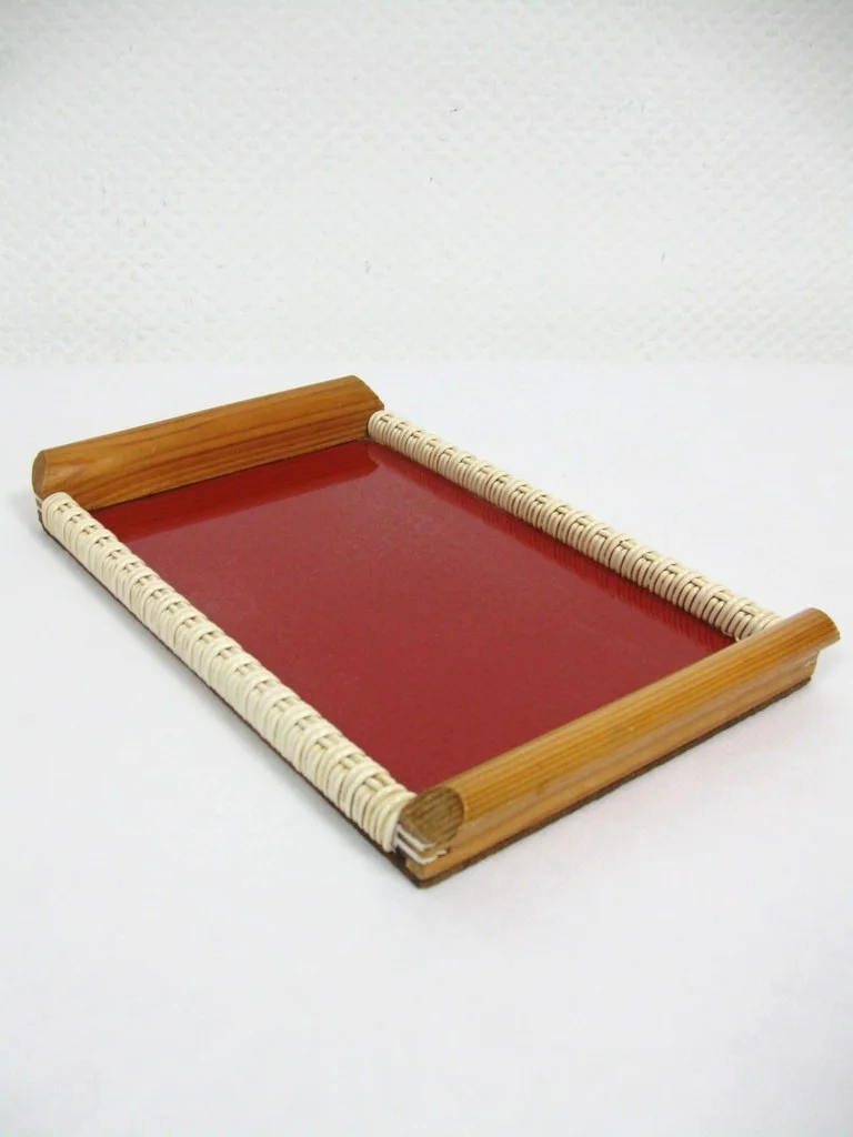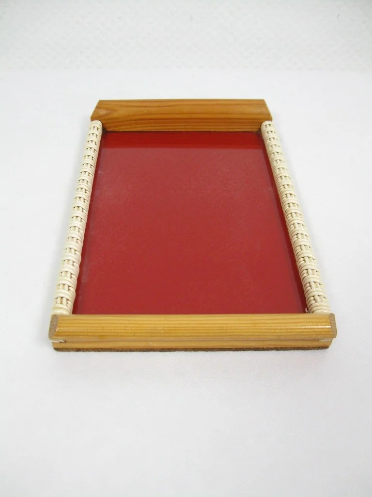 The tray consists of an MDF board with a red plastic coating, wooden handles and a plastic wicker border