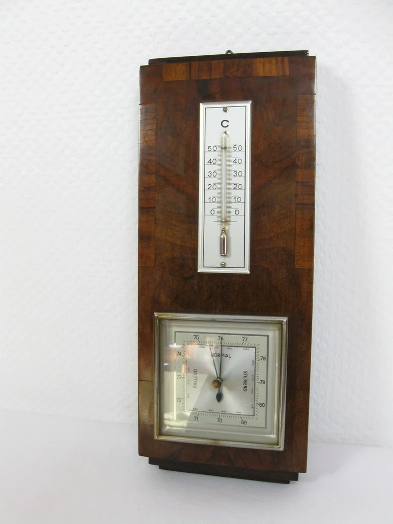 The station consists of barometer and thermometer. The Instruments and cover are made of metal and glass. The body is made of precious wood.