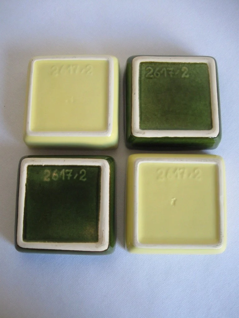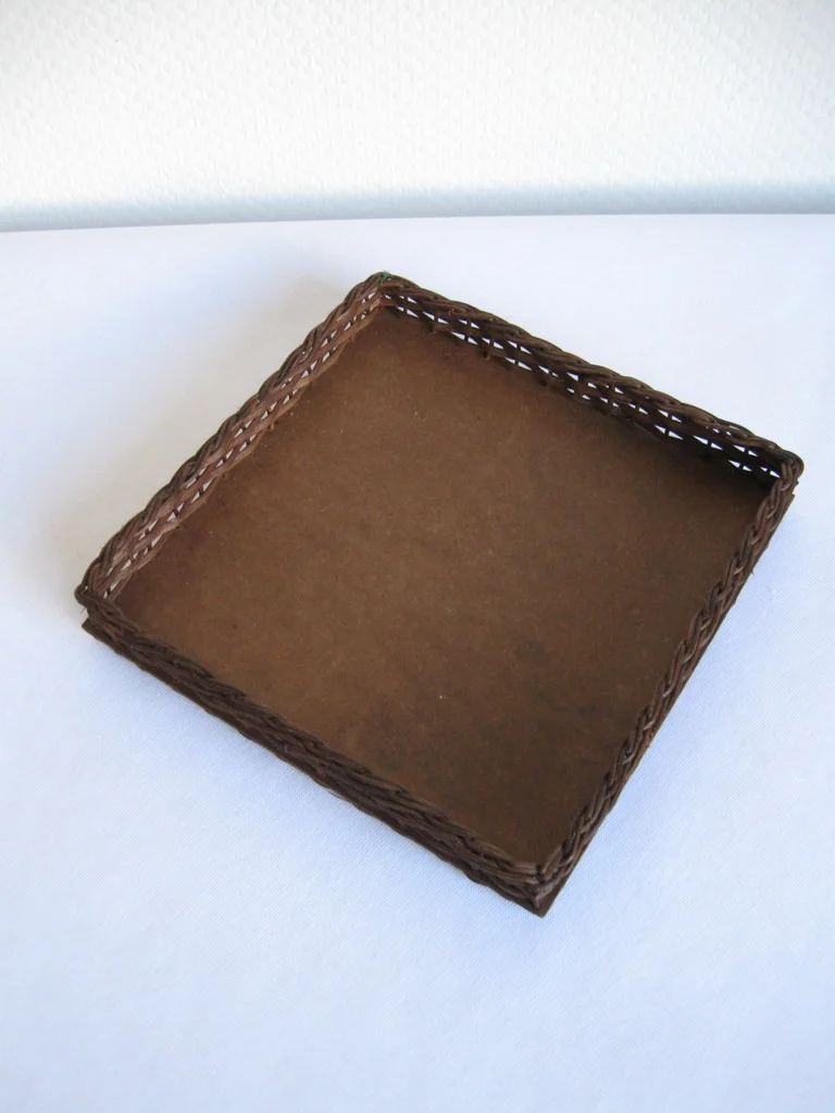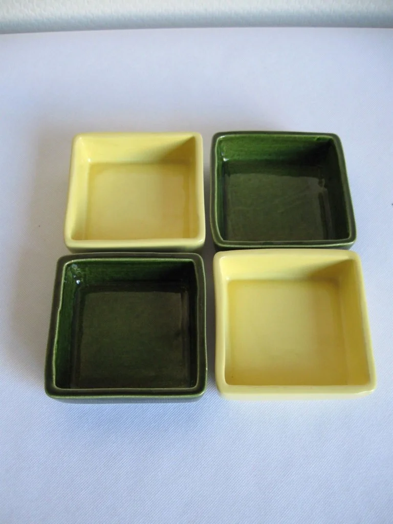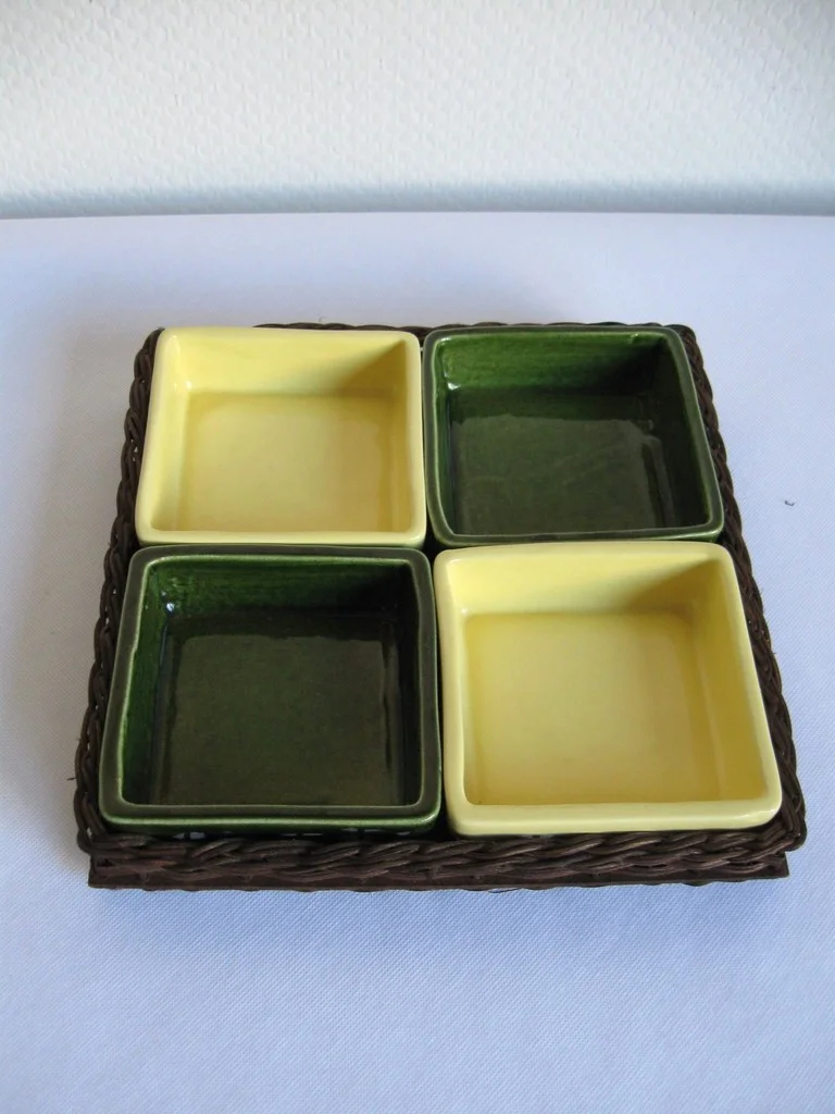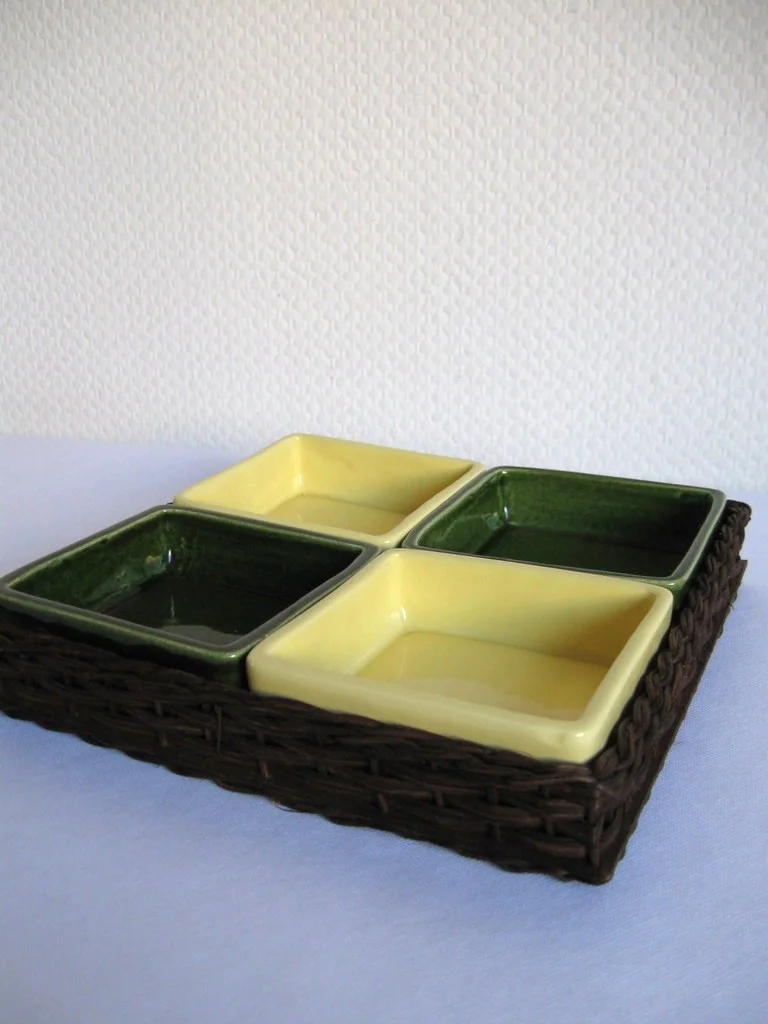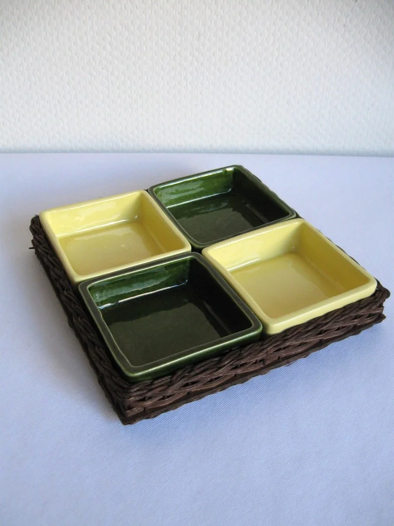 The cabaret consists of four glazed ceramic bowls and a basket of wooden mesh.
