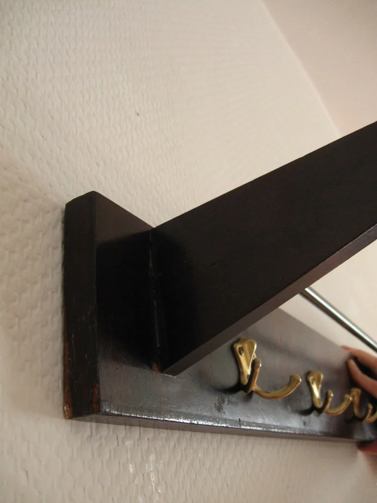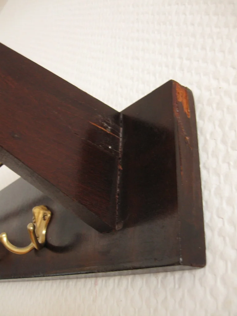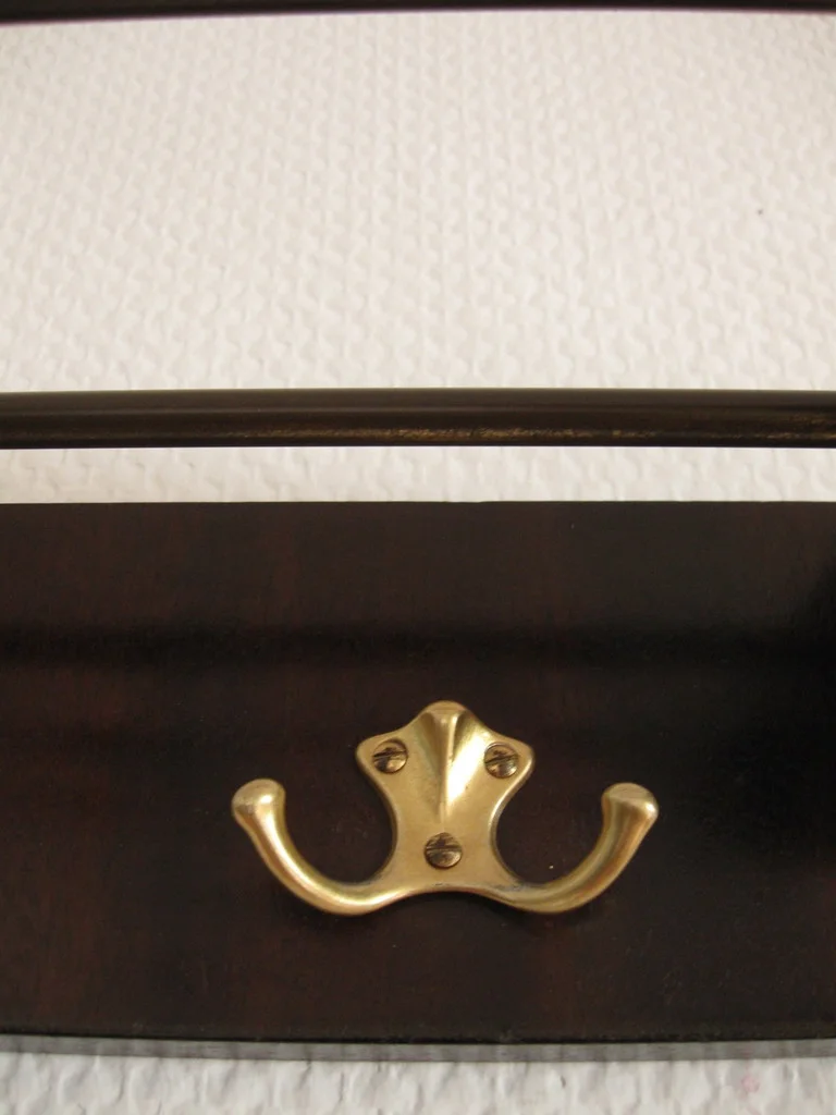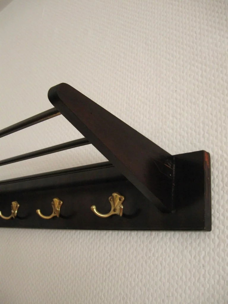 The wardrobe is made of veneered wood and has four brass double hooks. The struts of the hat shelf are also made of brass.