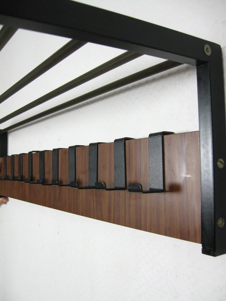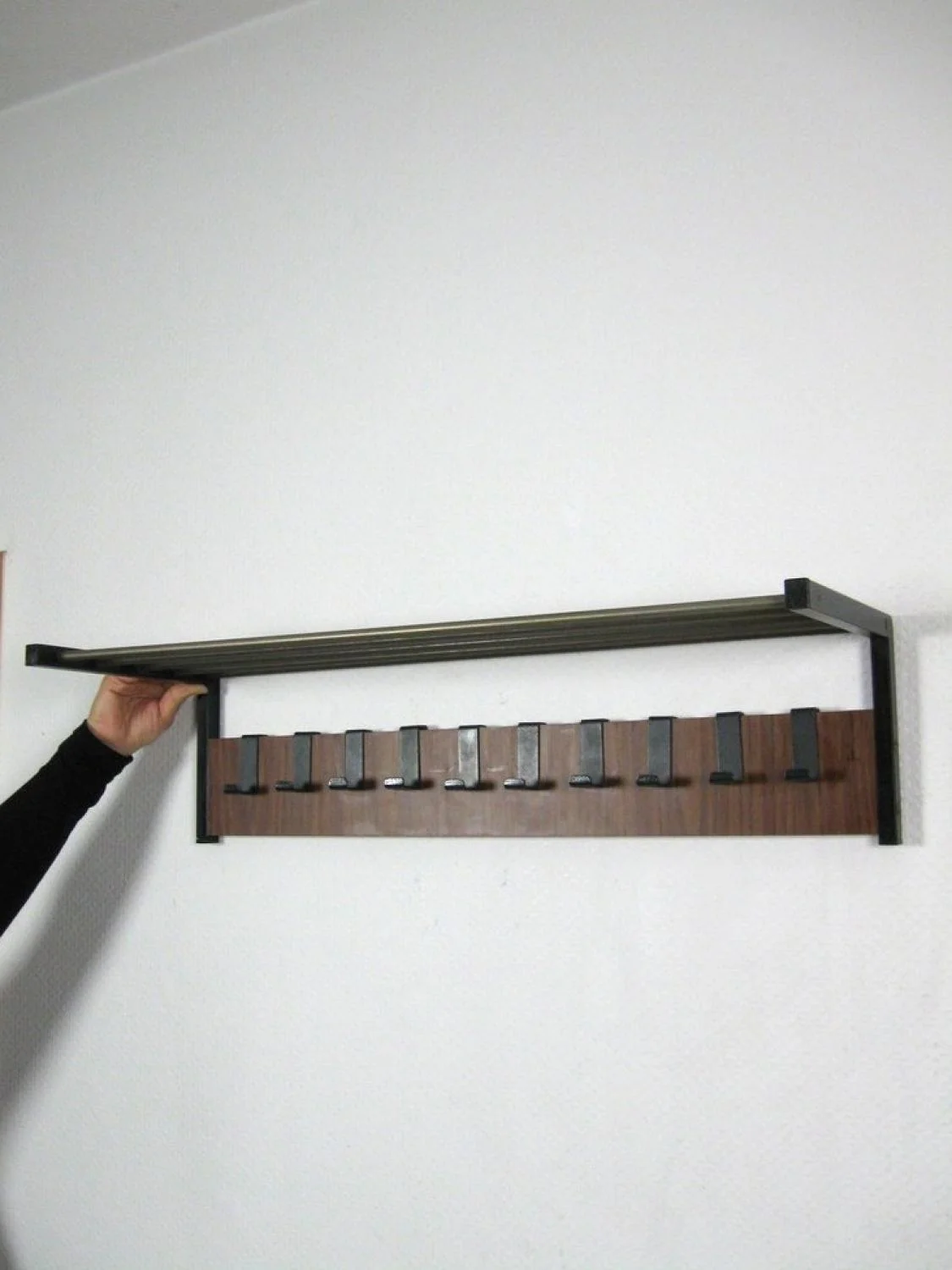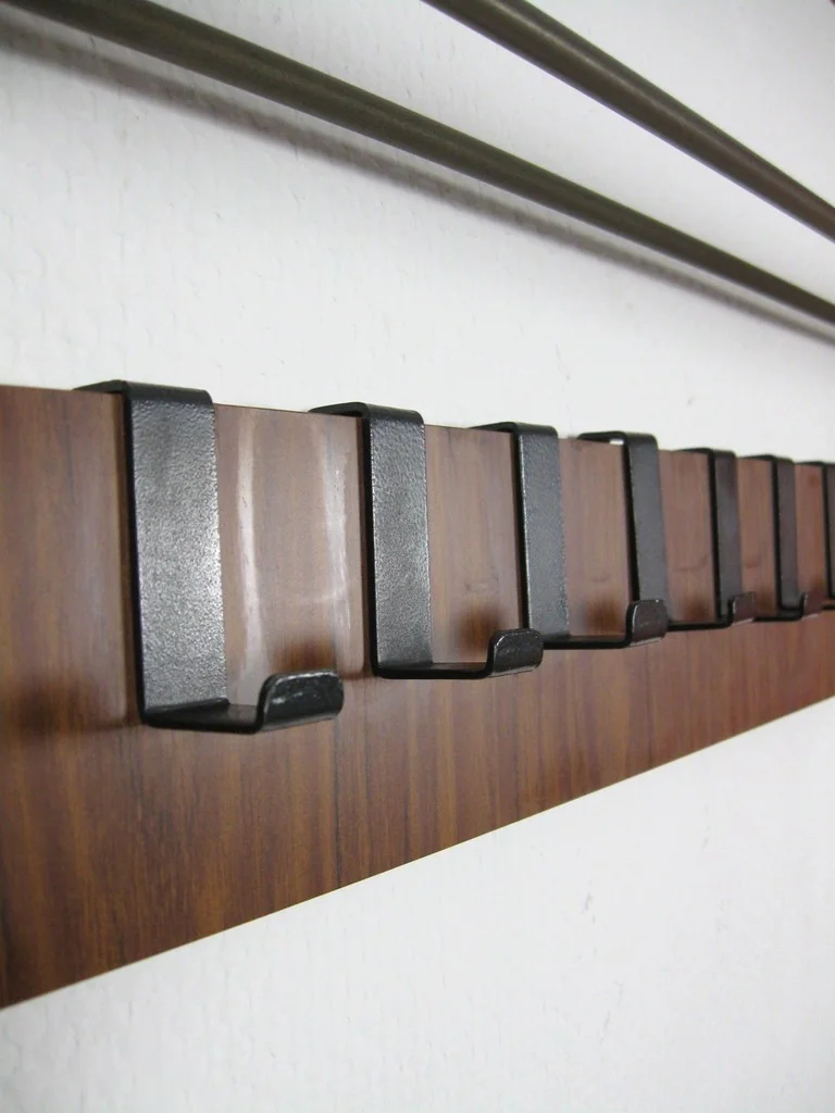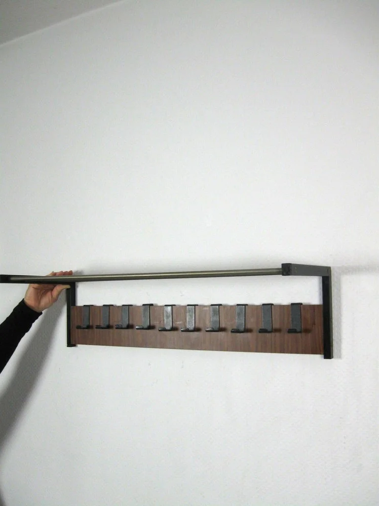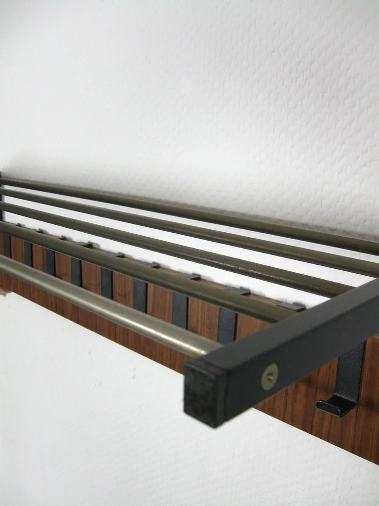 The wardrobe is made of veneered wood and black lacquered metal. The hat shelf consists of five metal struts. The ten hooks are also made of metal!