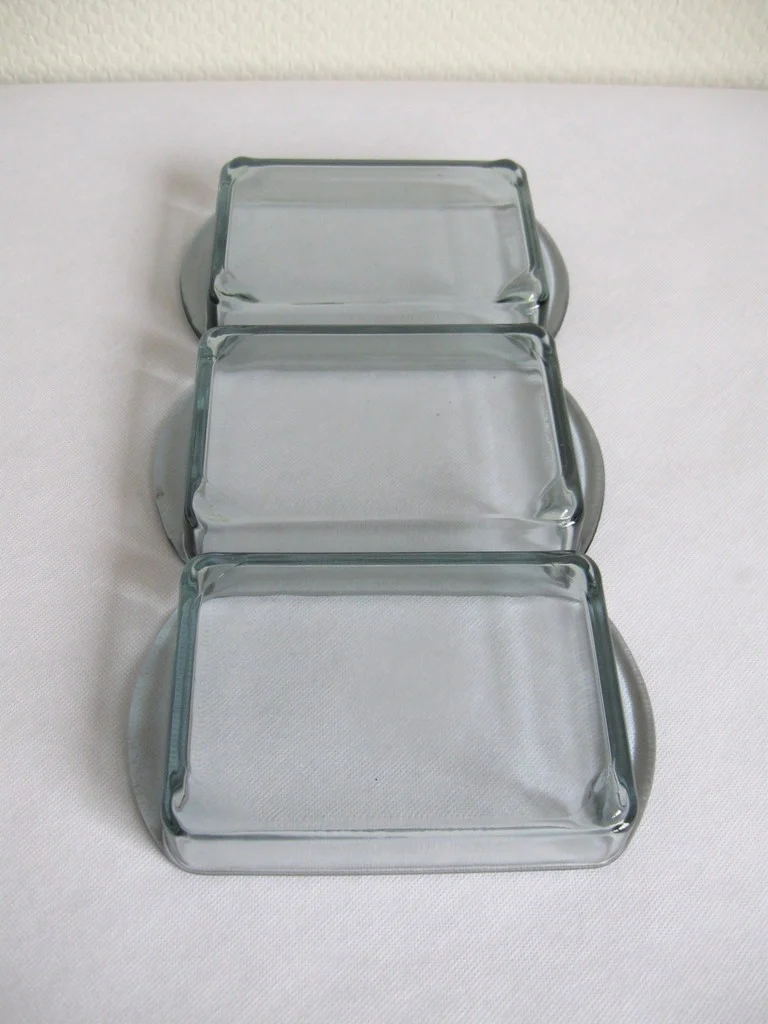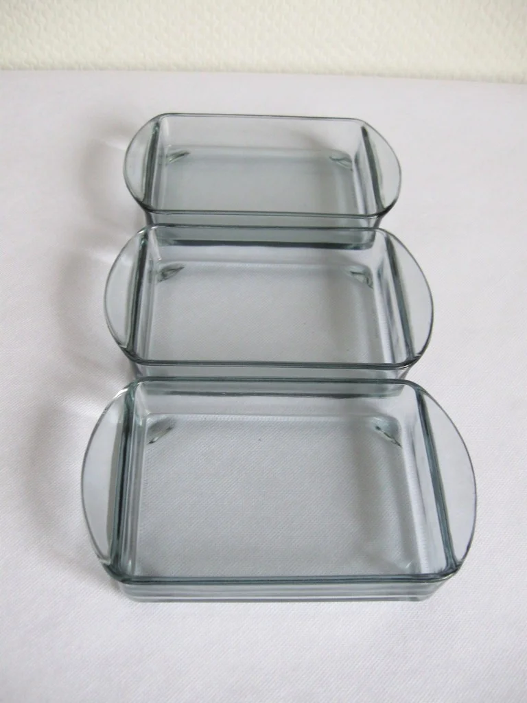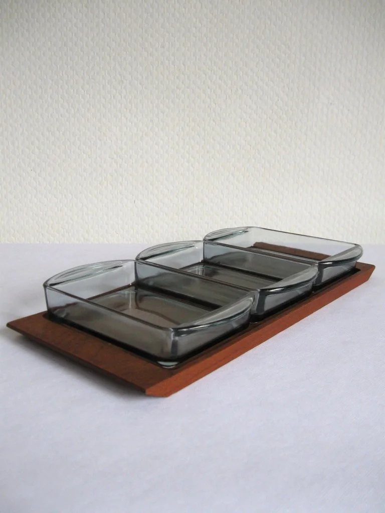 The cabaret consists of three glass bowls and a wooden tray.