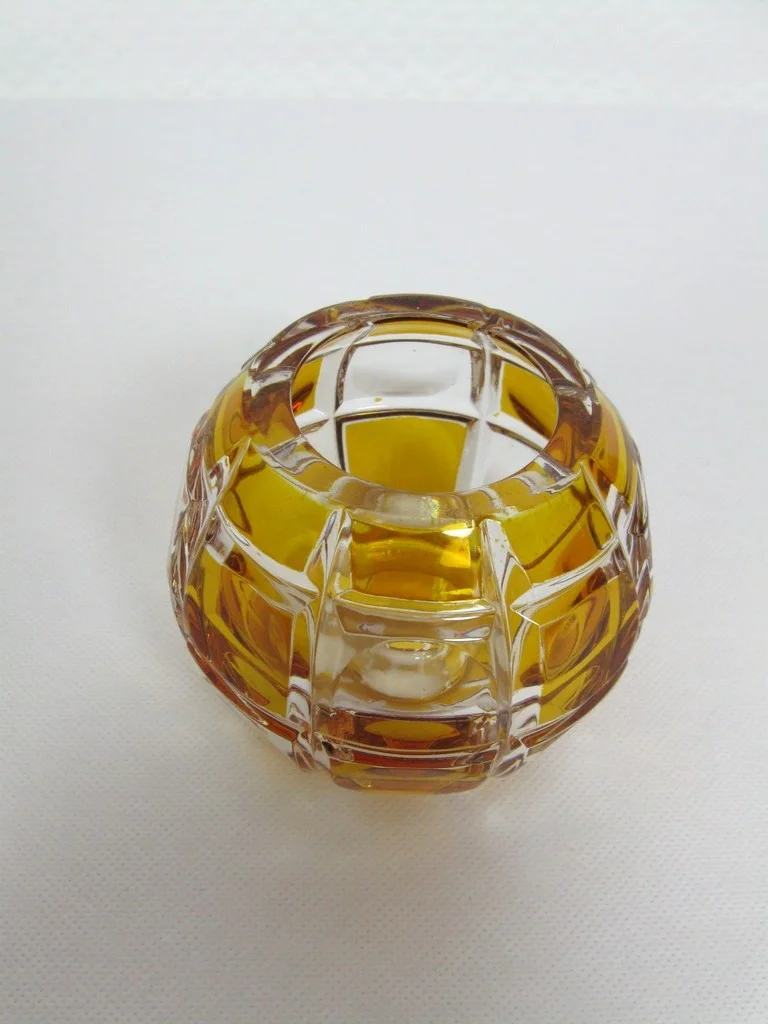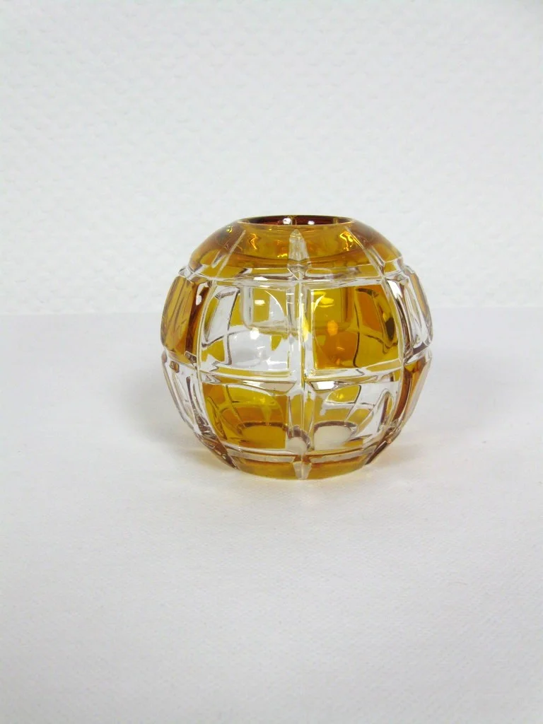 The small ball is made of transparent and amber coloured glass and is ground flat all around.