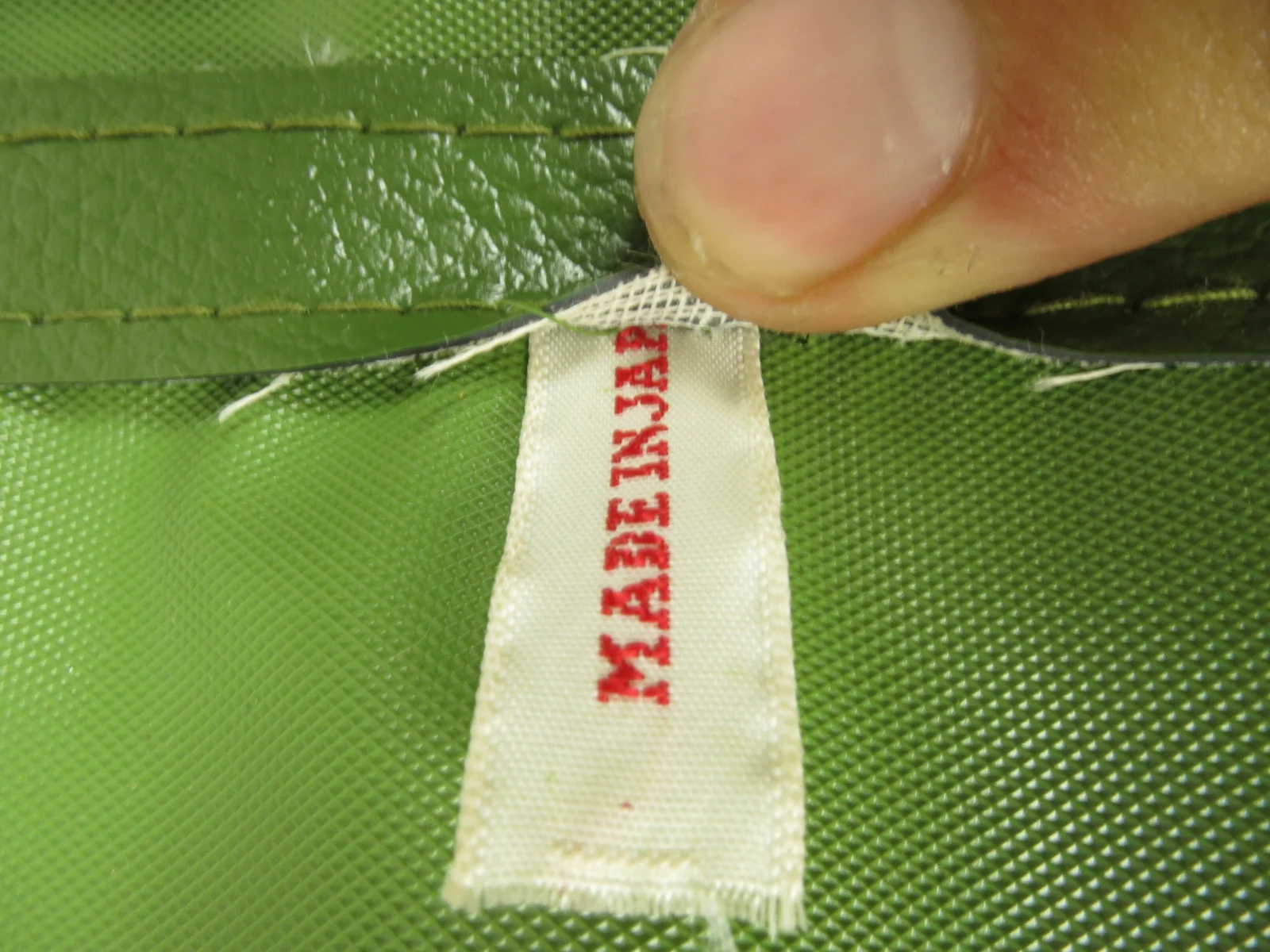The case is covered with 70's retro fabric and inside with imitation leather. The handle and the border are also made of green Plastic. It is closed with a zipper and has an additional zipper compartment on the outside. Inside there are two garment straps and a side pocket with press stud