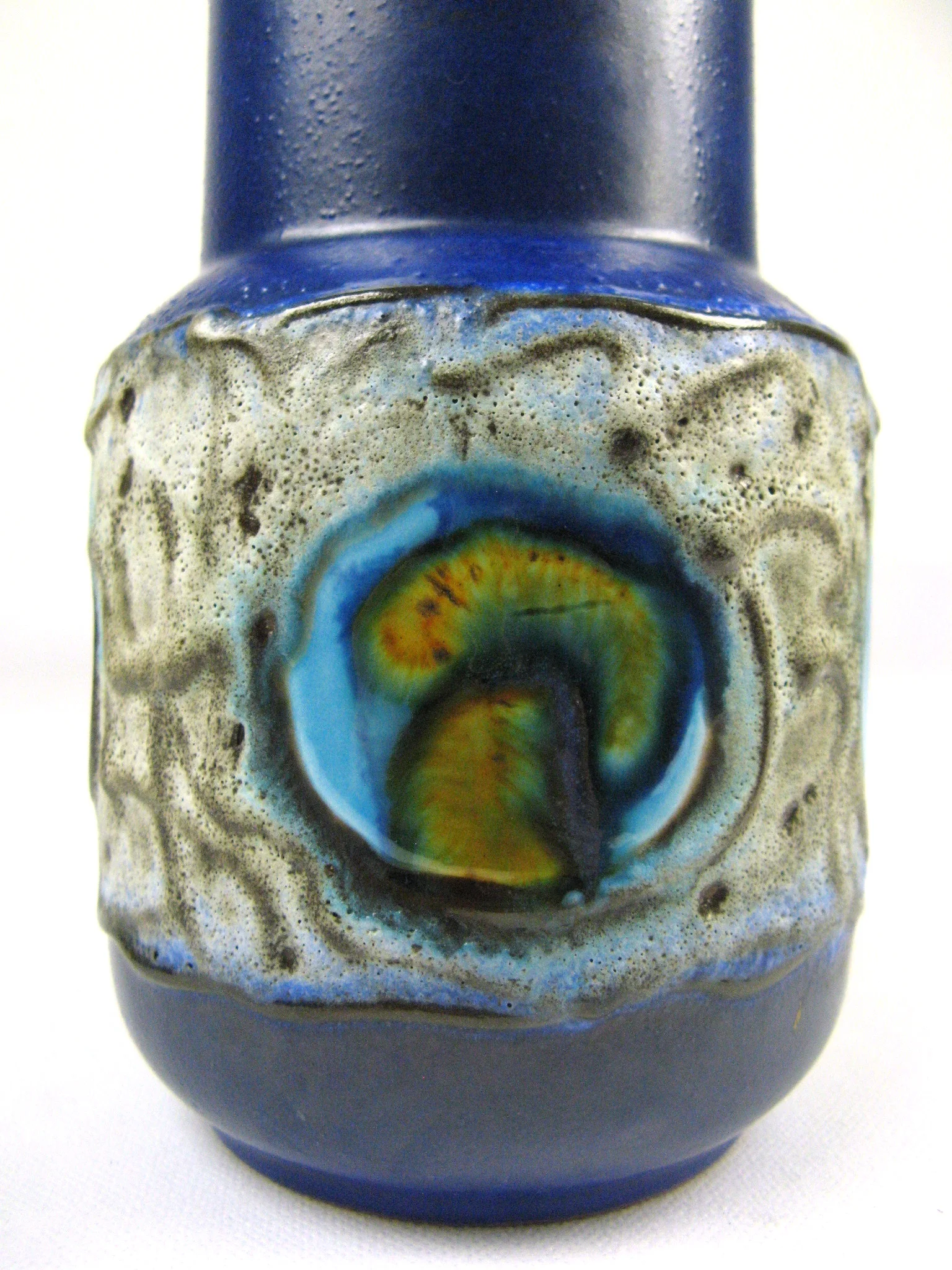 White matt glaze with small round shiny blue/yellow circles is applied to the satin matt glaze in cobalt blue. These look like little round windows. Inside is the vase glossy light brown glazed.