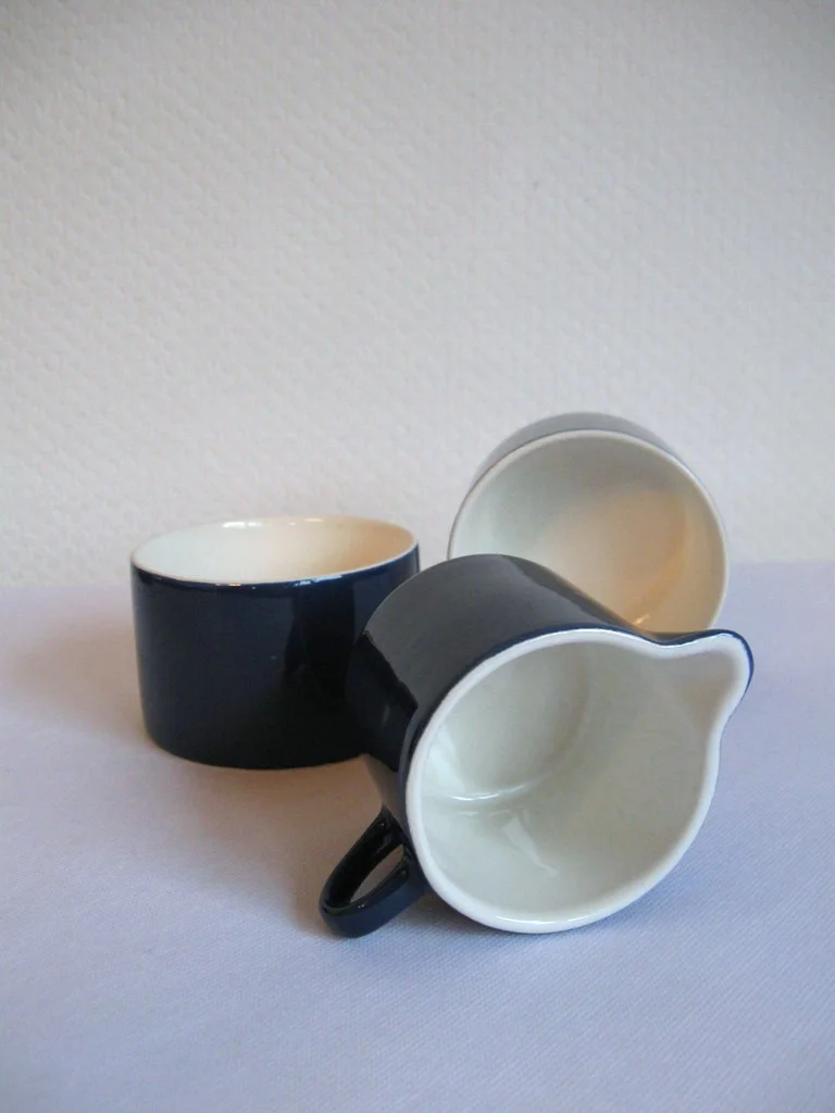 The set consists of two coffee pots, a milk jug, two sugar bowls, six cups and six saucers. All parts are made of glazed ceramic.