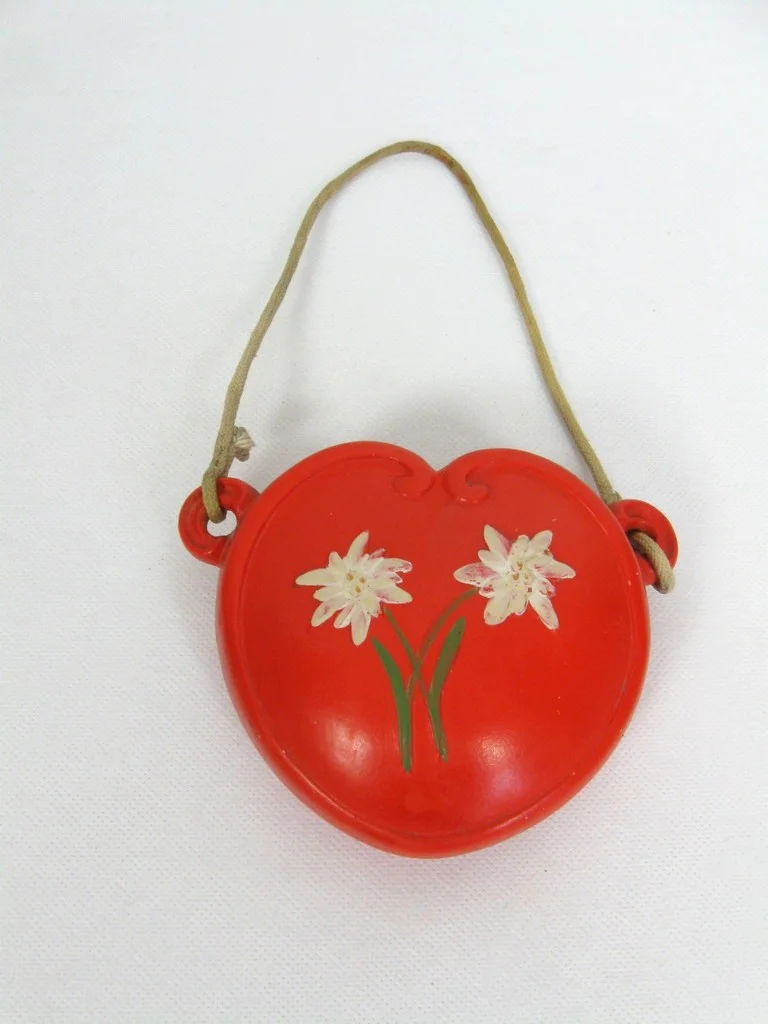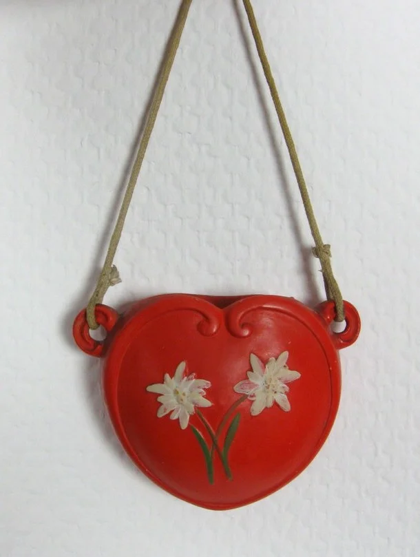 The vase is made of glazed ceramic, tipped with edelweiss and hangs on a fabric ribbon!