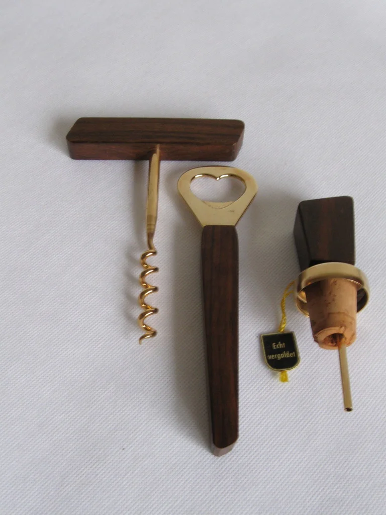 The set consists of cap lifter, corkscrew and spout. The utensils are made of genuine gold-plated metal and have precious wood handles. They are arranged in a gift box (slightly damaged).