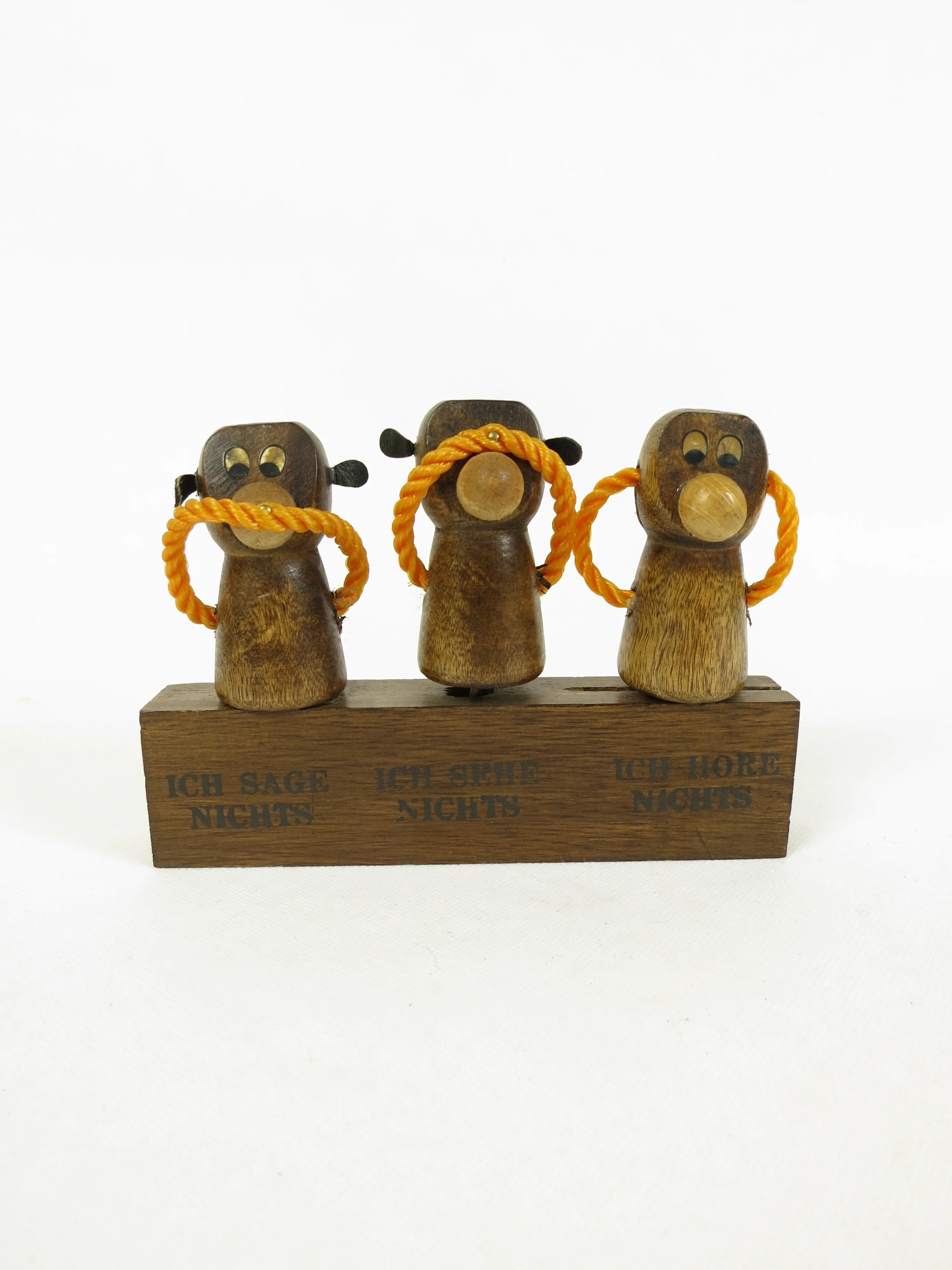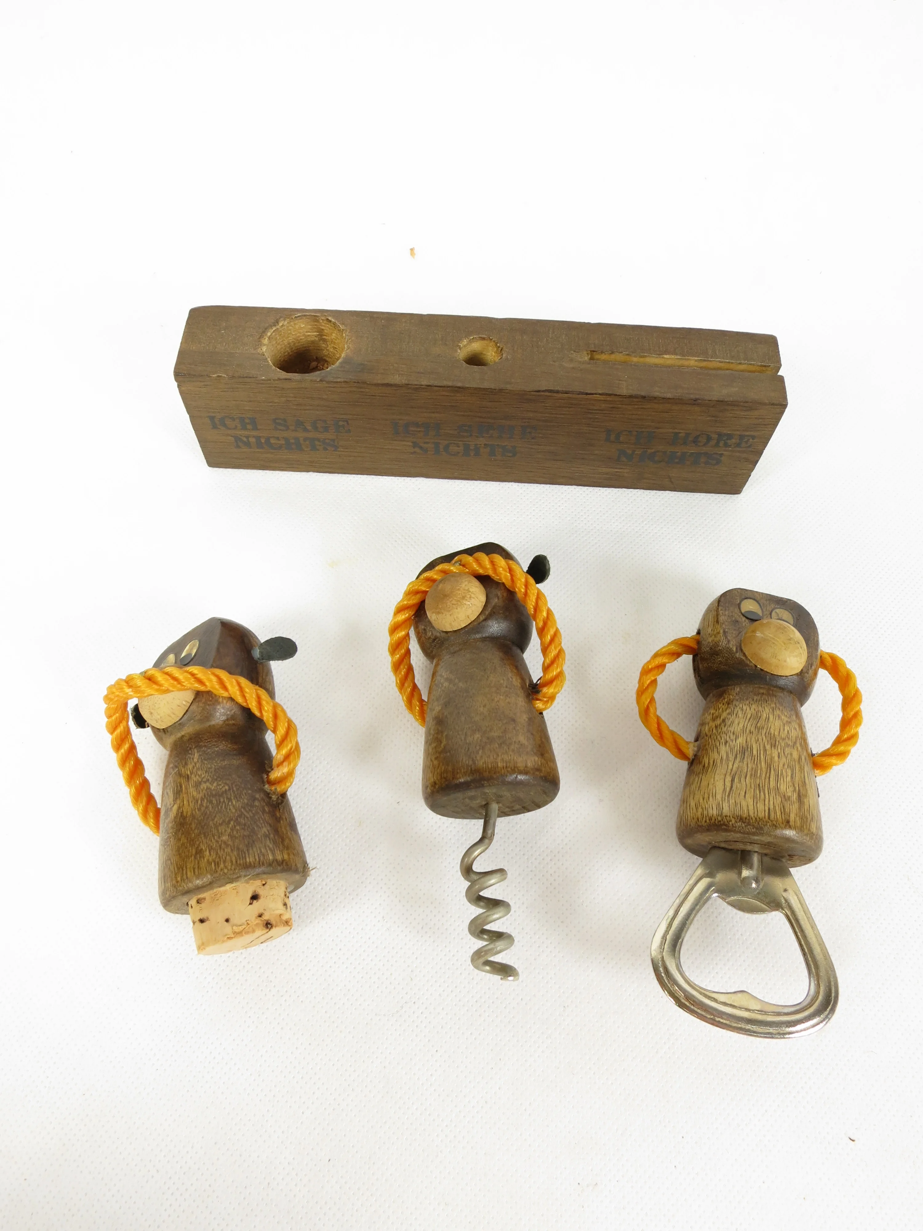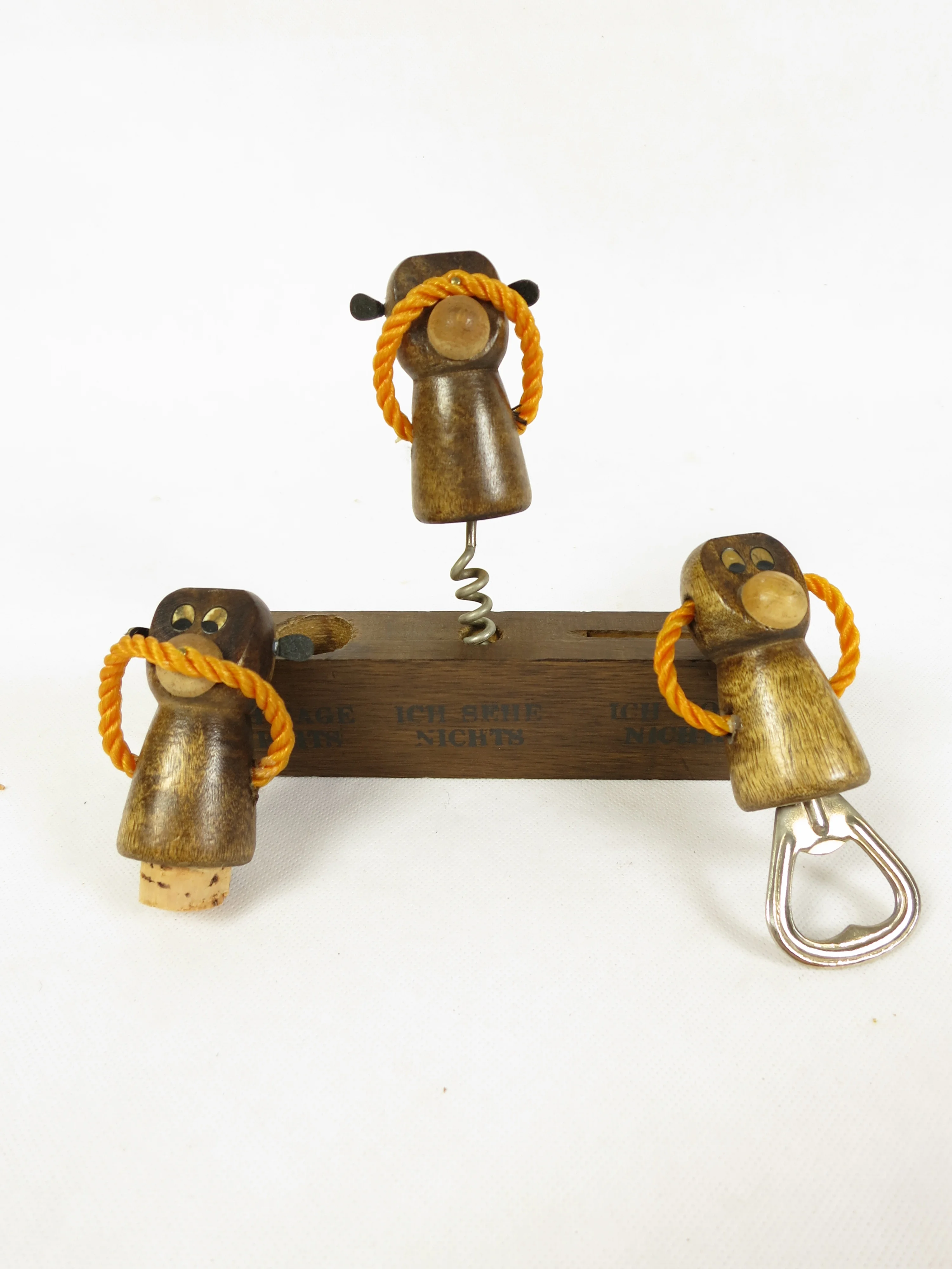 Three wooden monkeys are designed as corkscrews, first corks and bottle openers.