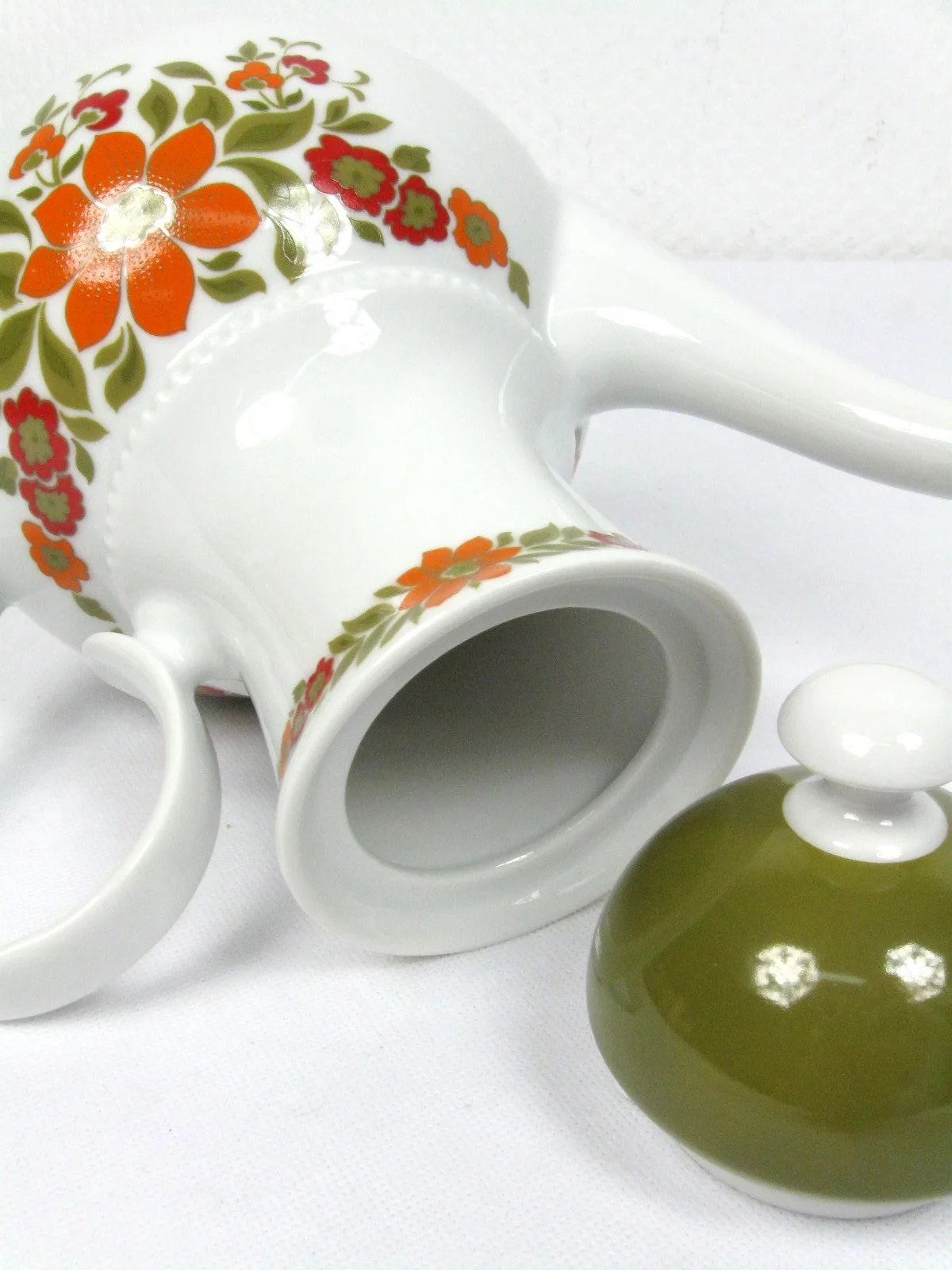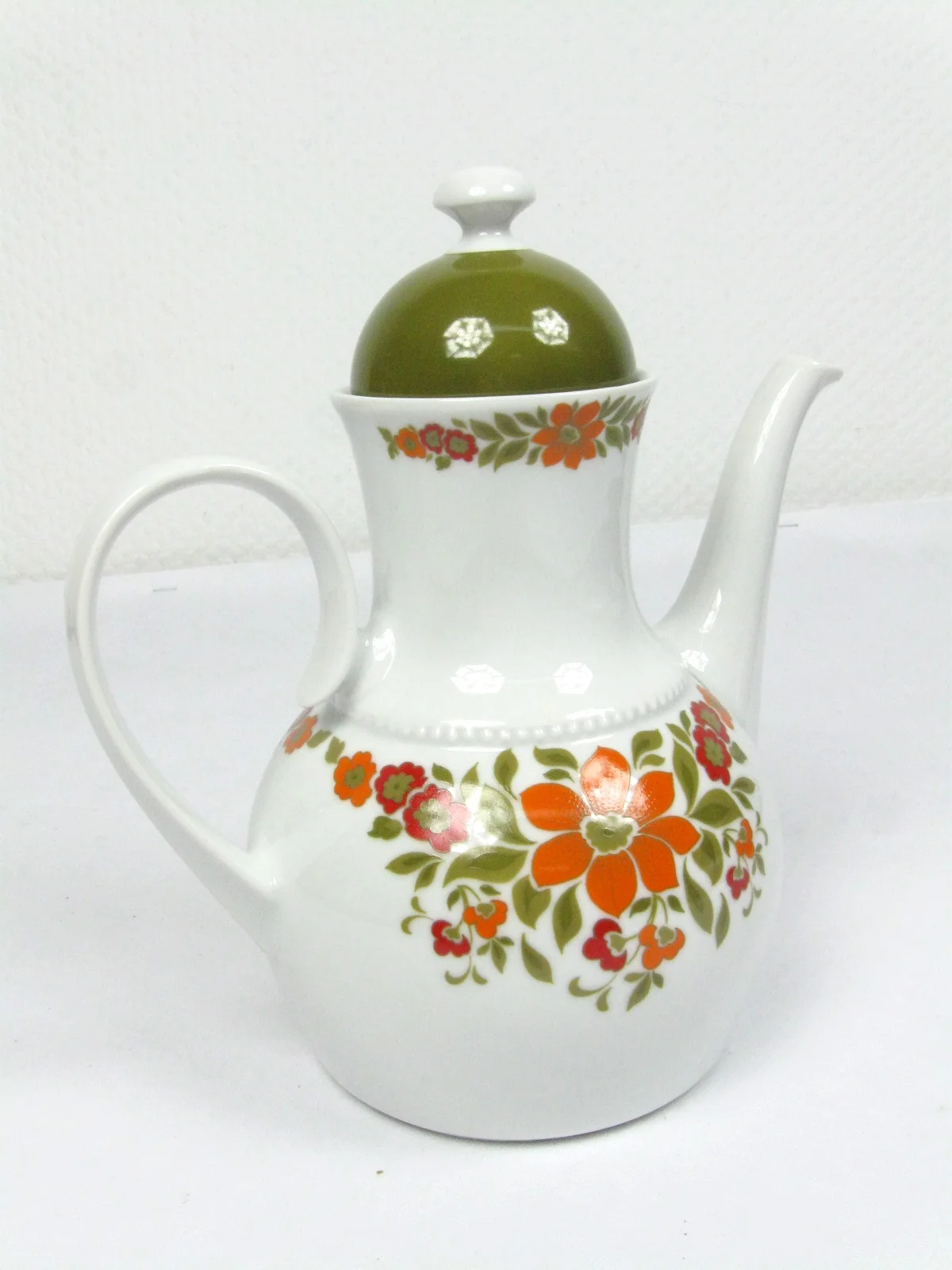 This porcelain pot is typical for the 70s in shape and colour.