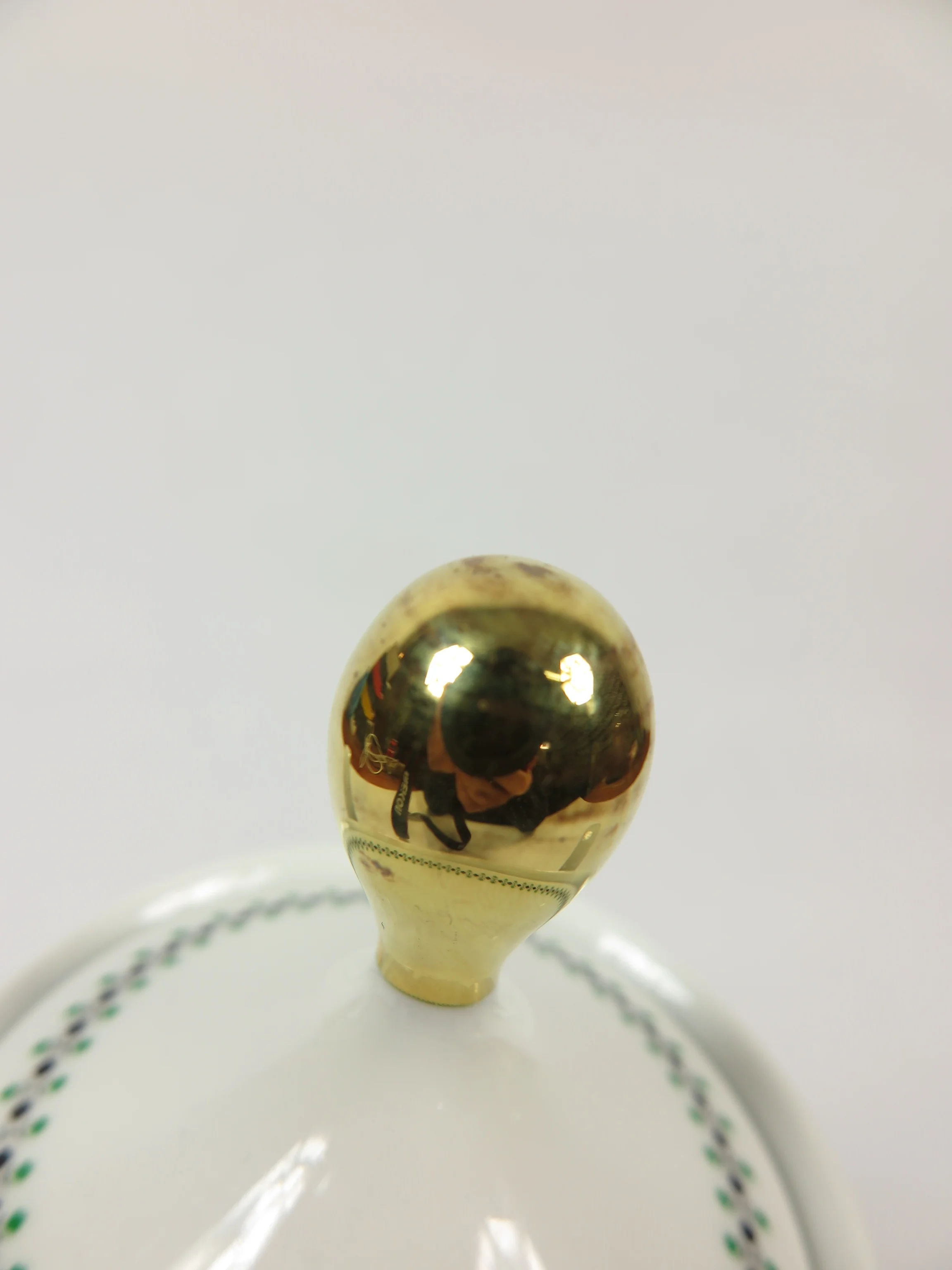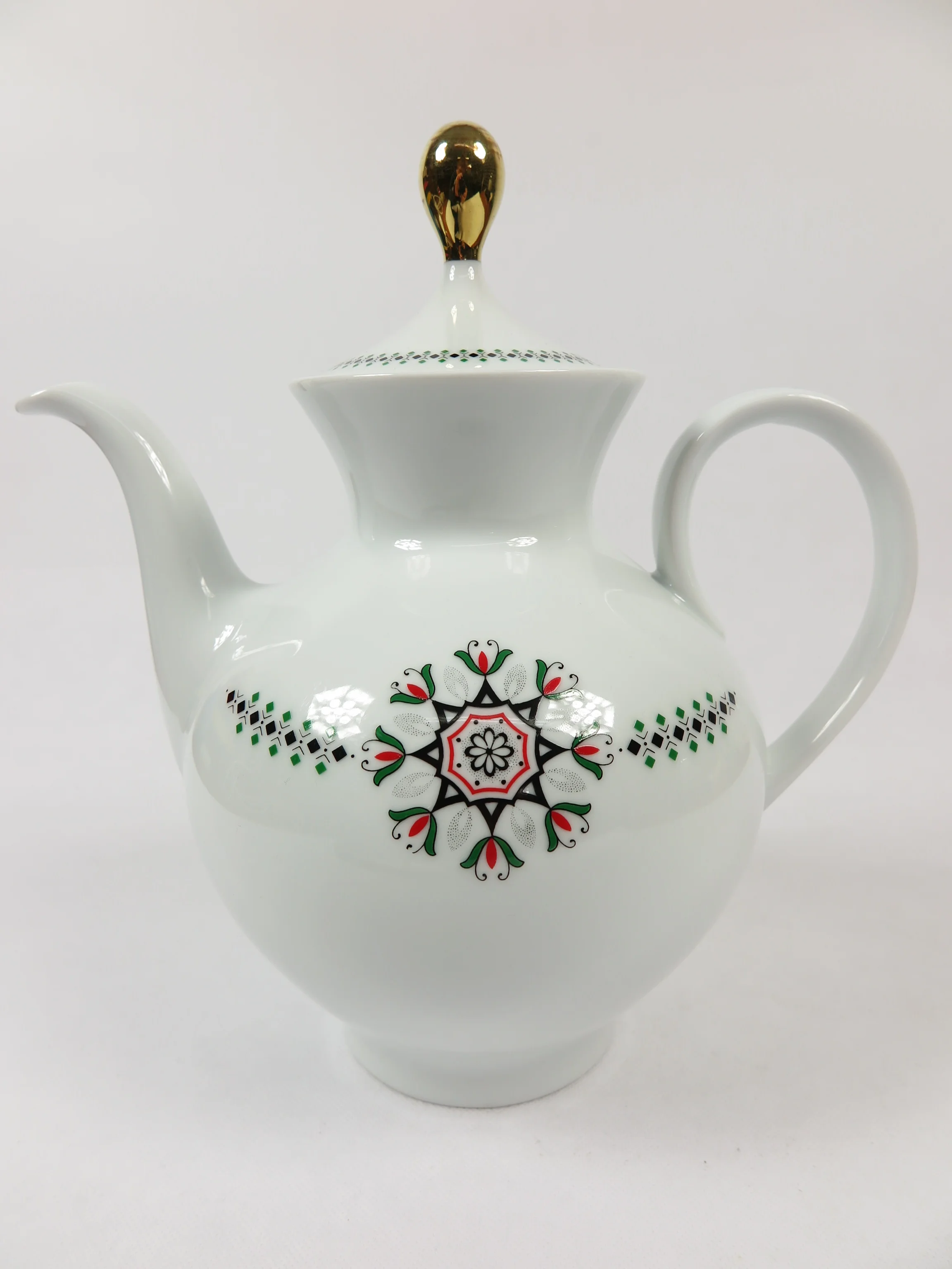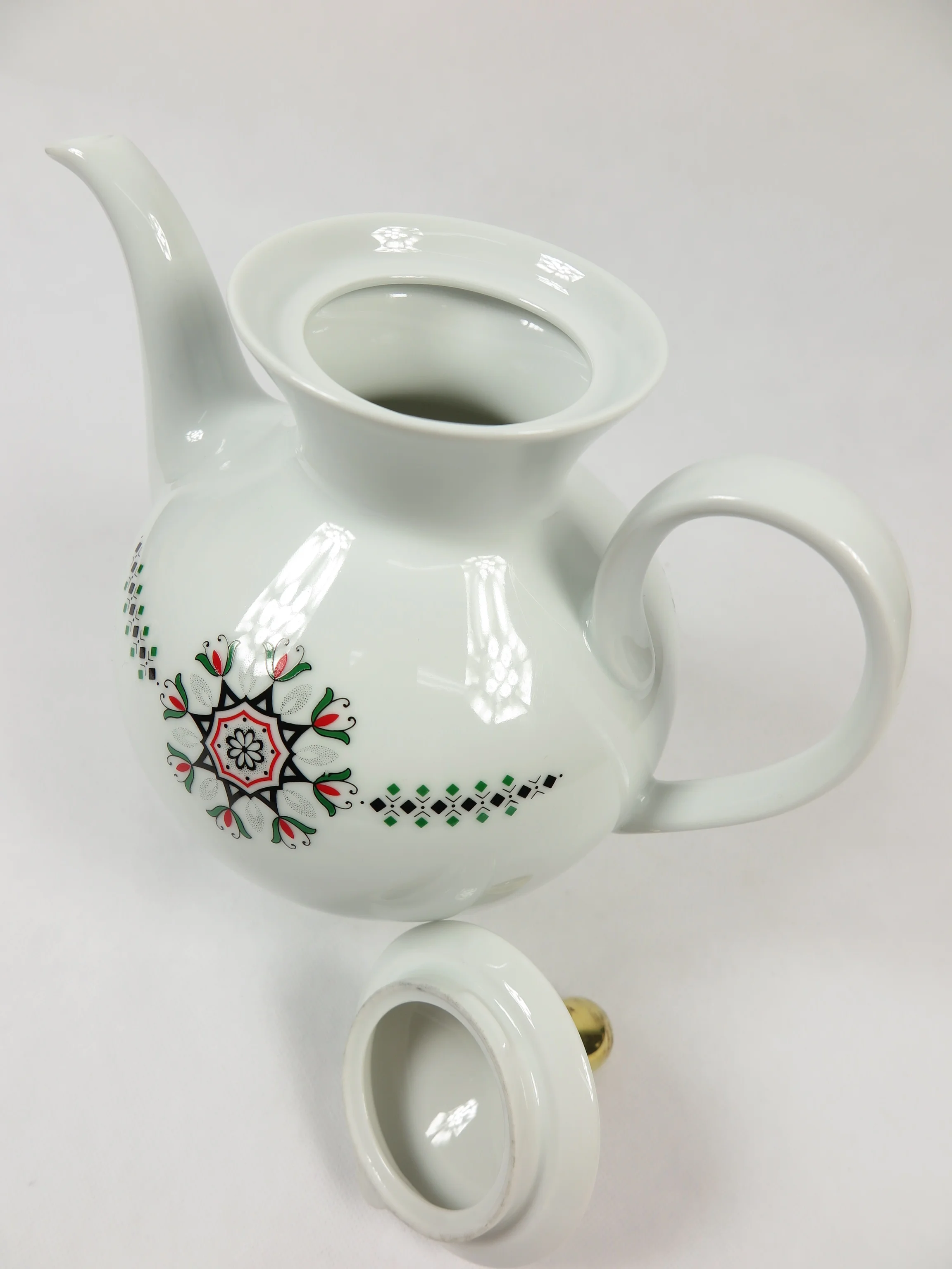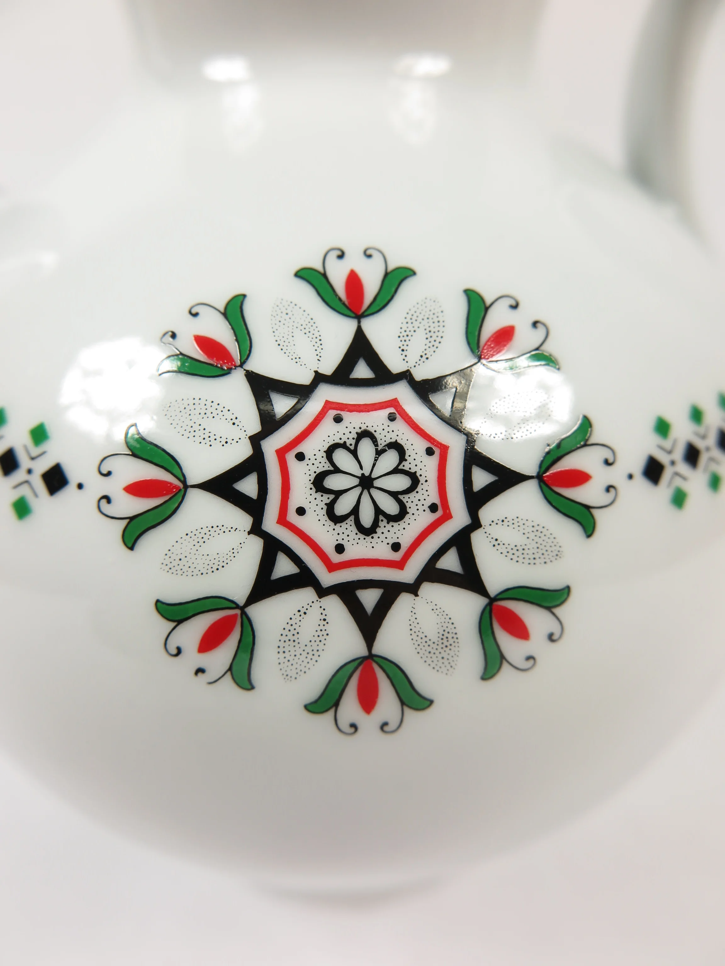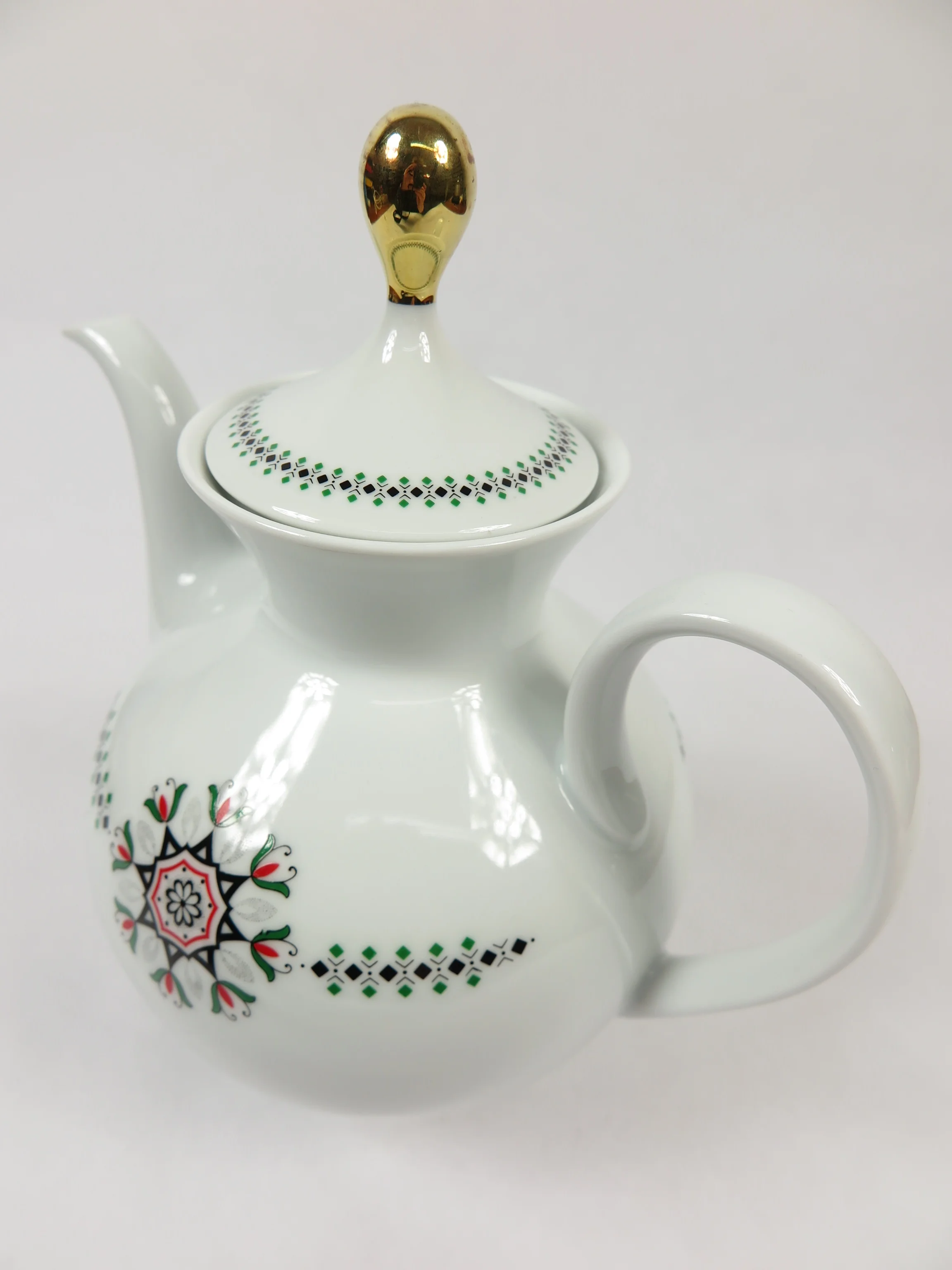This porcelain jug is decorated with a flower ornament, diced diamonds and a golden lid knob