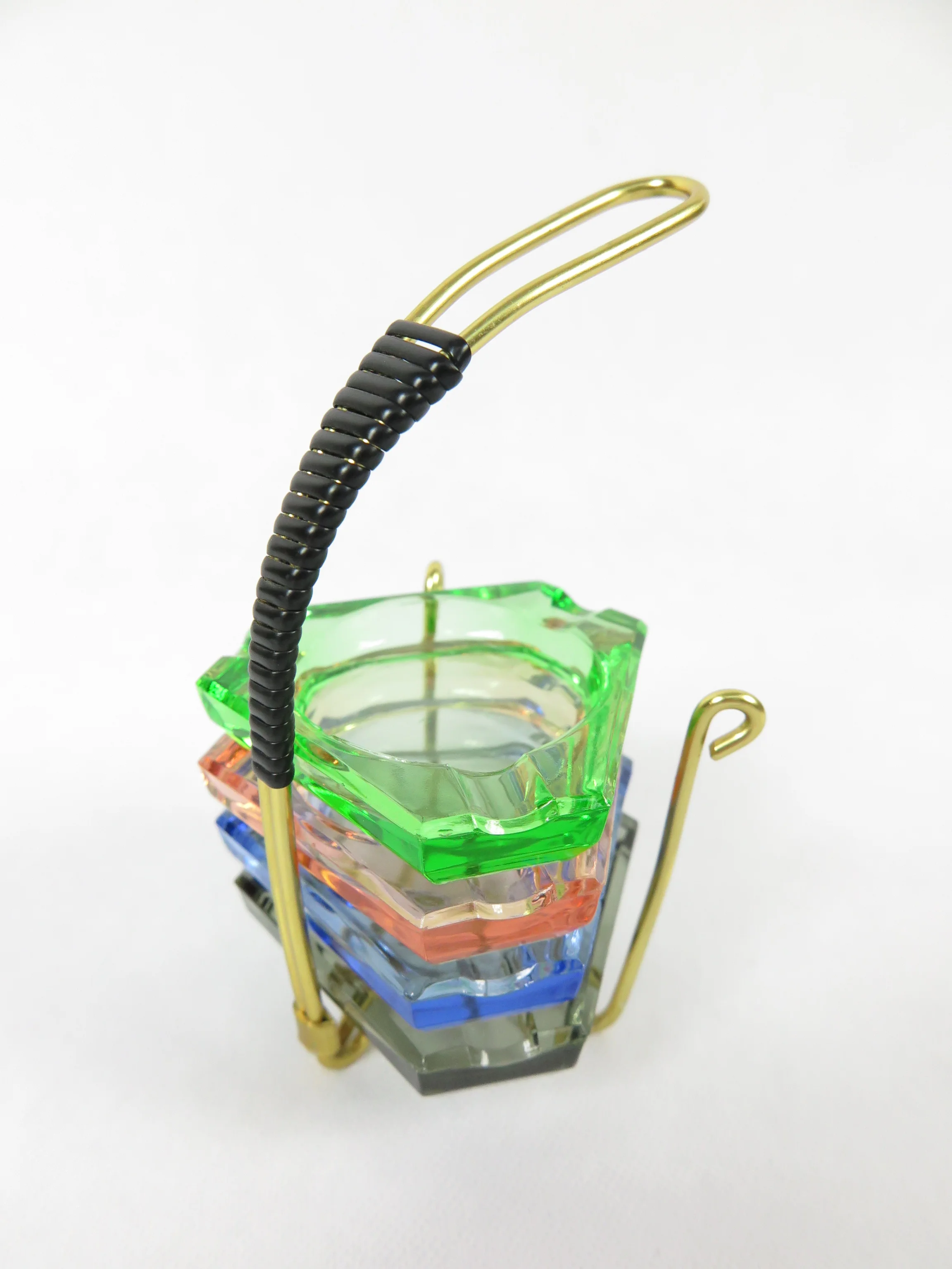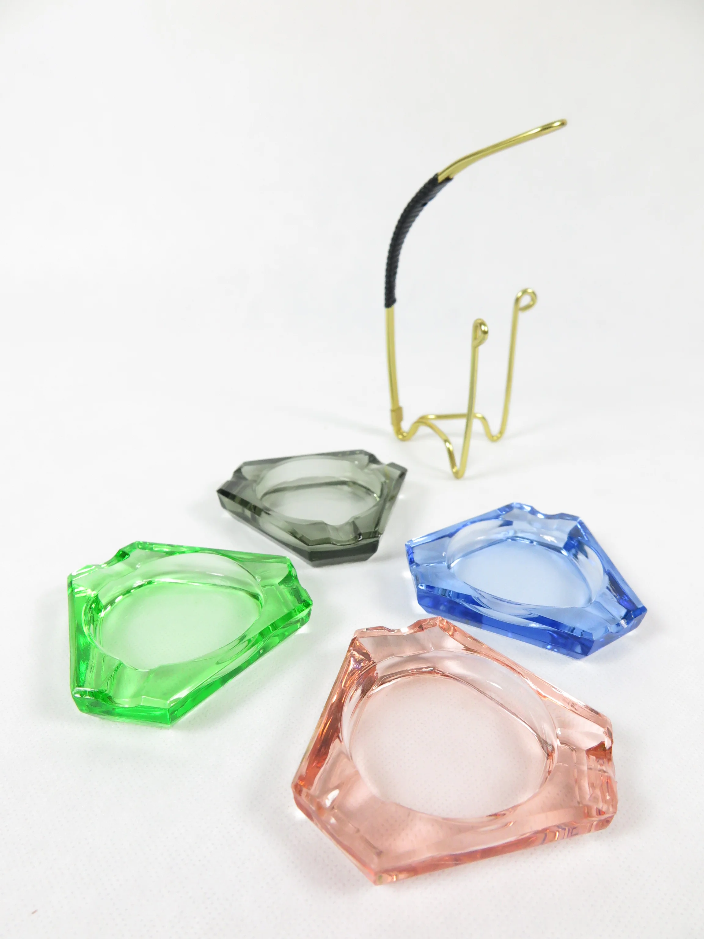 The ashtrays are made of colored glass and for their age in a very good condition. The set consists of 4 ashtrays and one Brass frame.