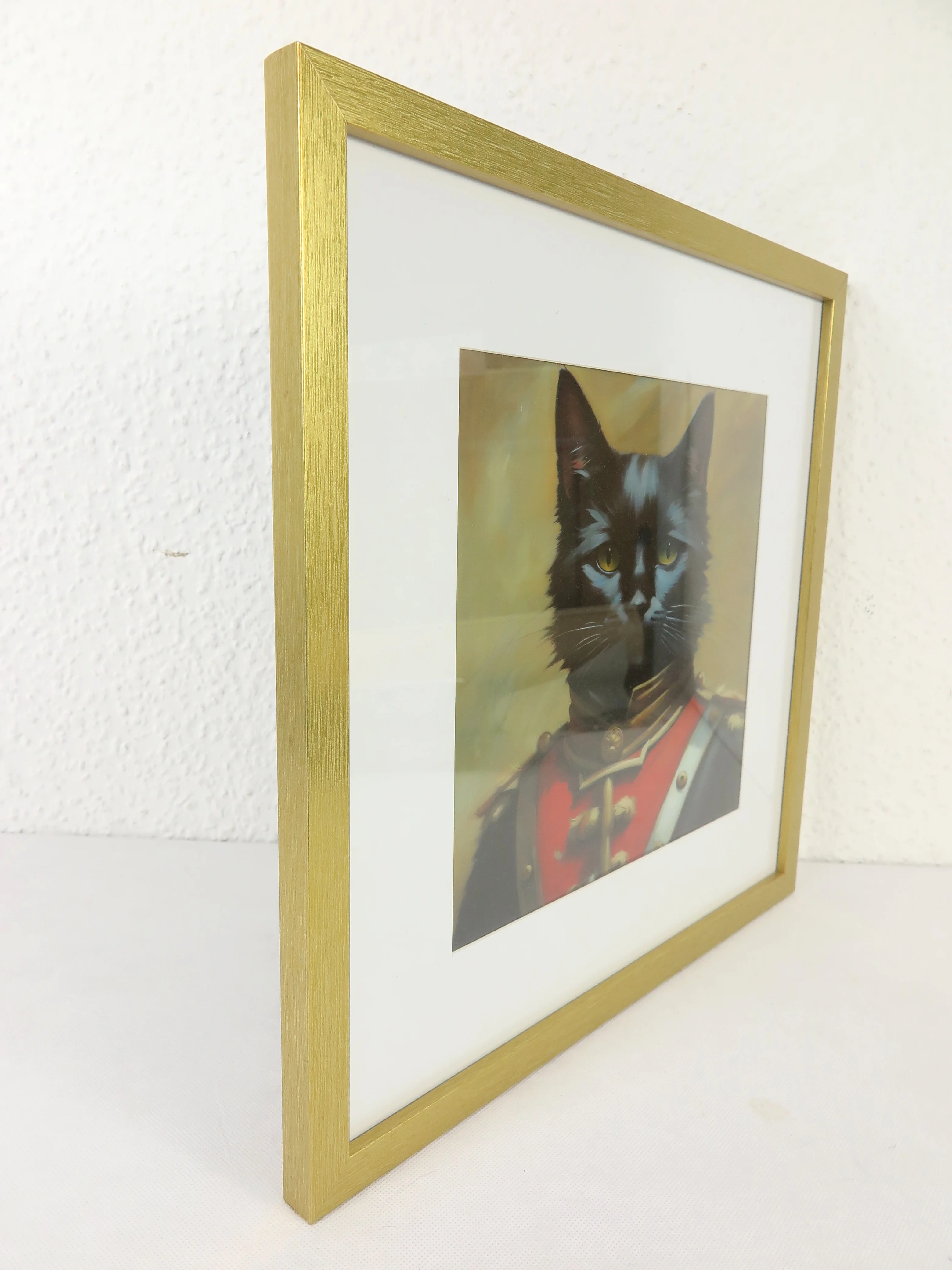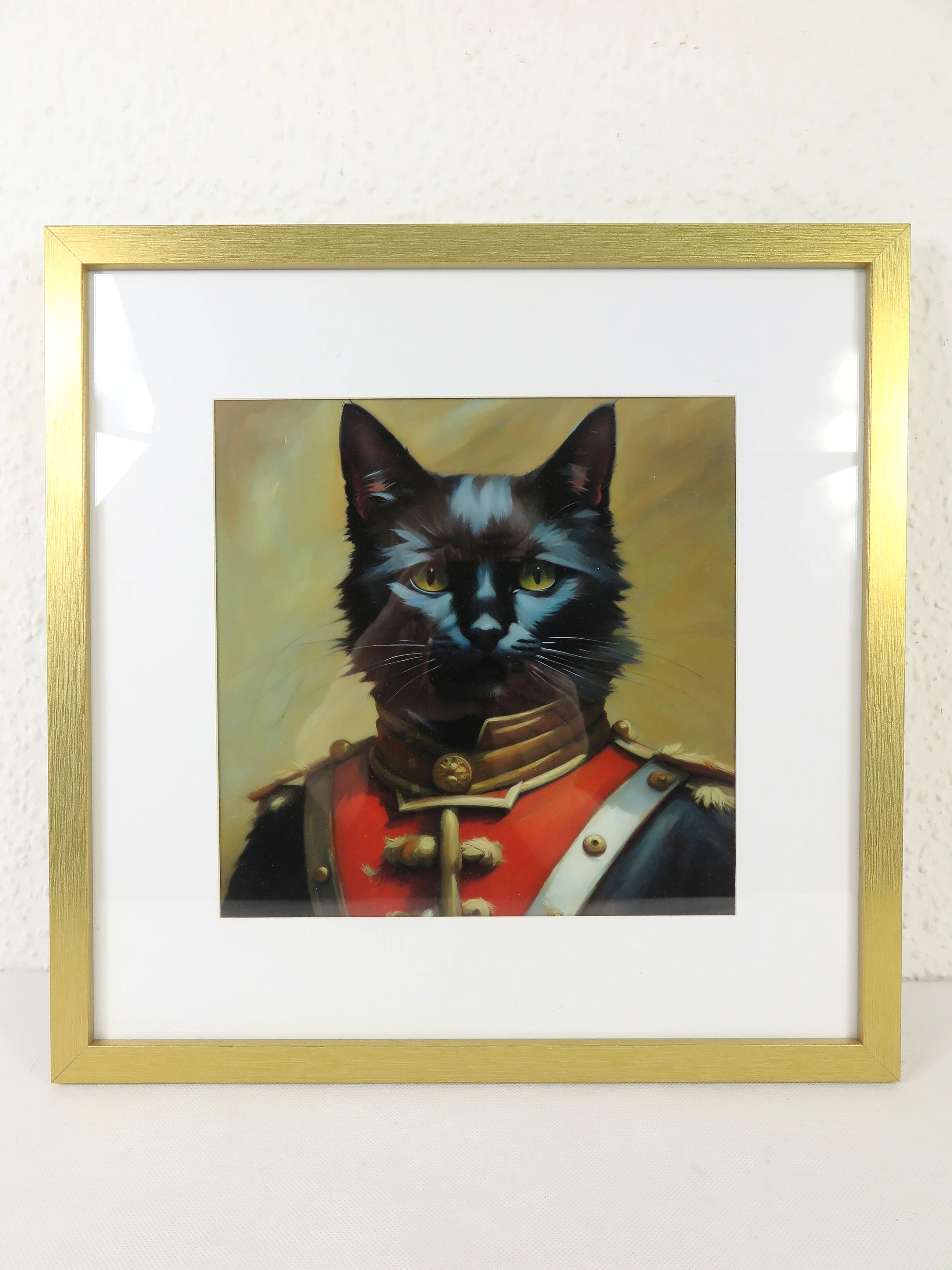 Cat picture designed with the computer and printed on foil. The picture is framed with a passe-partout in a picture frame. The pane is made of HD glass, the frame is made of MDF wood.