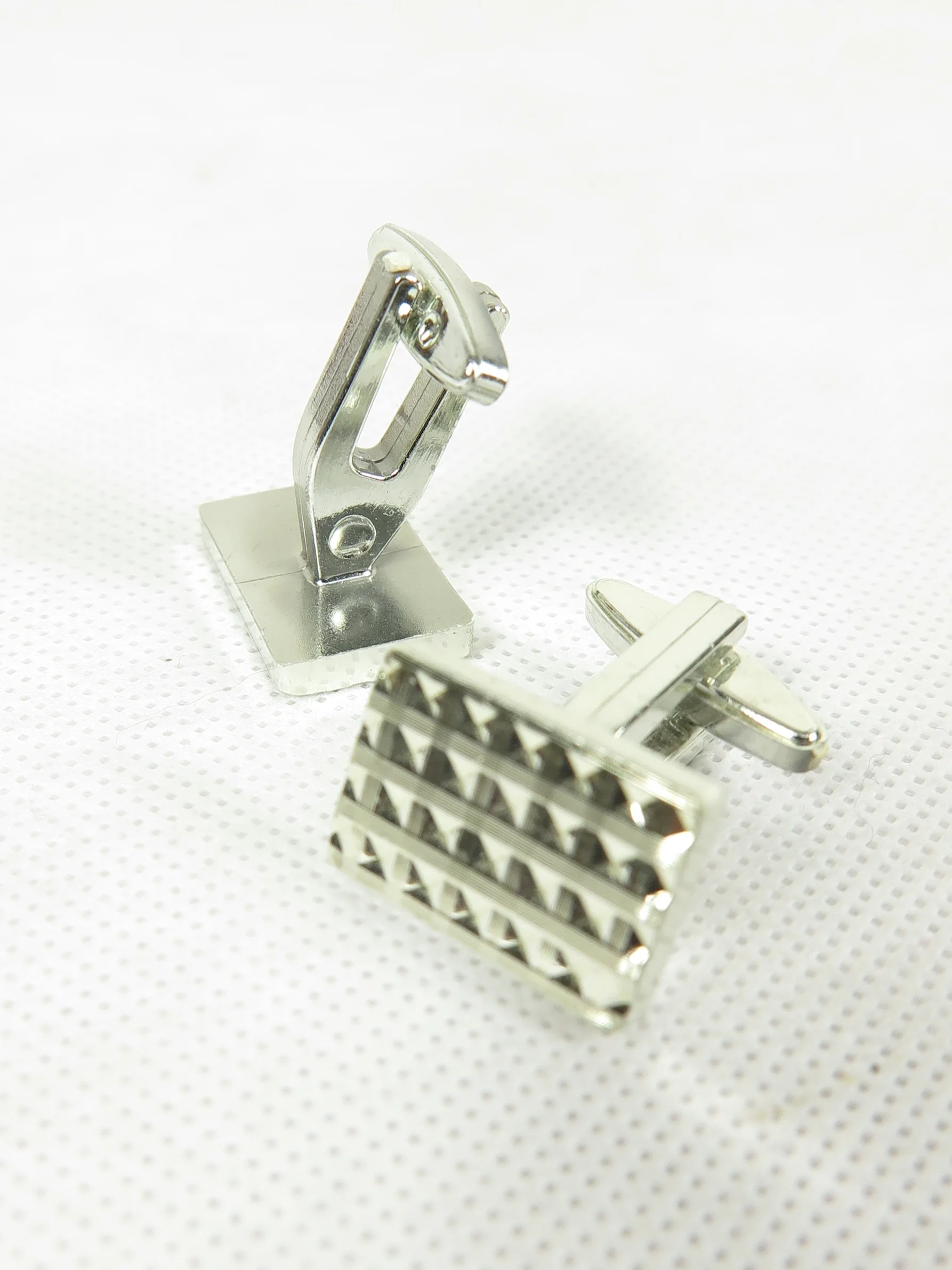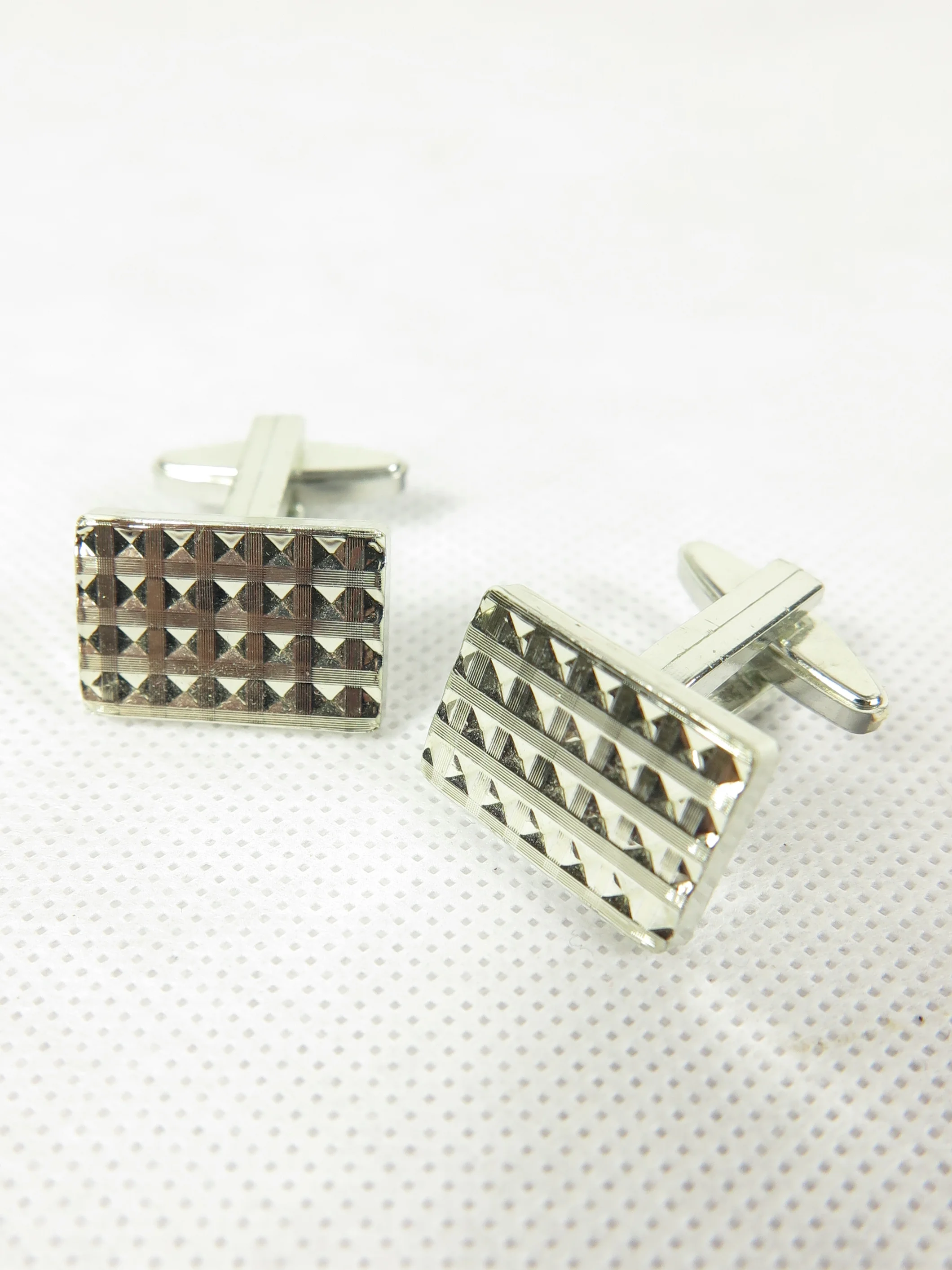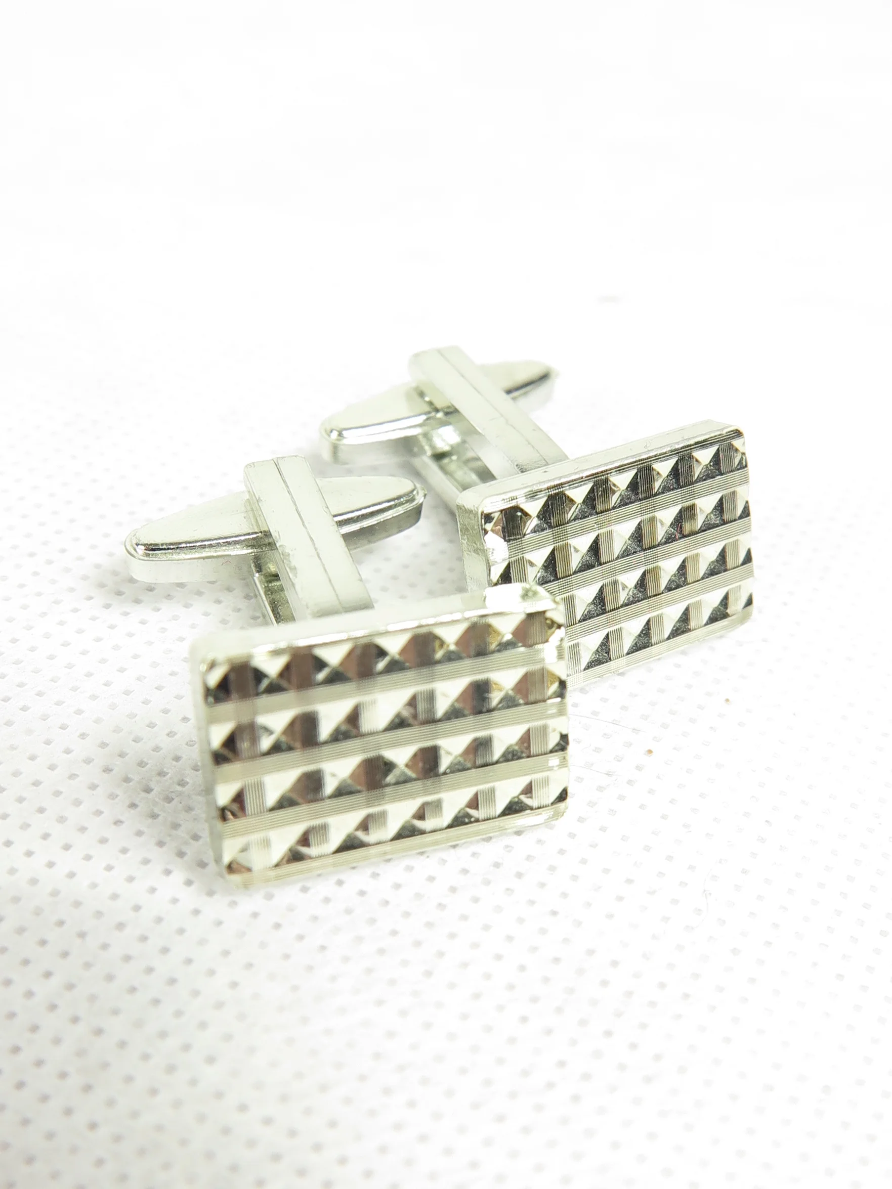 The geometric pattern is deeply embossed into the cufflink, so the light refracts beautifully in the chrome-plated metal.