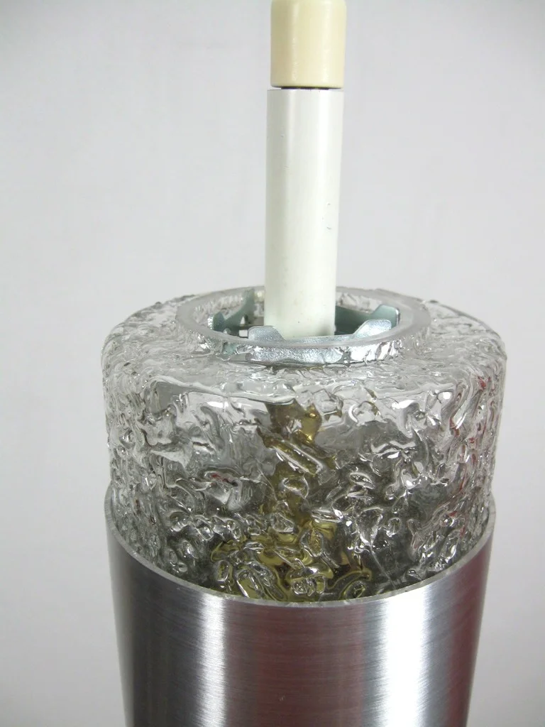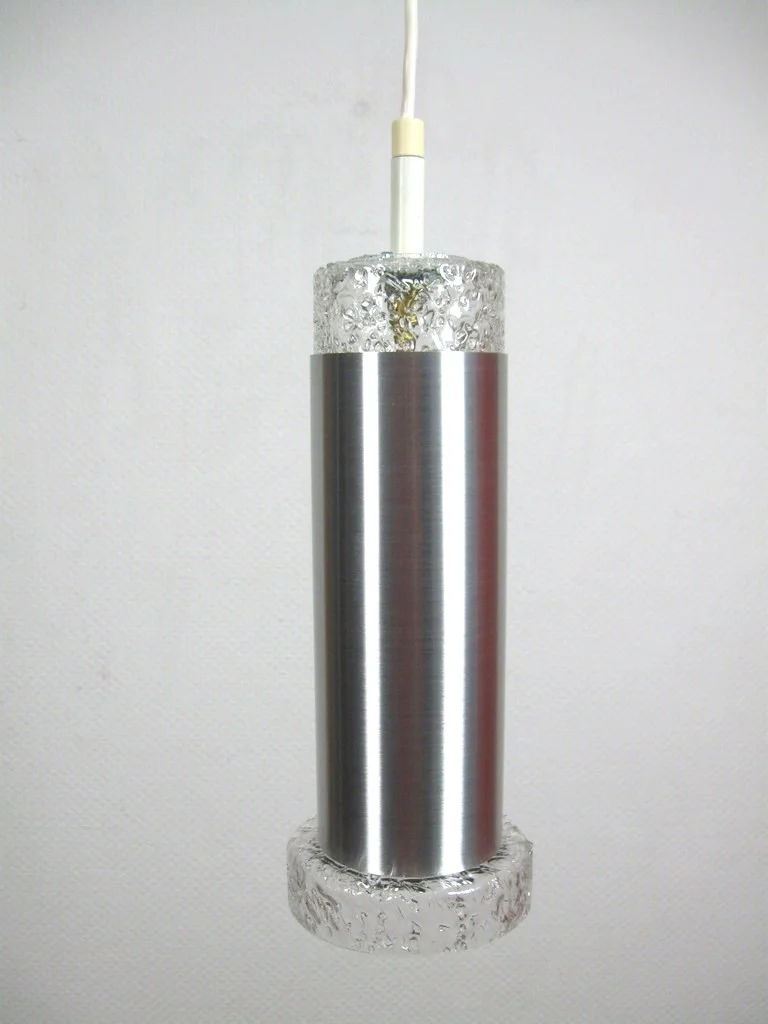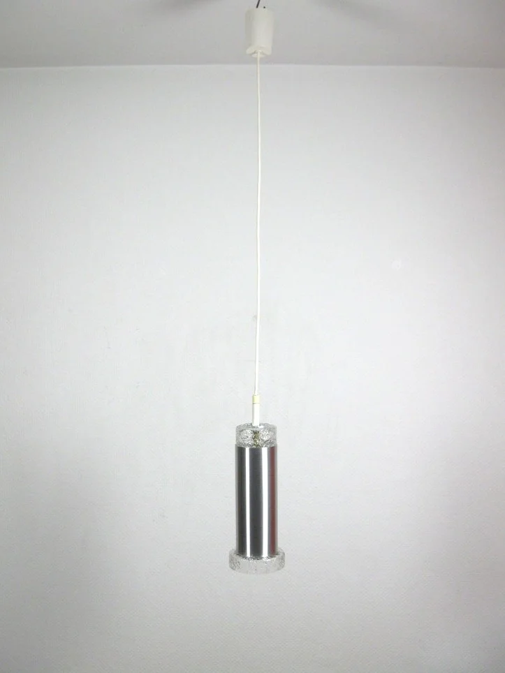 The lamp consists of a hand-made and mouth-blown glass shade and a cerchrome metal cylinder. The socket is made of metal and serves as a holder.