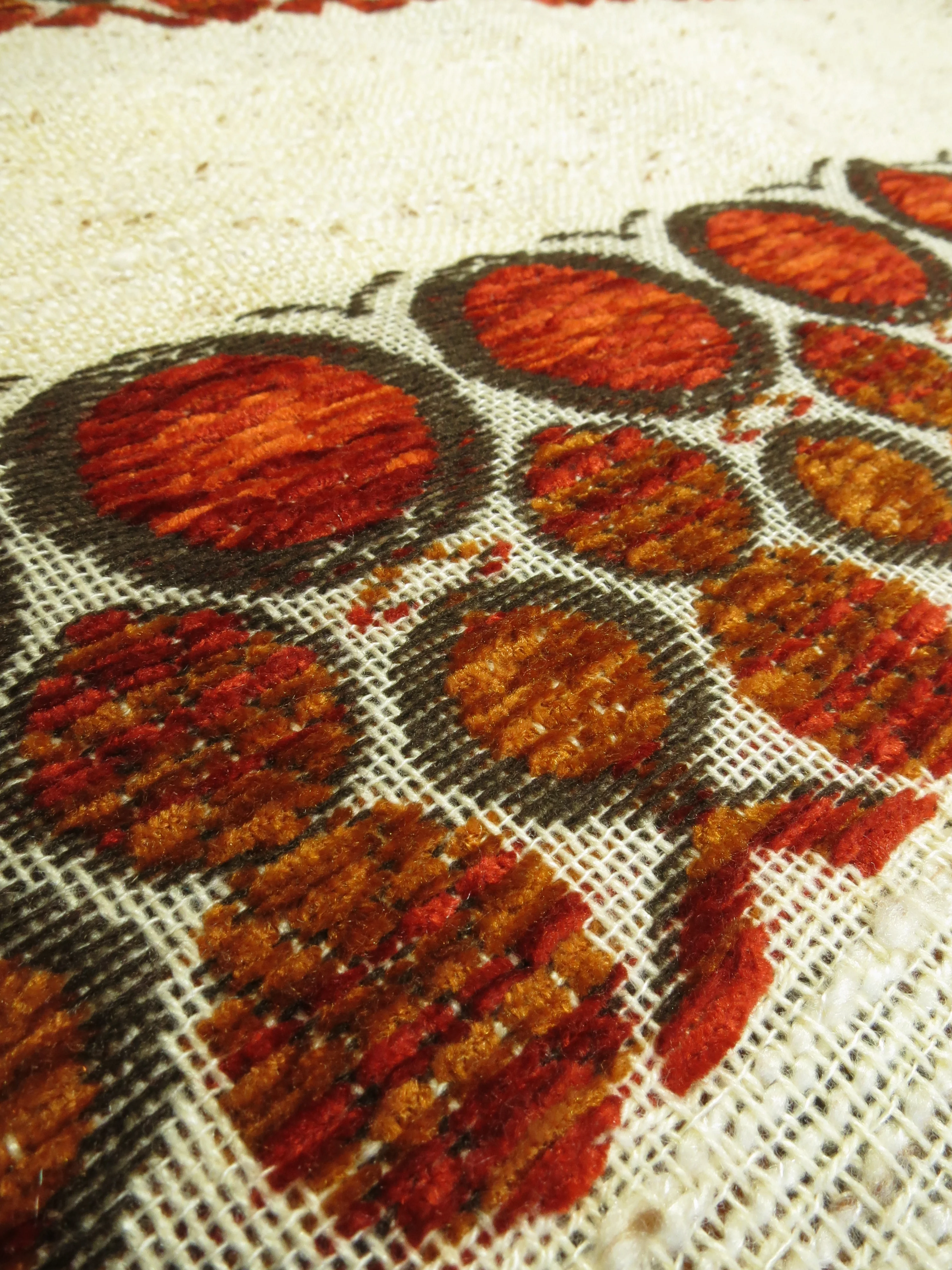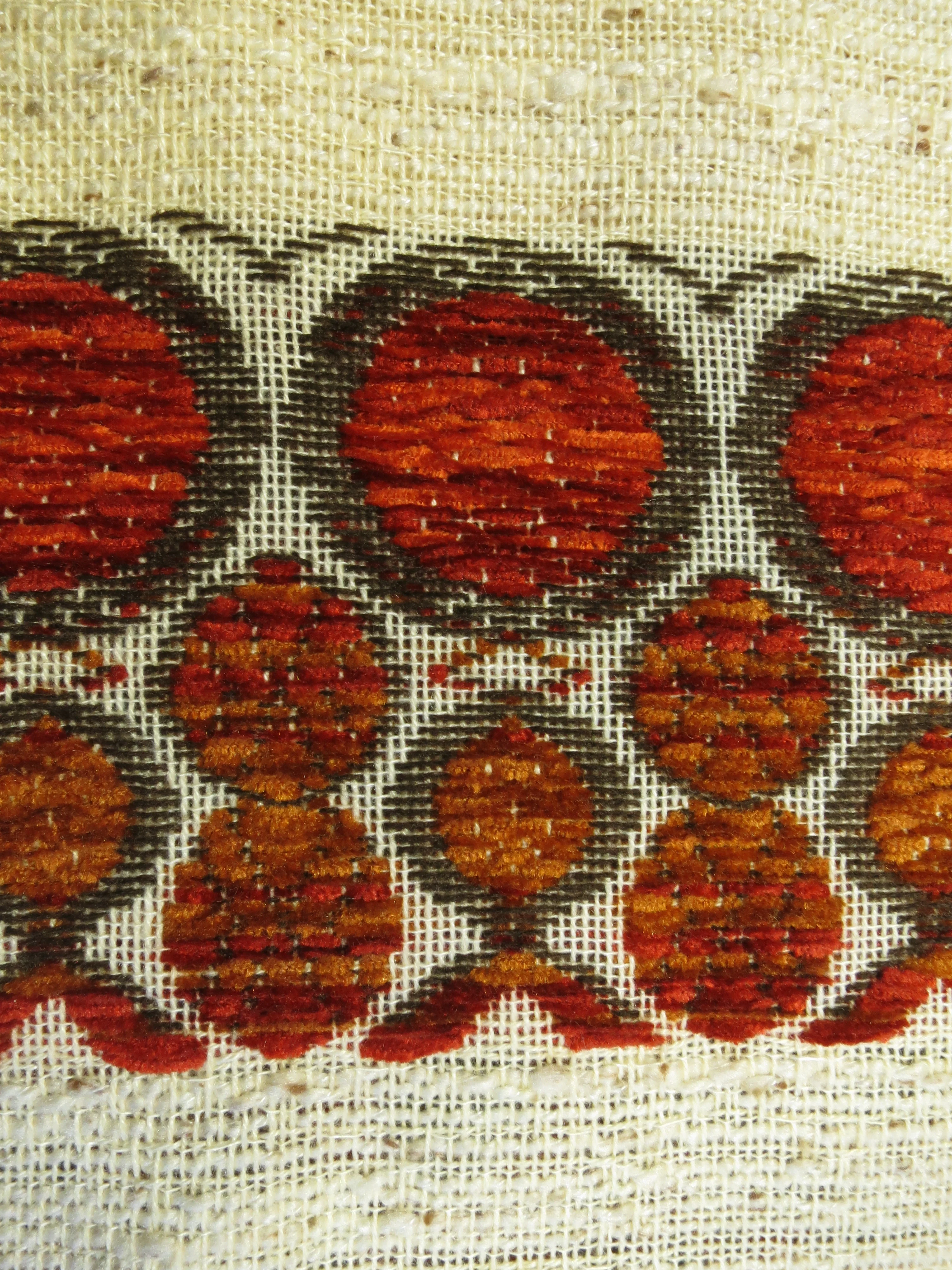 The loosely woven linen or woven in wild silk look is not yet used and is of the best quality, especially the circular pattern woven with chenille wool is beautiful. This looks like colourful velvet threads.