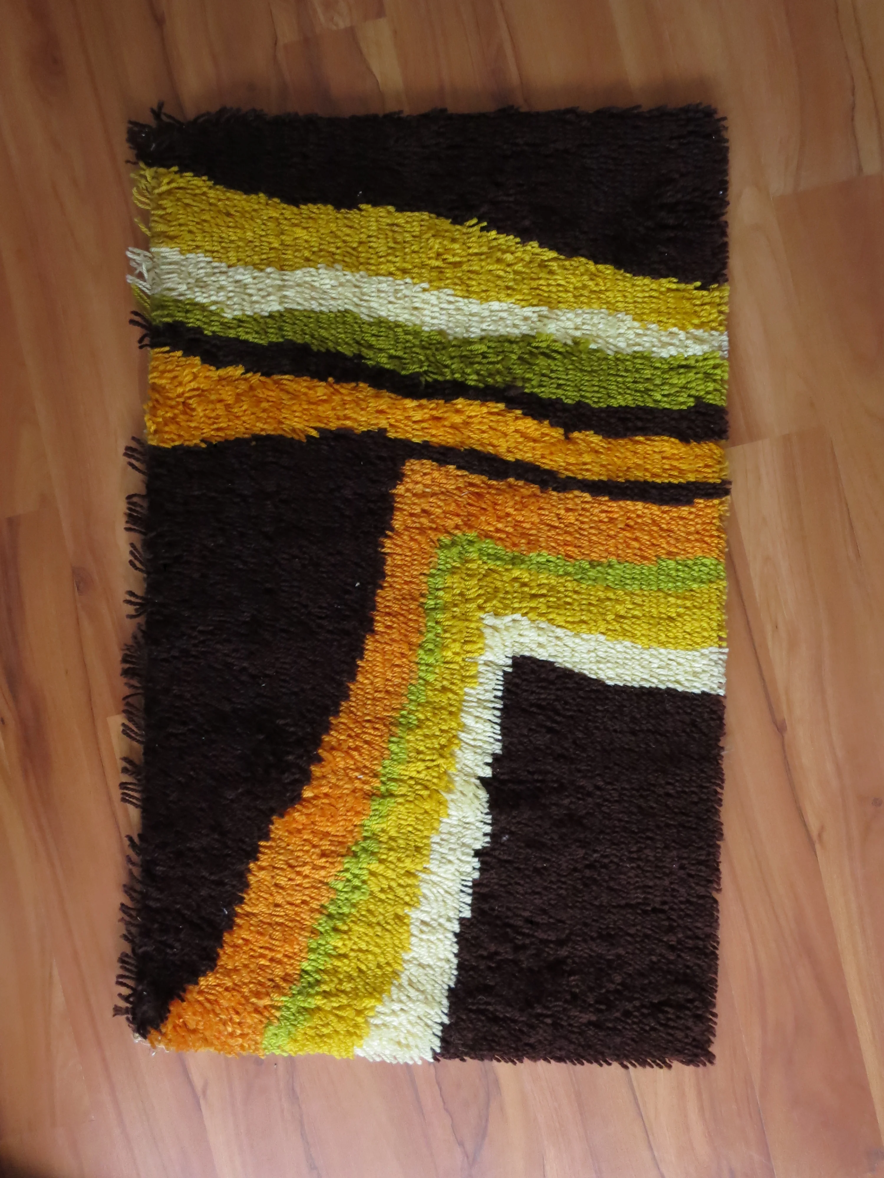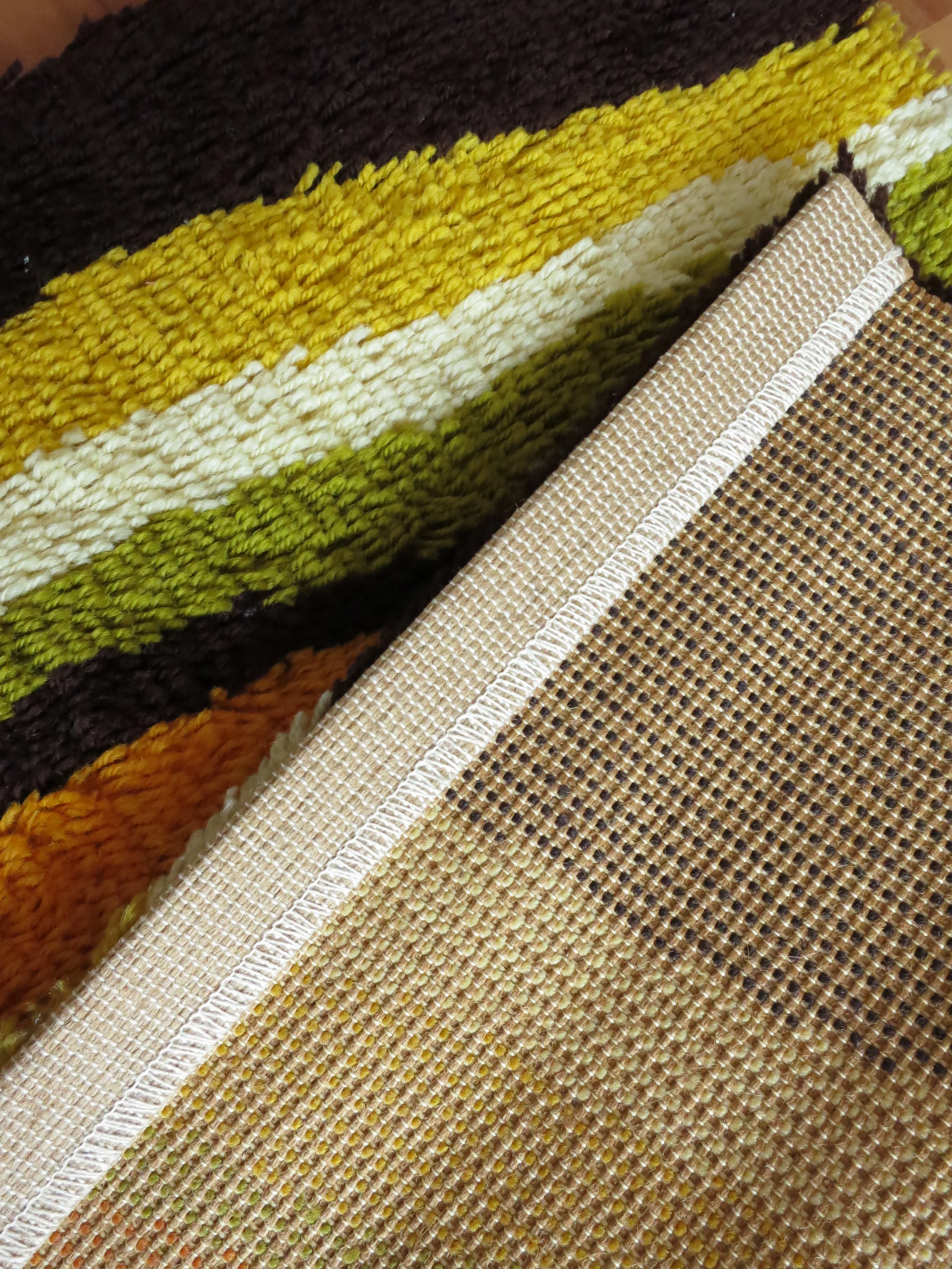 The small carpet is knotted from synthetic fibres and shows a typical 70s motif in orange, dark brown, beige, olive and yellow. The back is woven in strong linen.