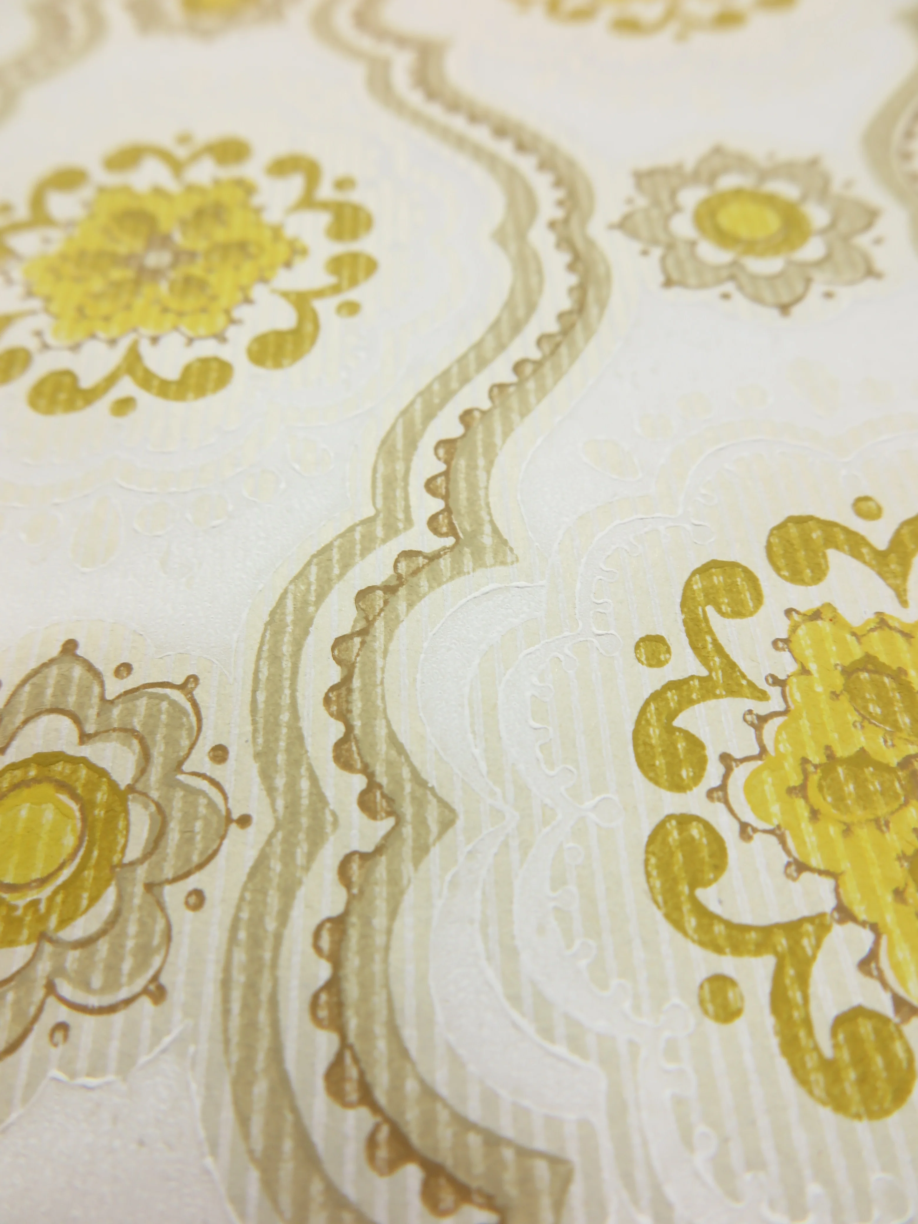 On fine paper, cream-coloured flower ornaments are printed. White, ochre, yellow and brown are available in light colours.