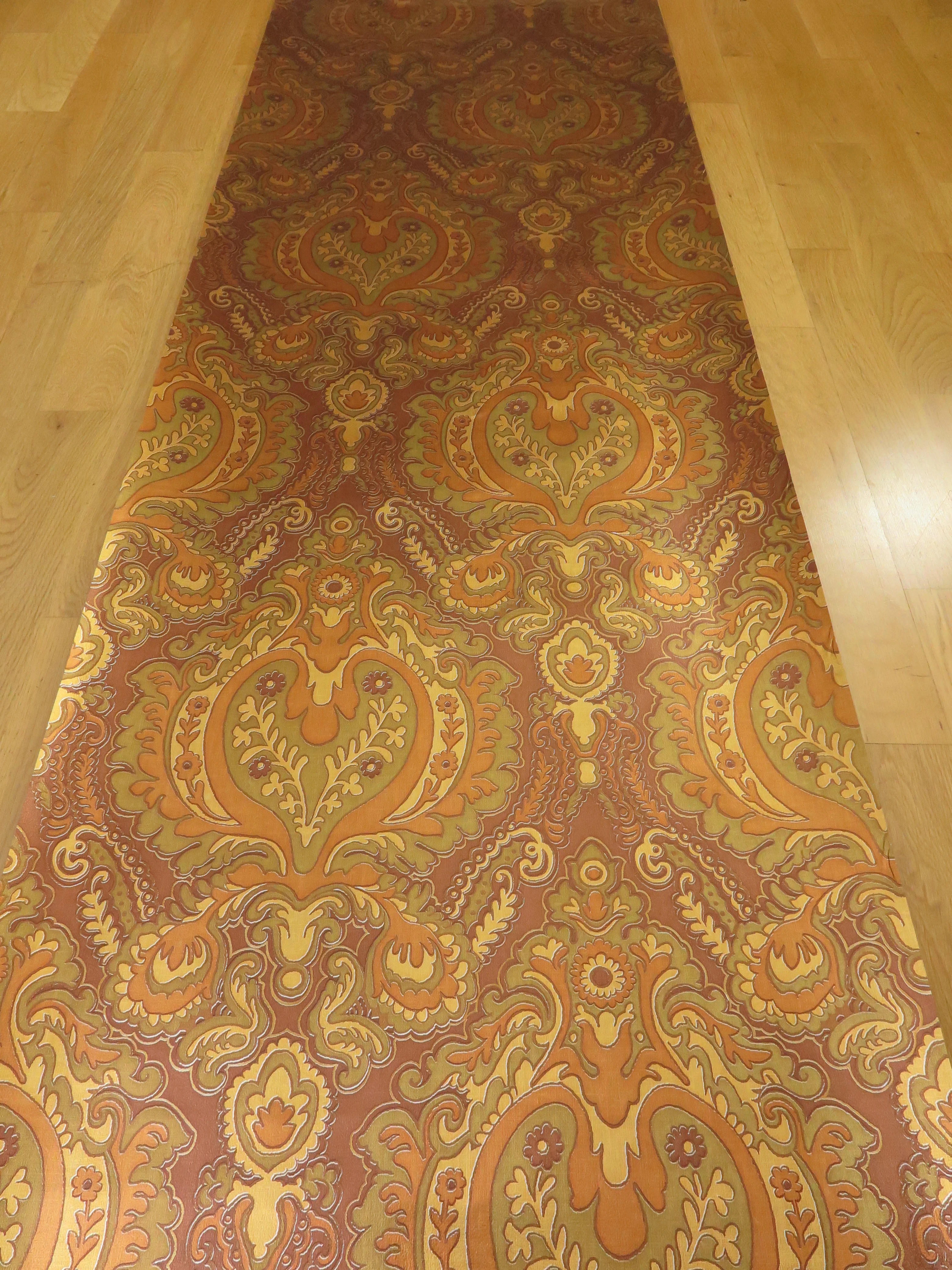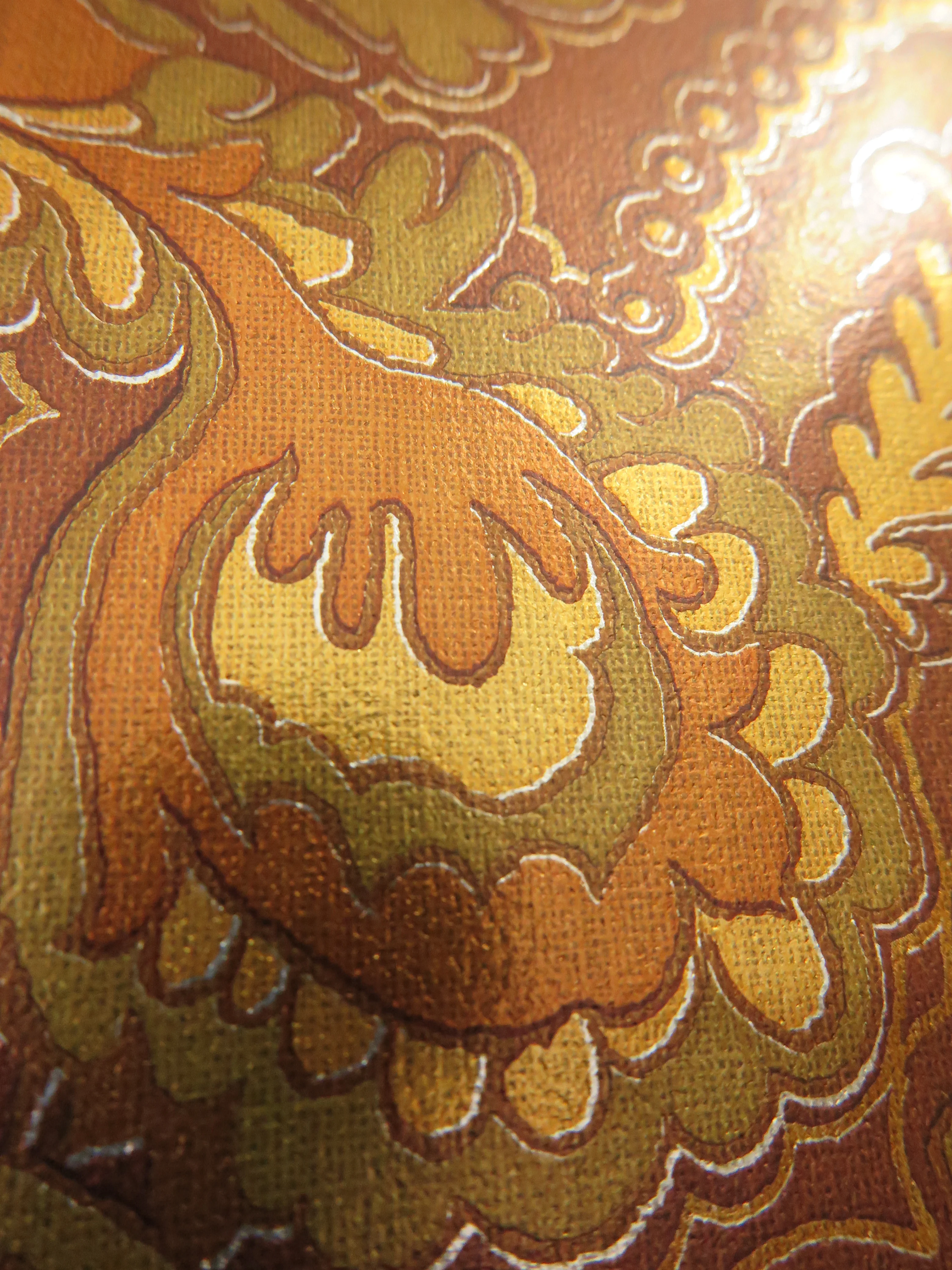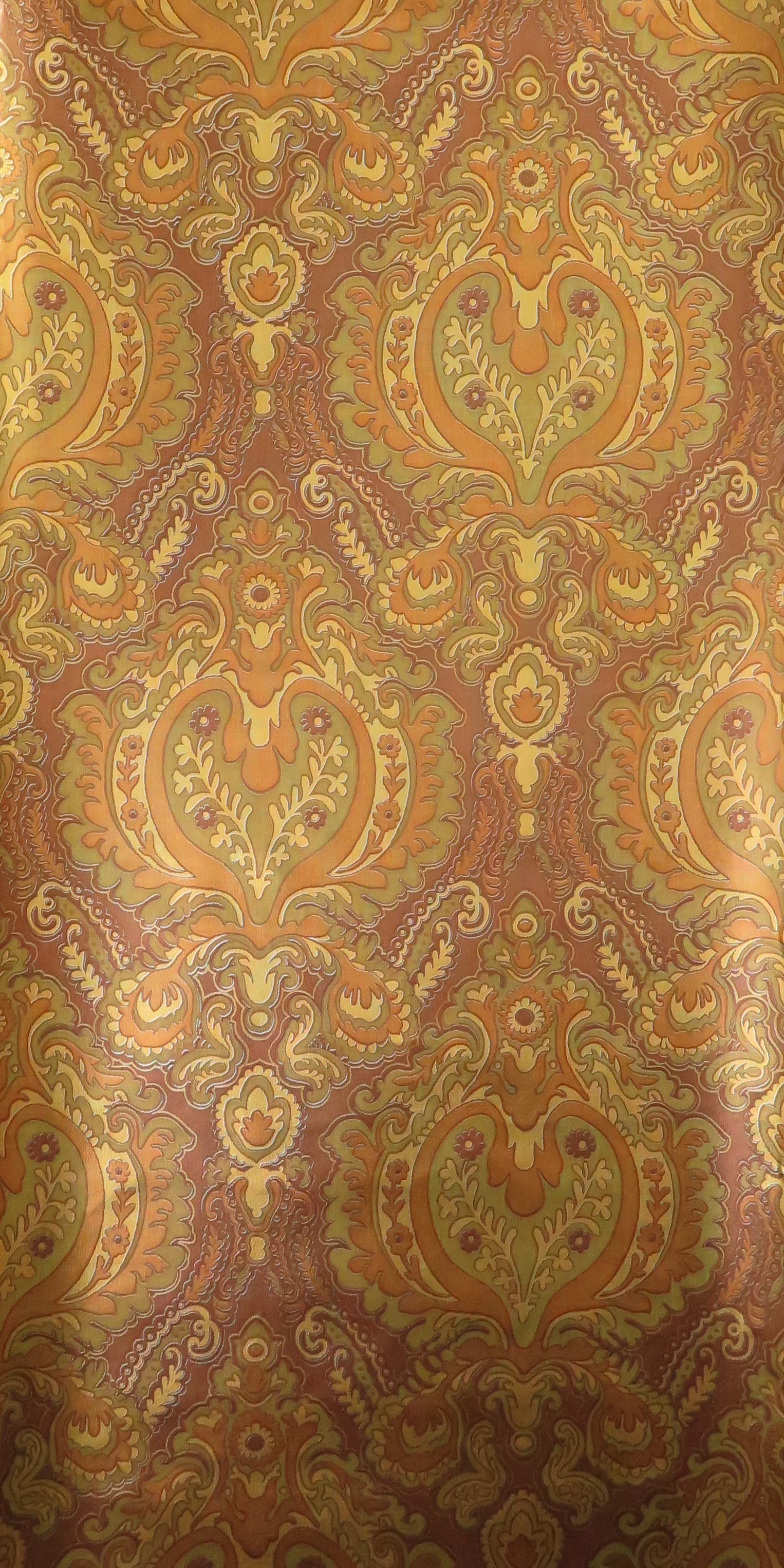 The wallpaper is made of high-quality paper with a glossy surface and features an intricate pattern of warm gold and orange tones.