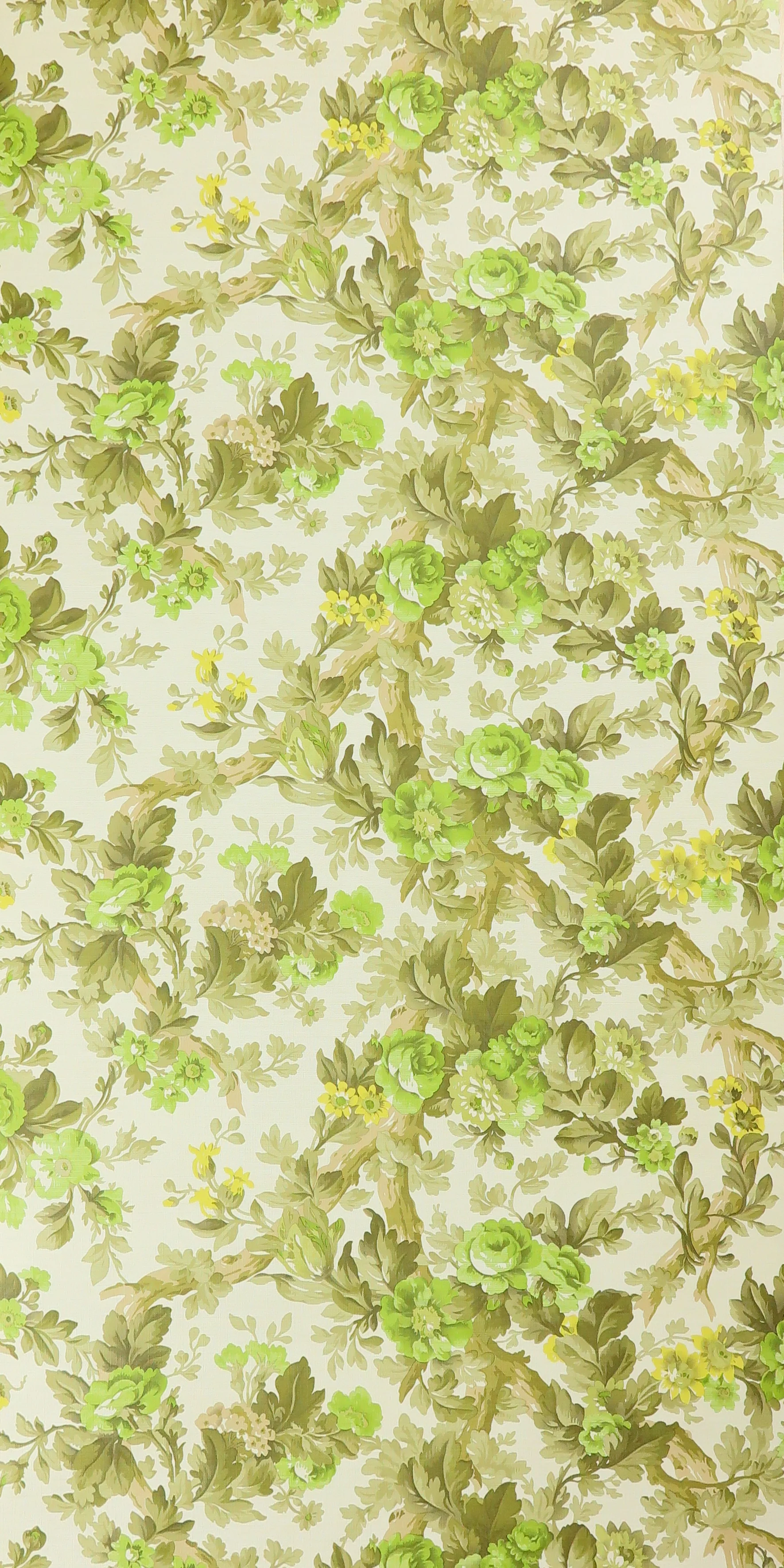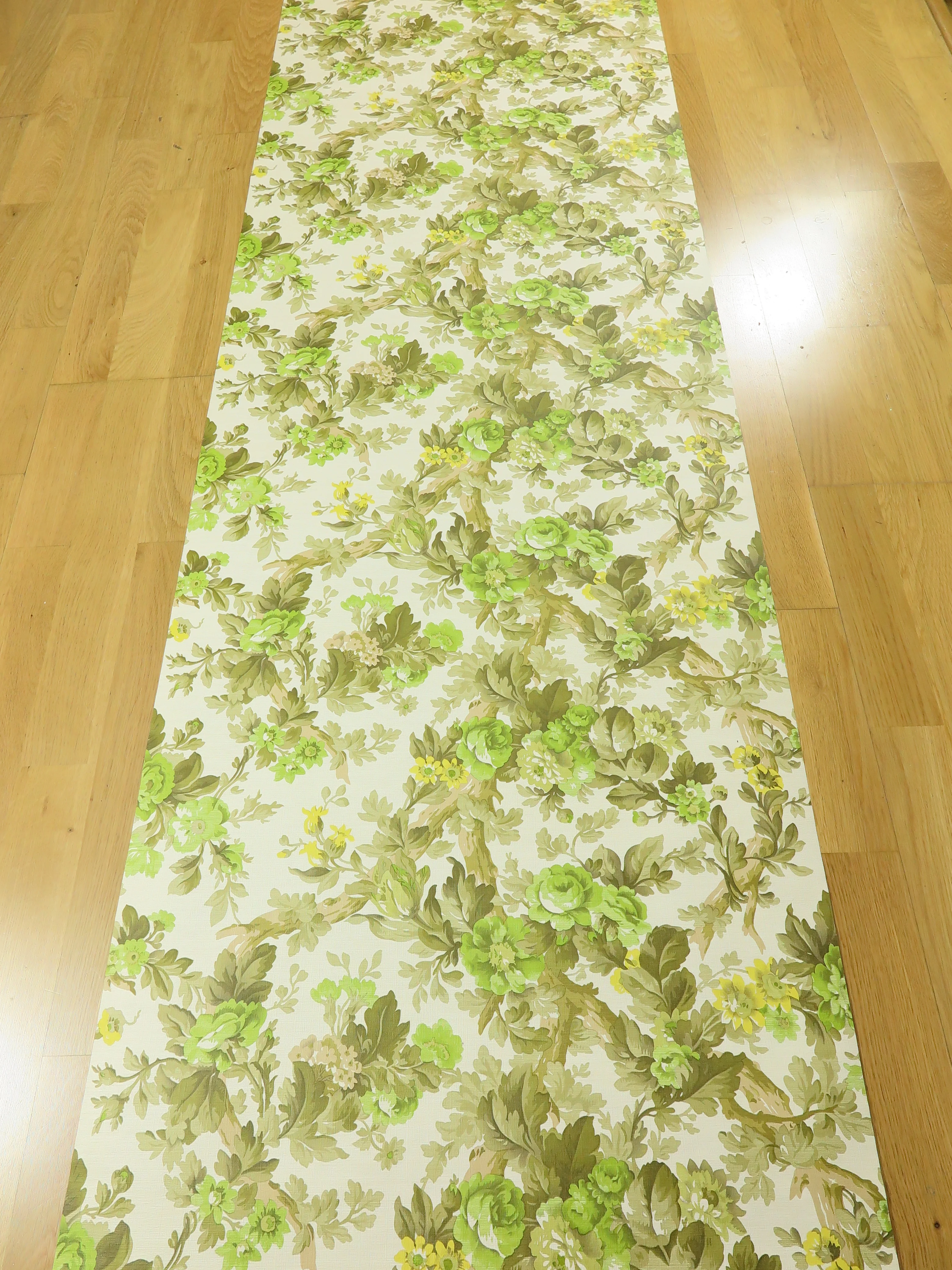 The finely embossed floral wallpaper is discreetly shiny and the floral pattern runs generously across the wallpaper.