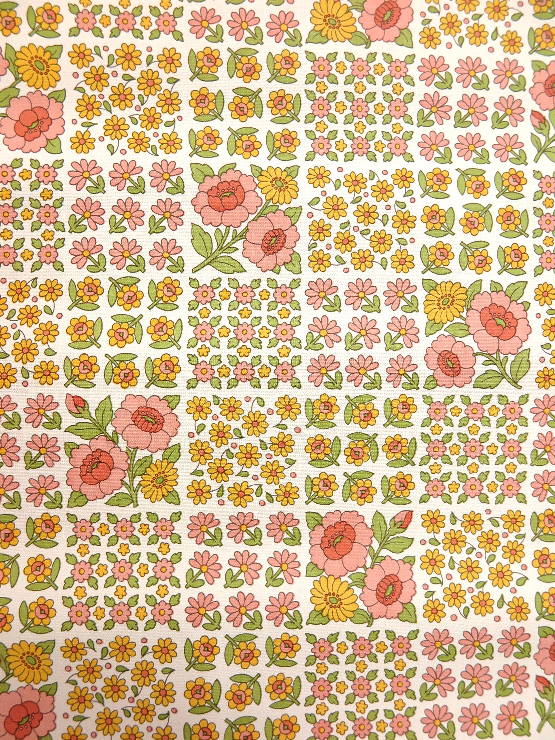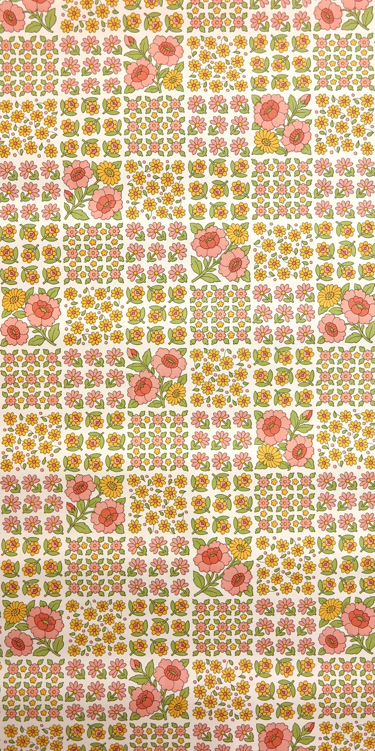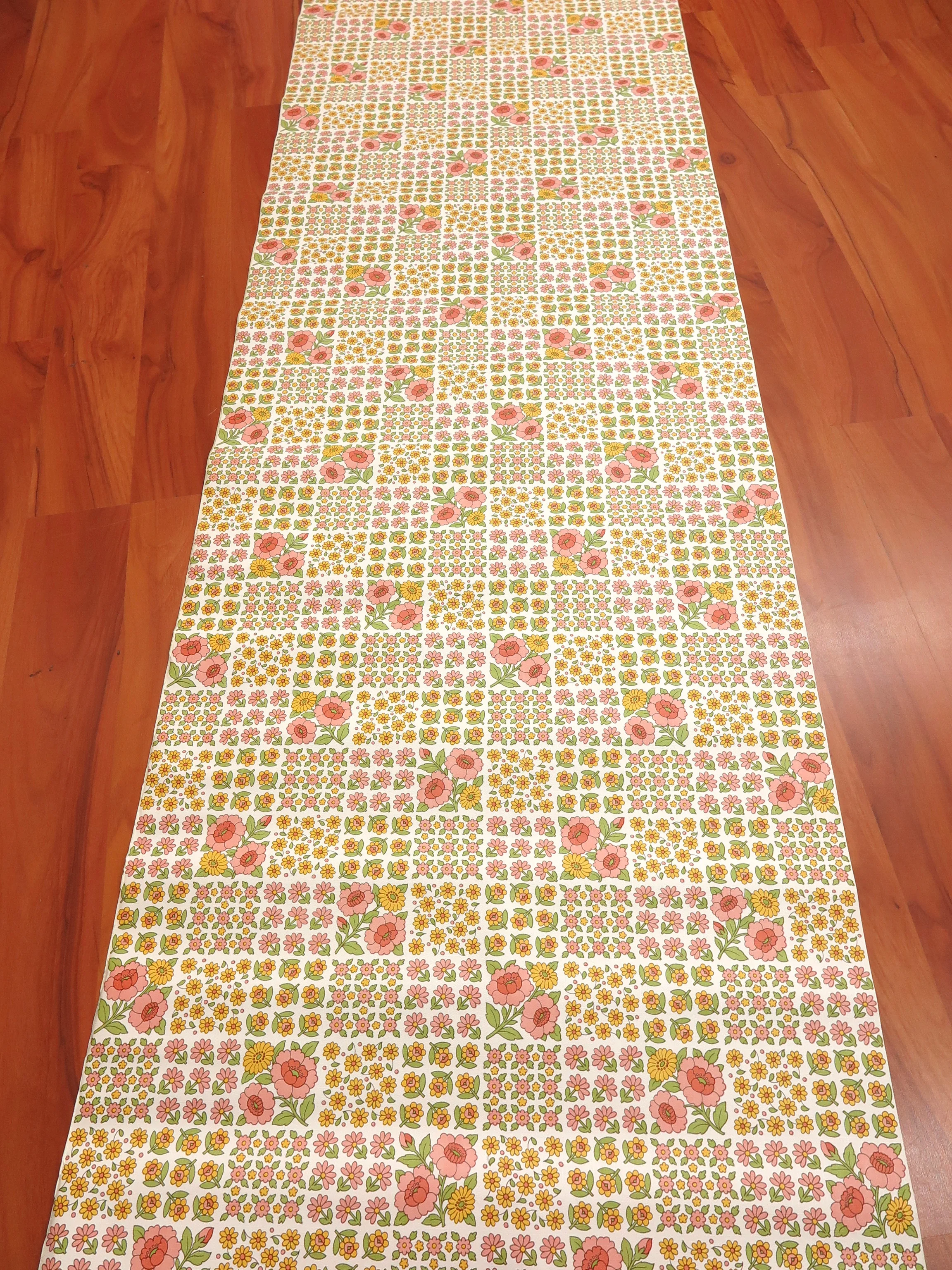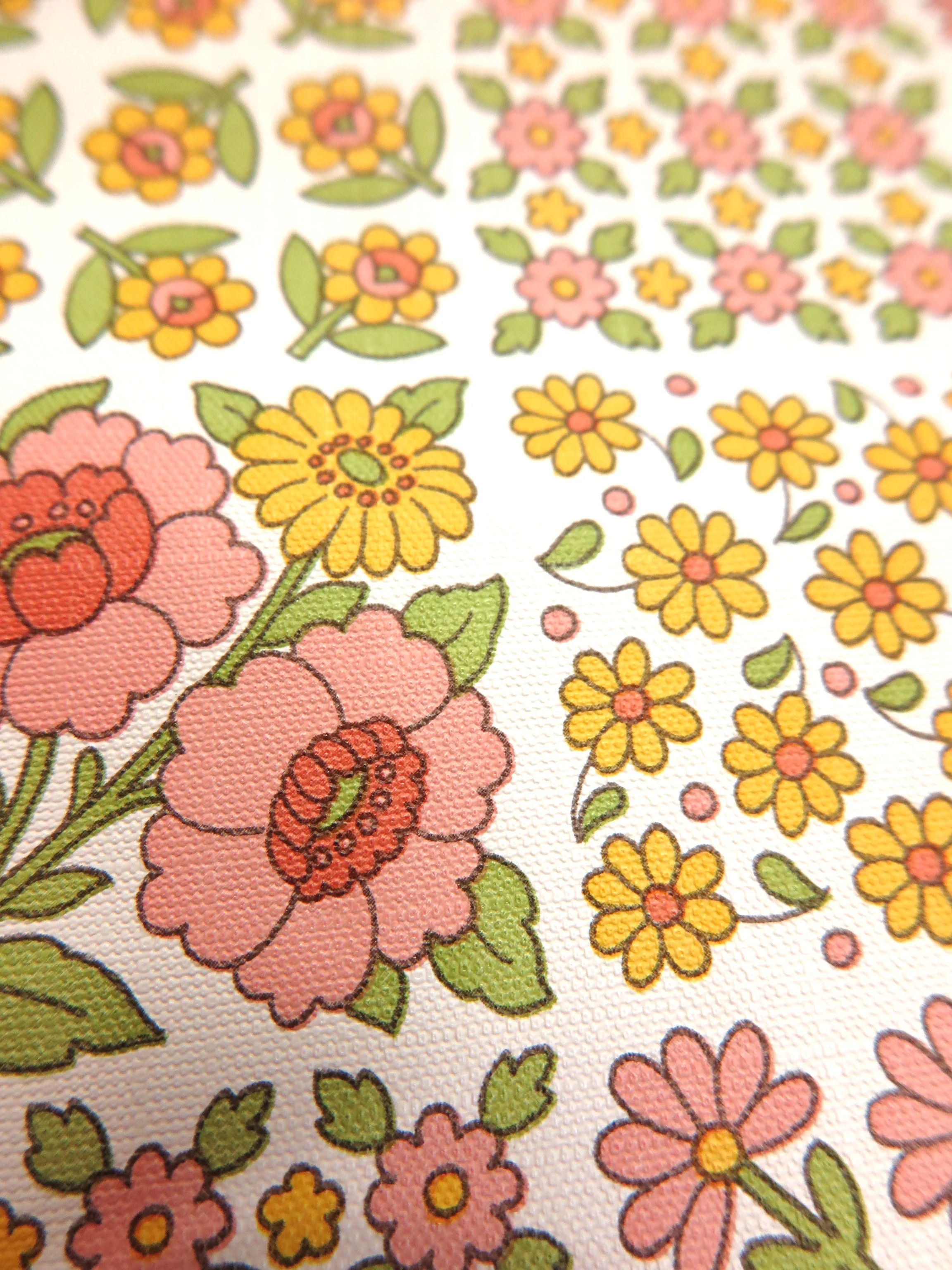 Rare original 70s wallpaper in pink, yellow and green on white background