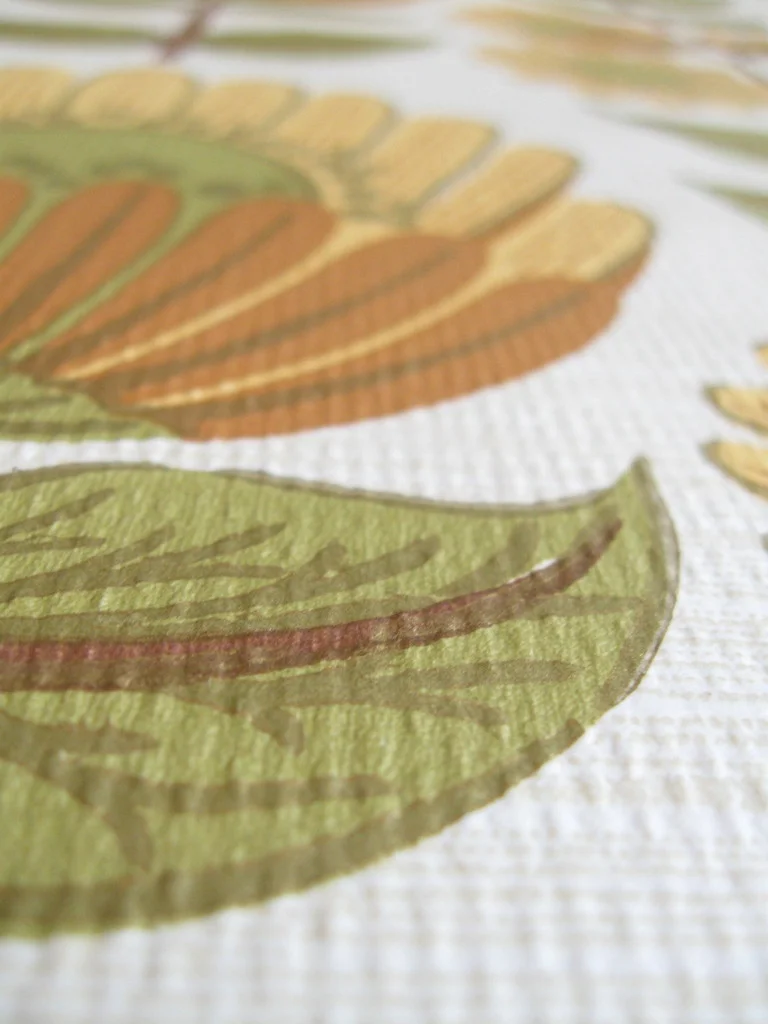 The beautiful, large flower motif with its warm, natural colours creates a mood. The contours are drawn with a gold tone and produce a slight shimmer