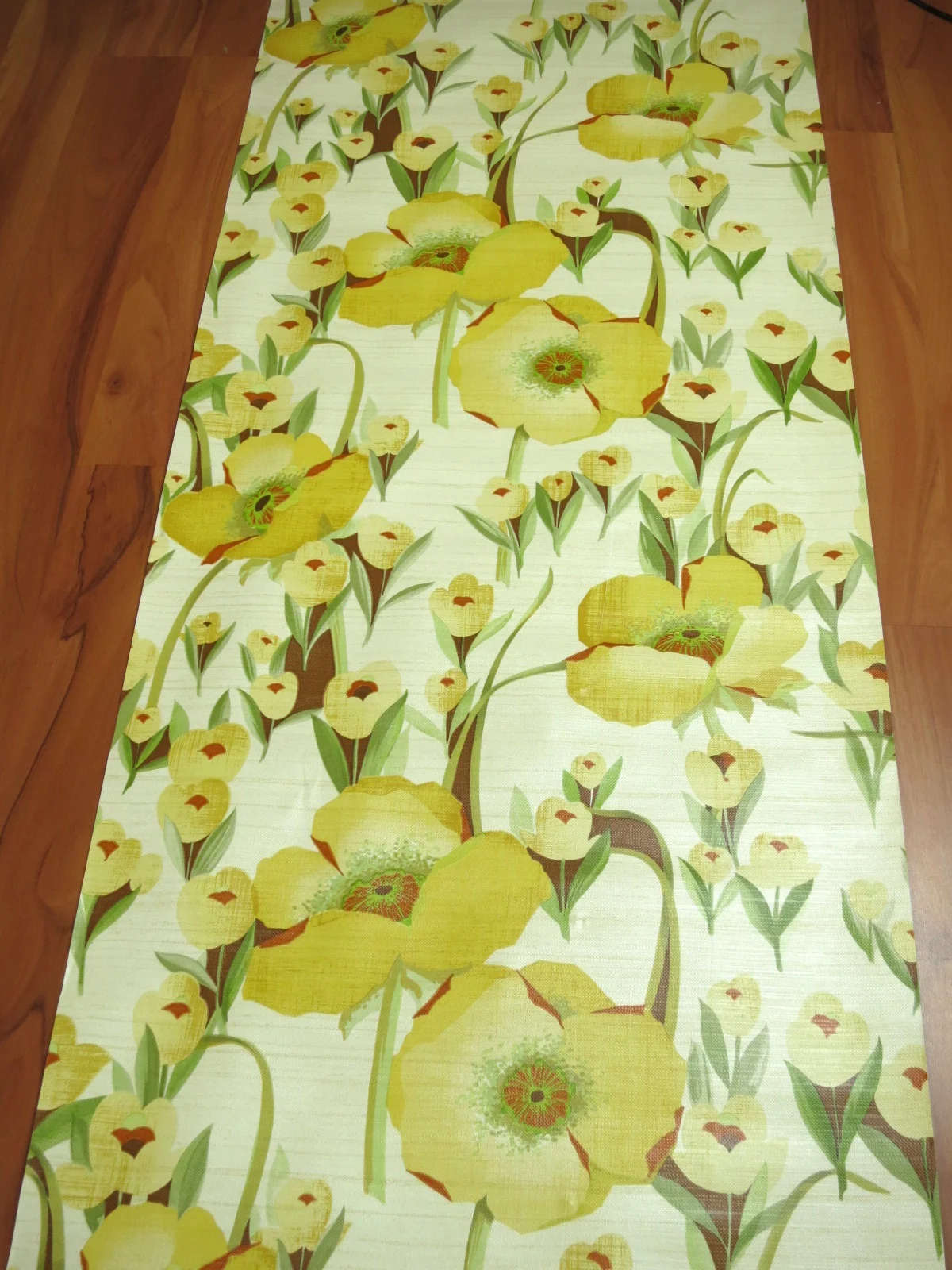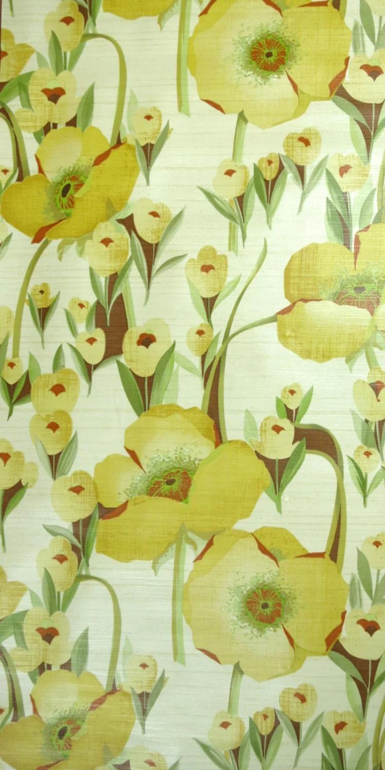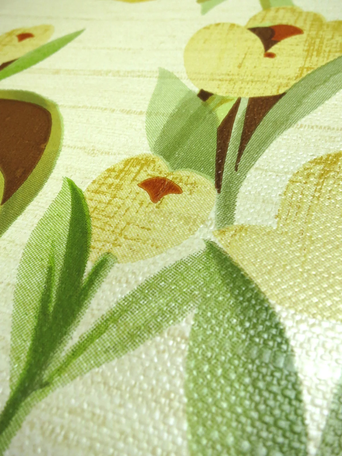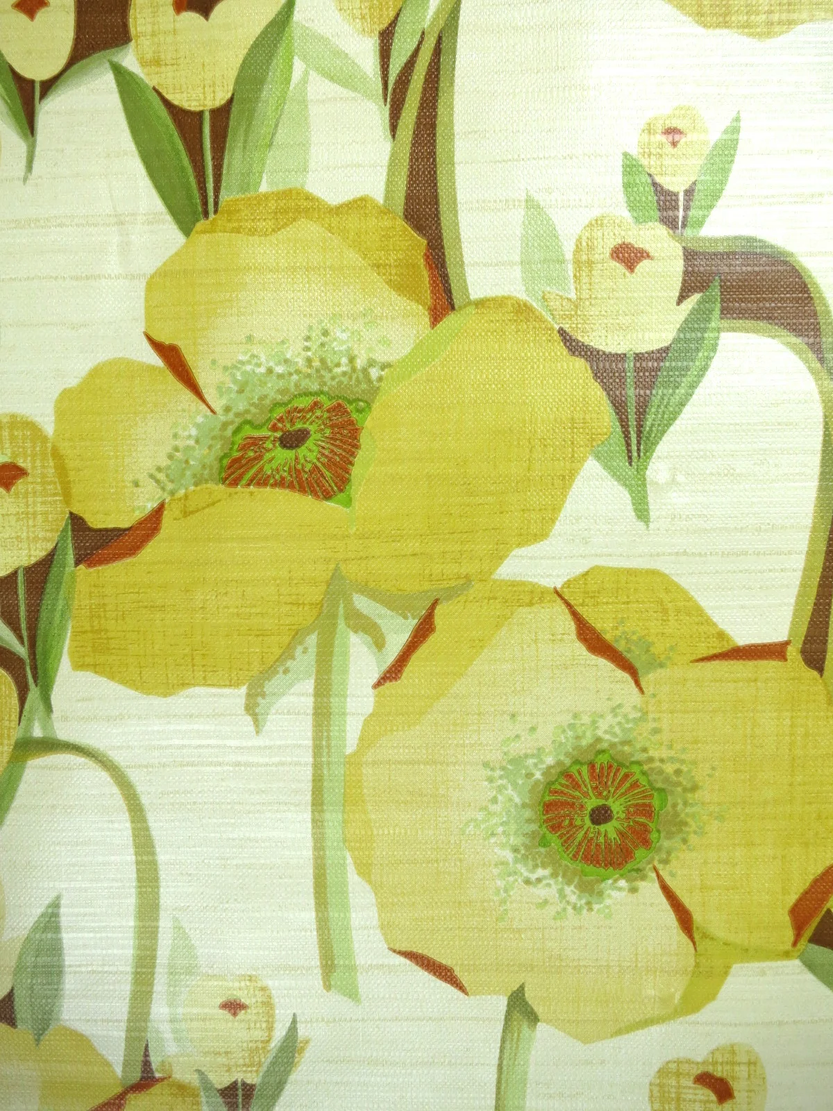 Tasteful original 70's wallpaper with beautiful large flowers in discreet green, brown and ochre