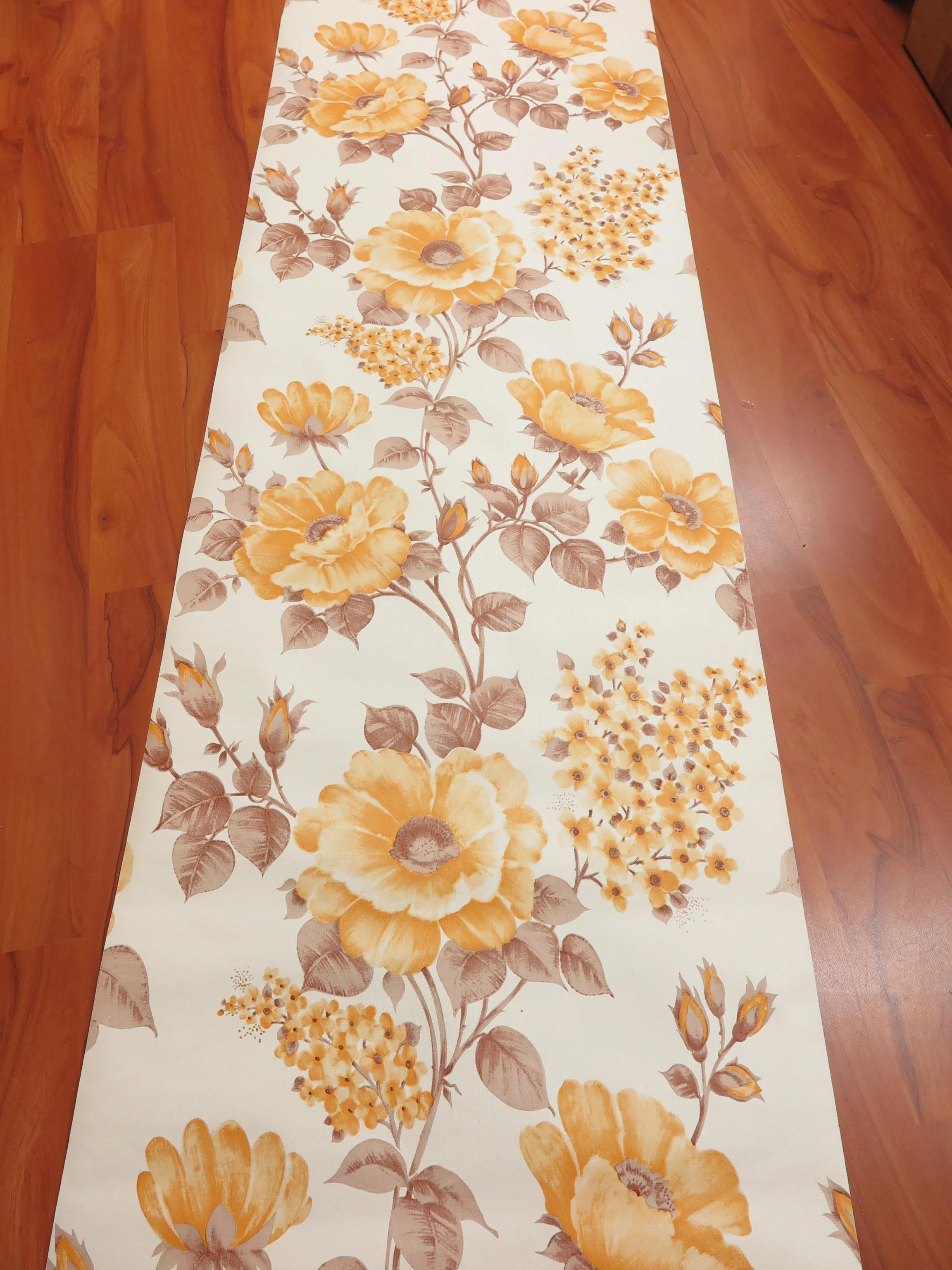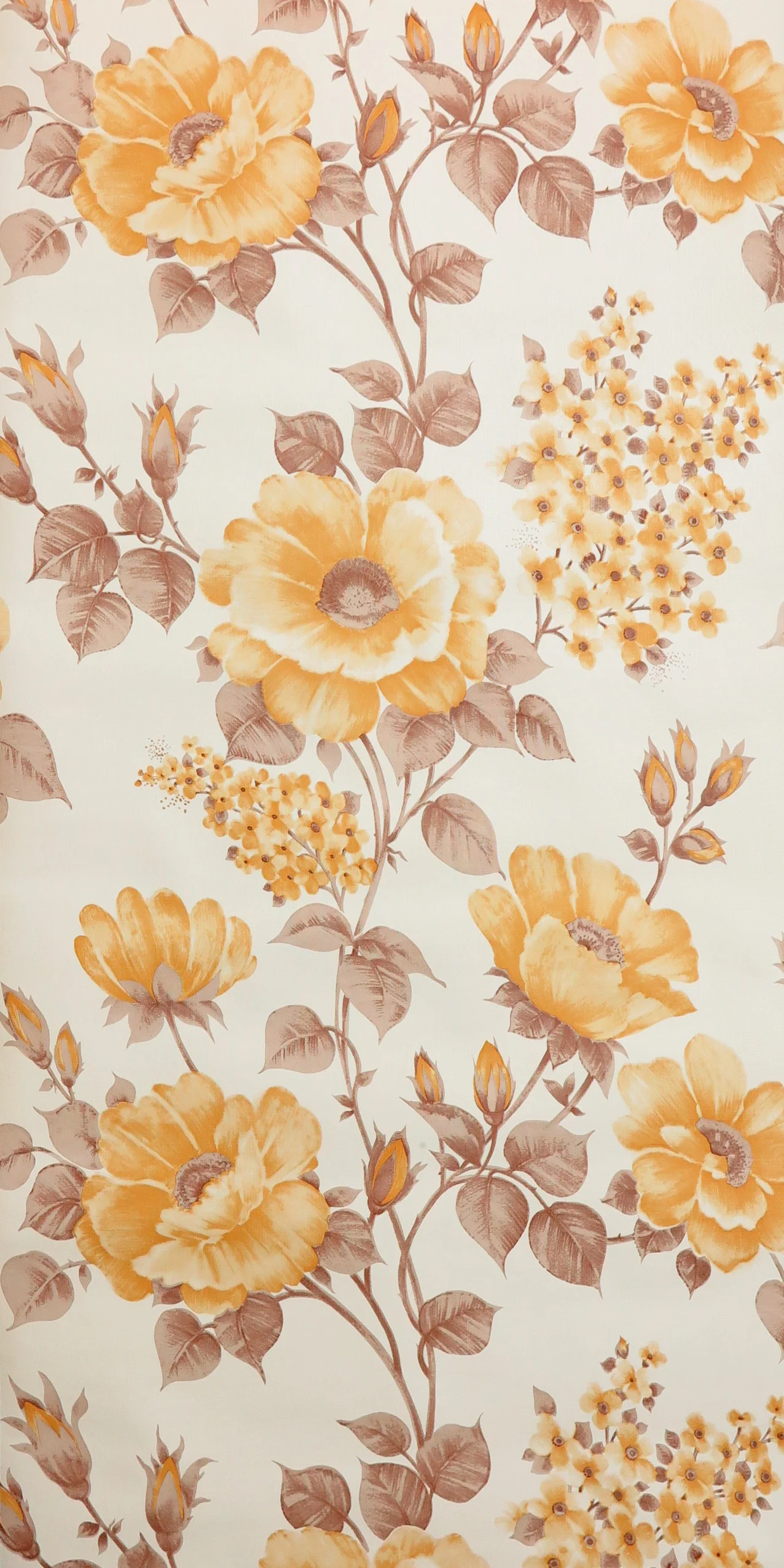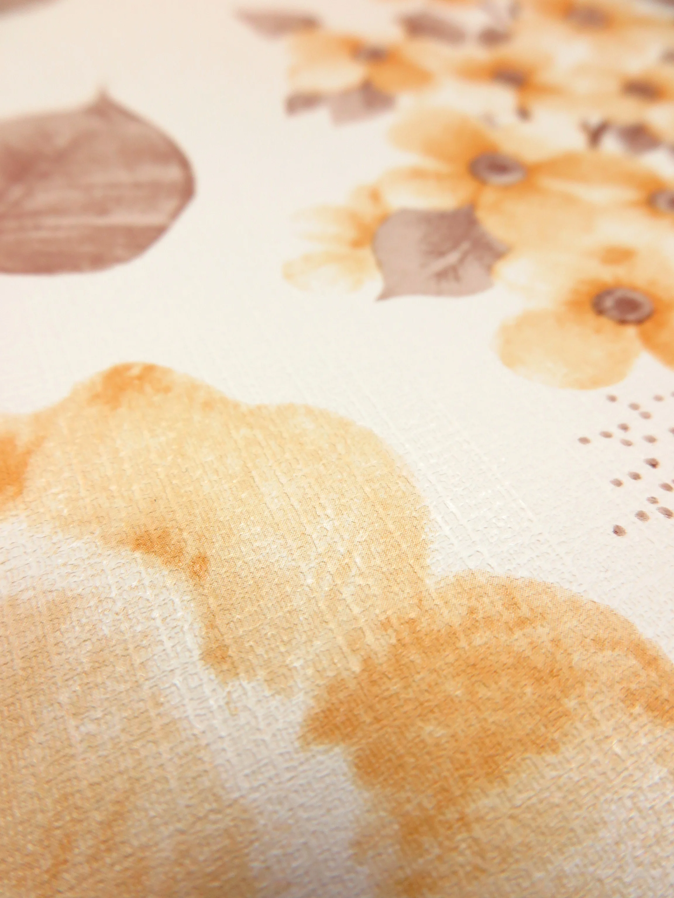 This floral wallpaper is kept in warm orange-brown and brown tones.